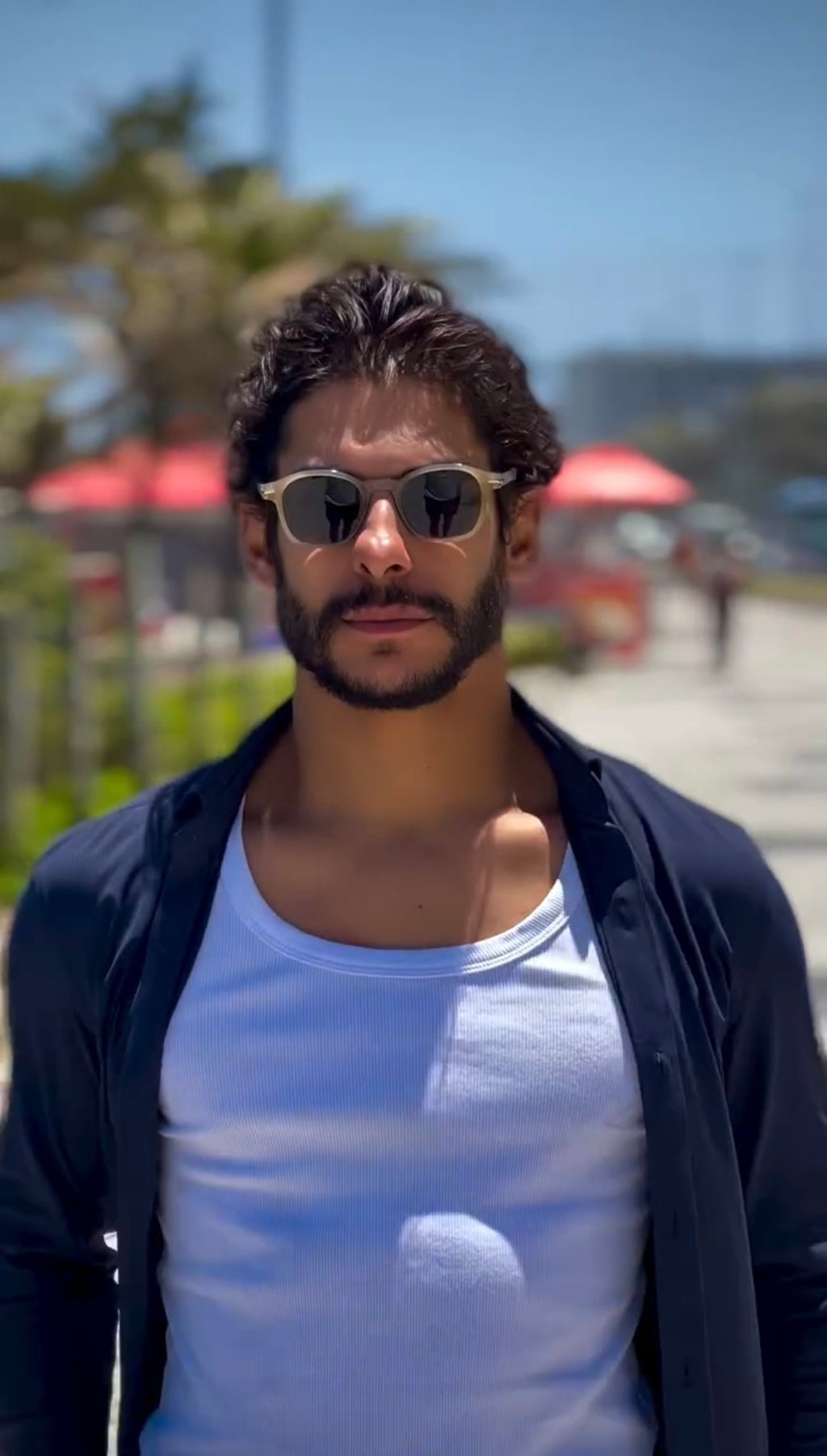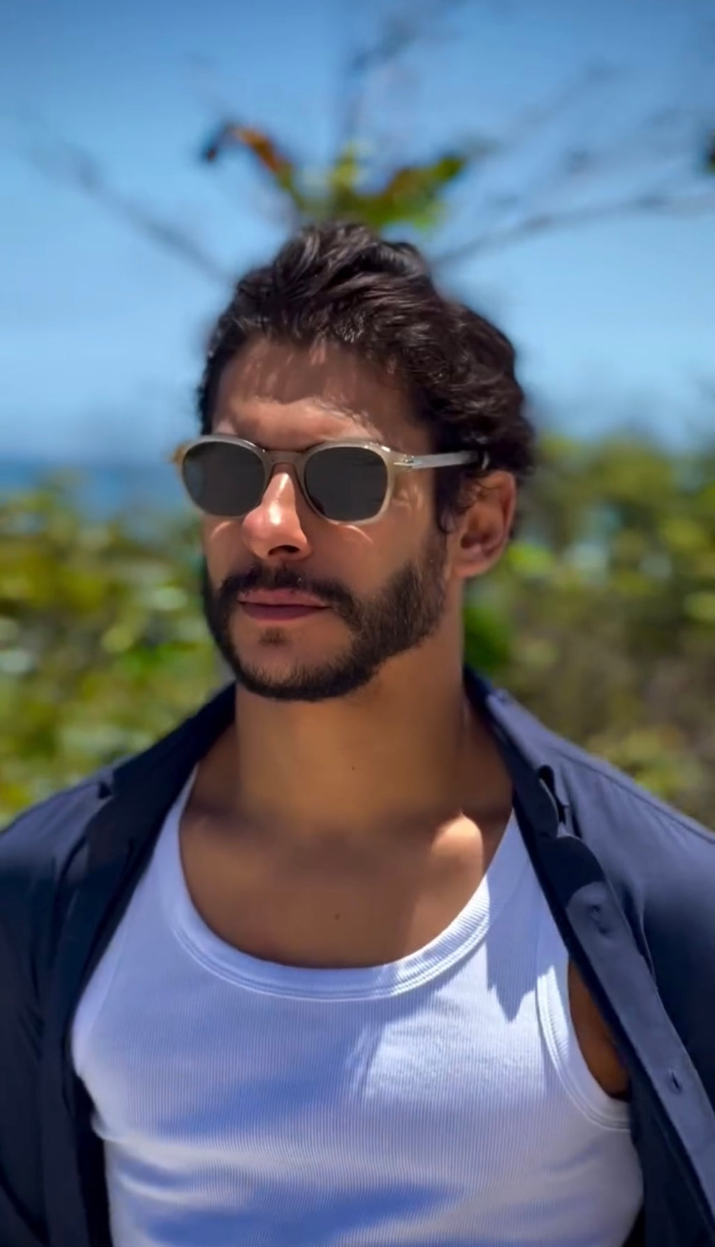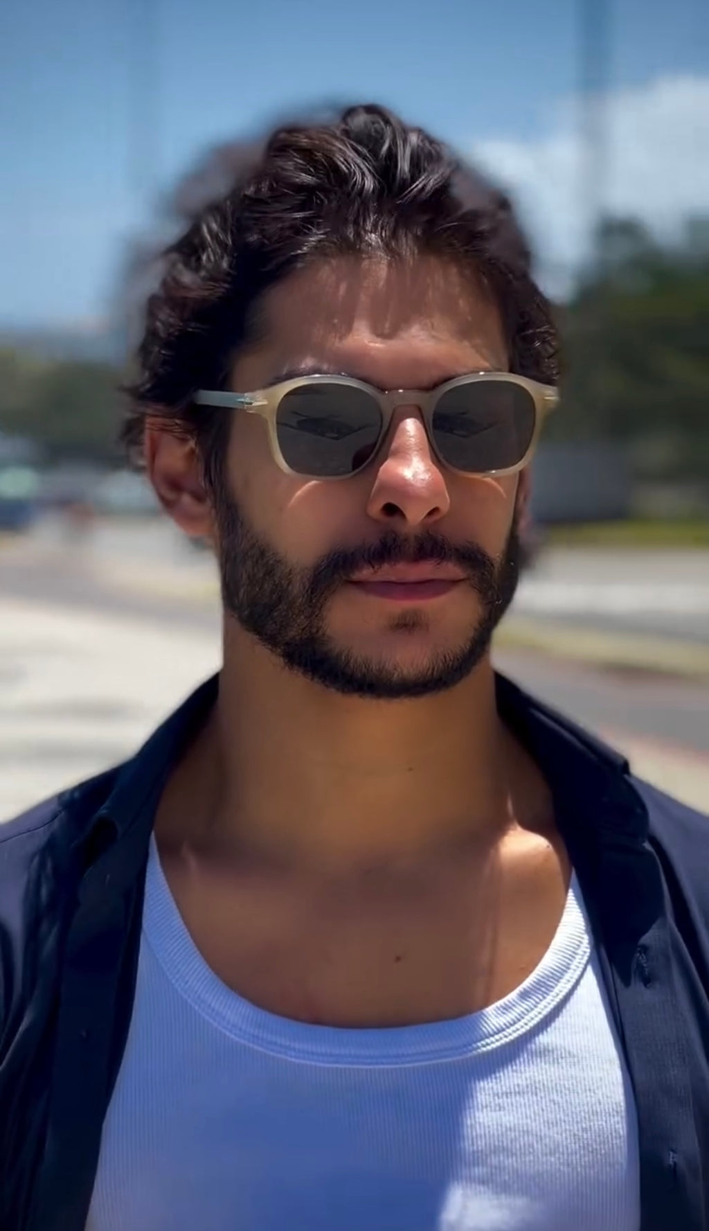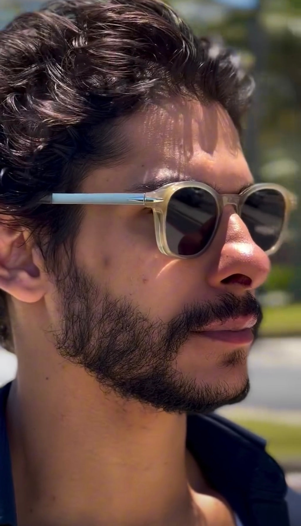 Óculos com hastes em metal fosco, frente em acetato âmbar translúcido com lente preta.