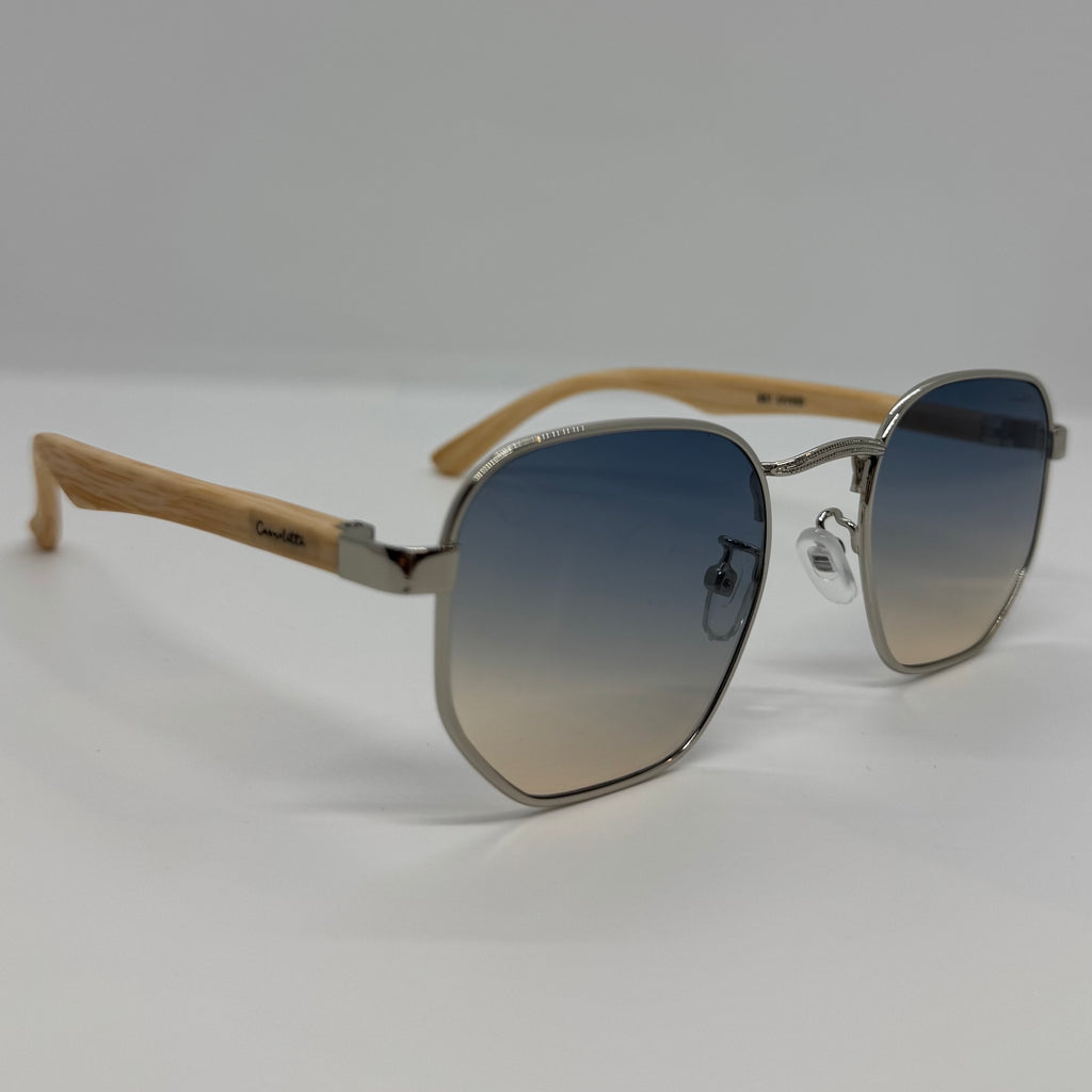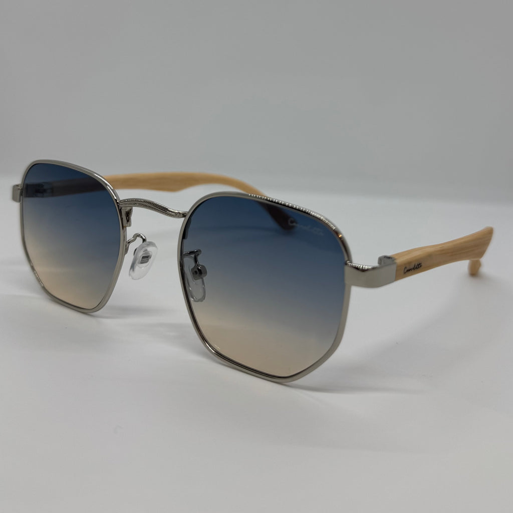Óculos com hastes em bambu, frete em metal prata e lente azul degrade esverdeado.