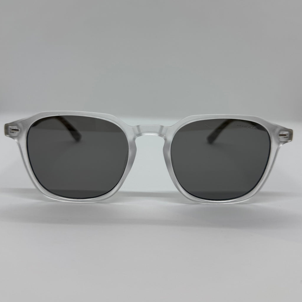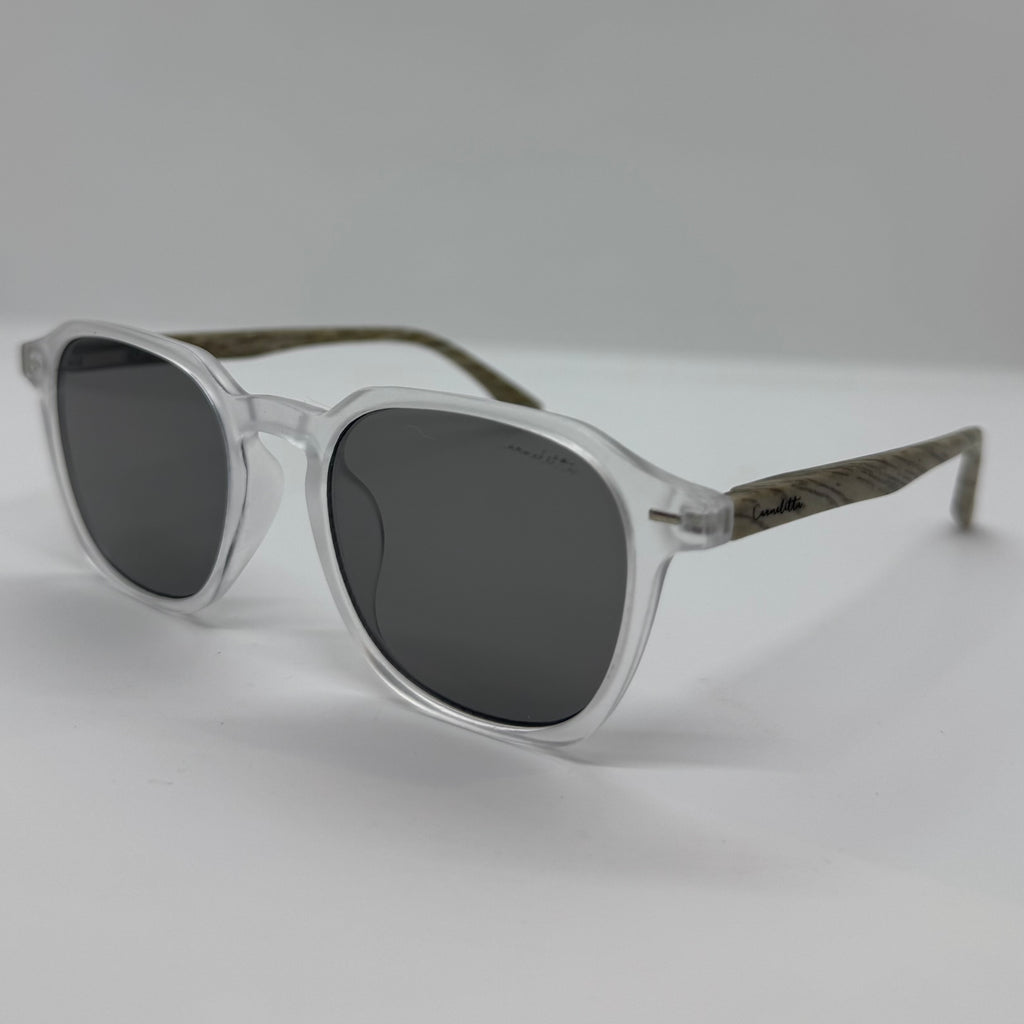 Óculos com hastes de bambu com frente em acetato gelo fosco e lente preta.