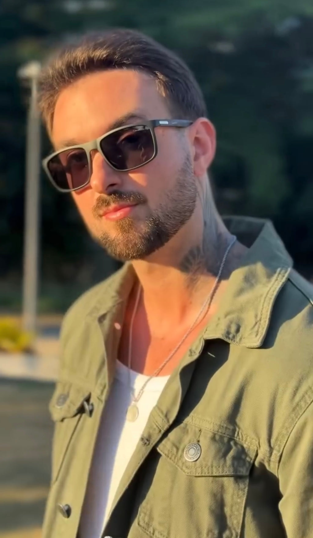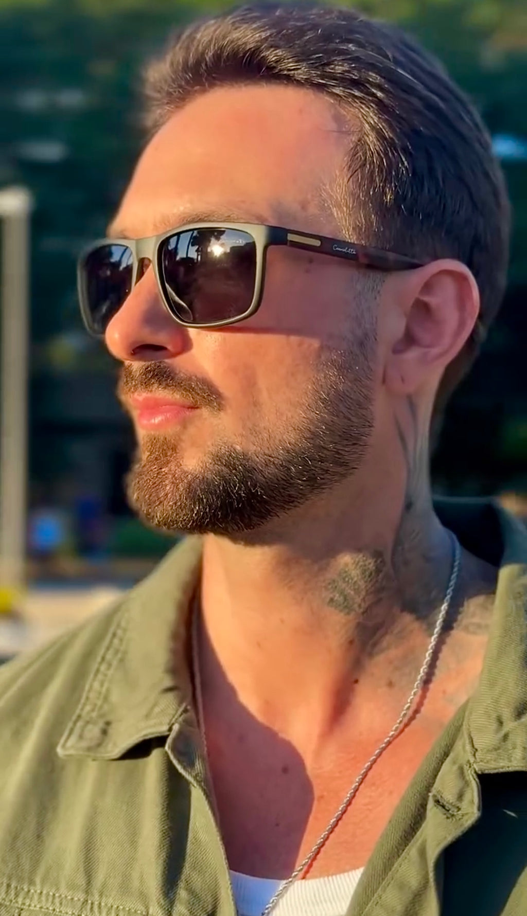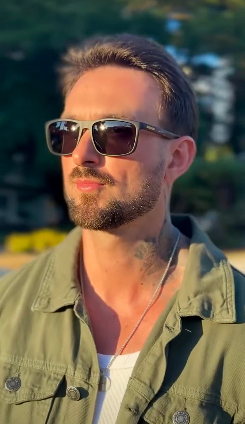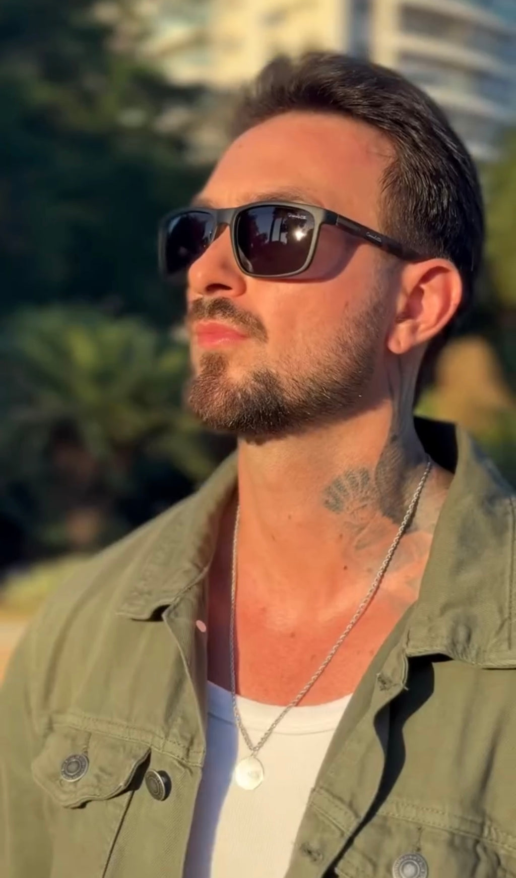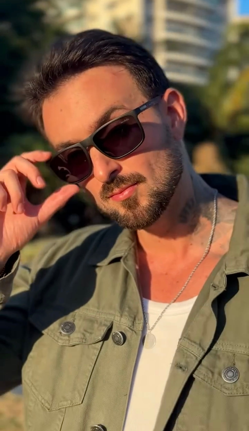 Óculos com hastes em acetato tartaruga, frente em preto fosco e lente preta polarizada.