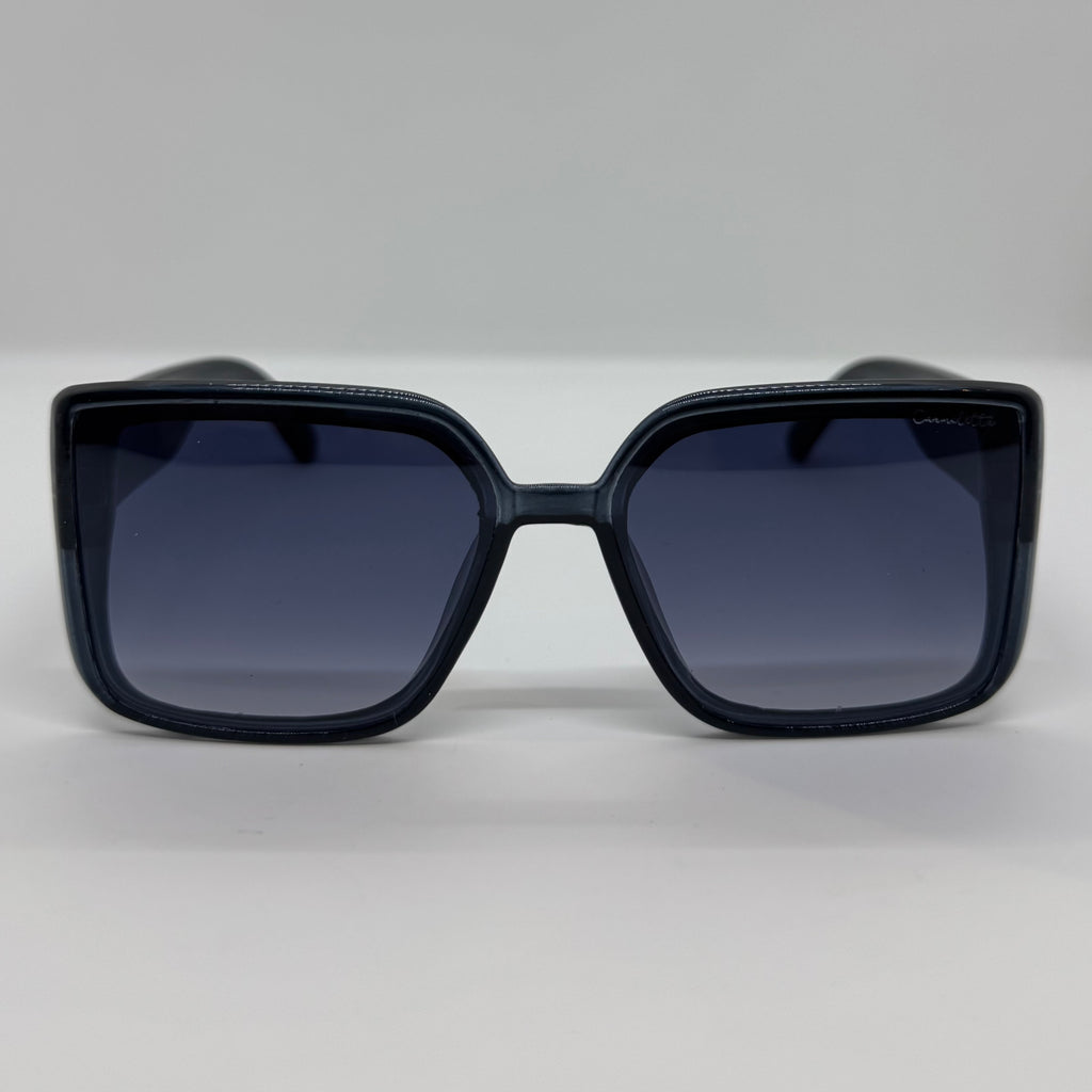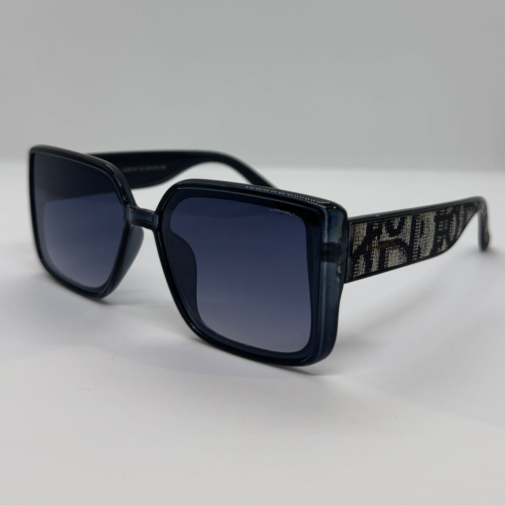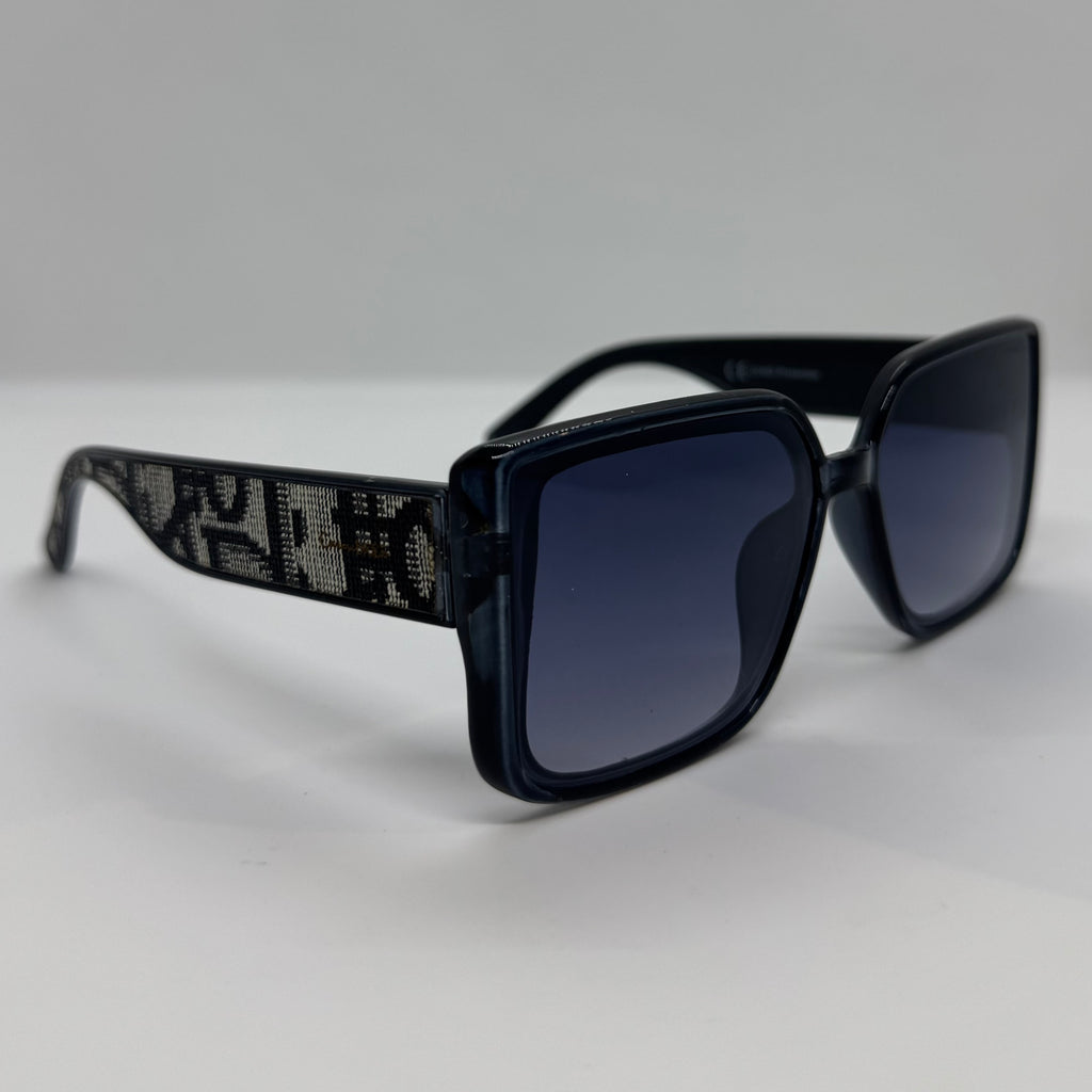 Óculos com hastes com desenhos, frente e acetato preto com lente roxa degrade.