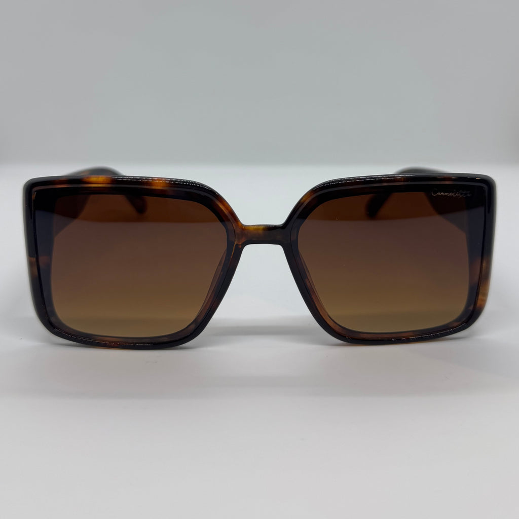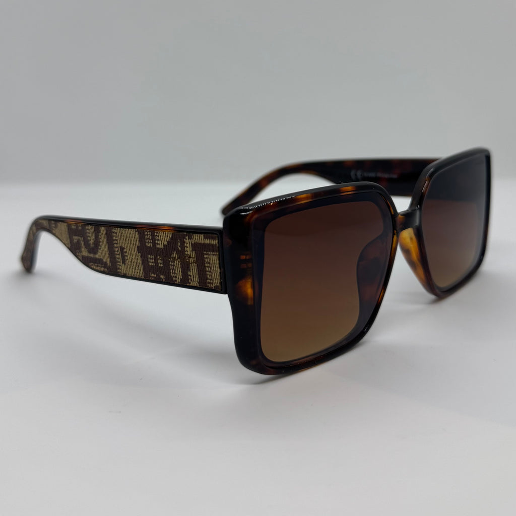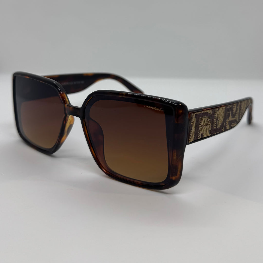 Óculos com hastes com desenhos, frente em acetato tartaruga com lente marrom.