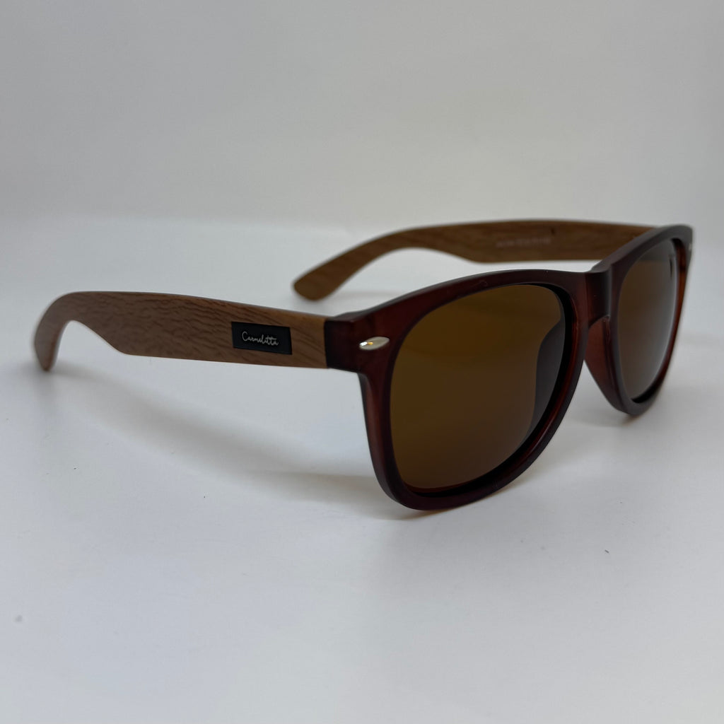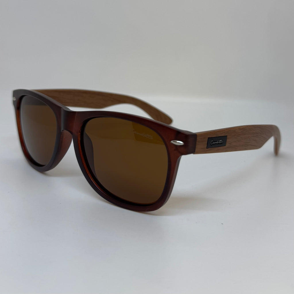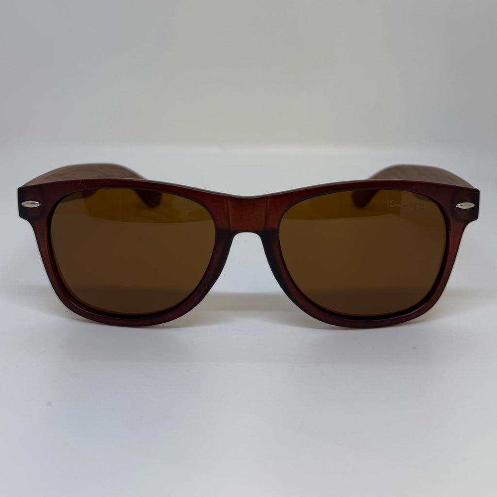 Óculos com hastes em bambu escuro, frente em acetato marrom lente marrom polarizada.
