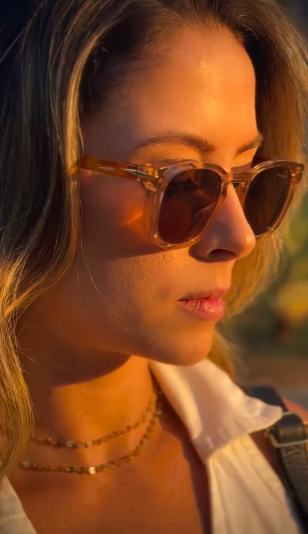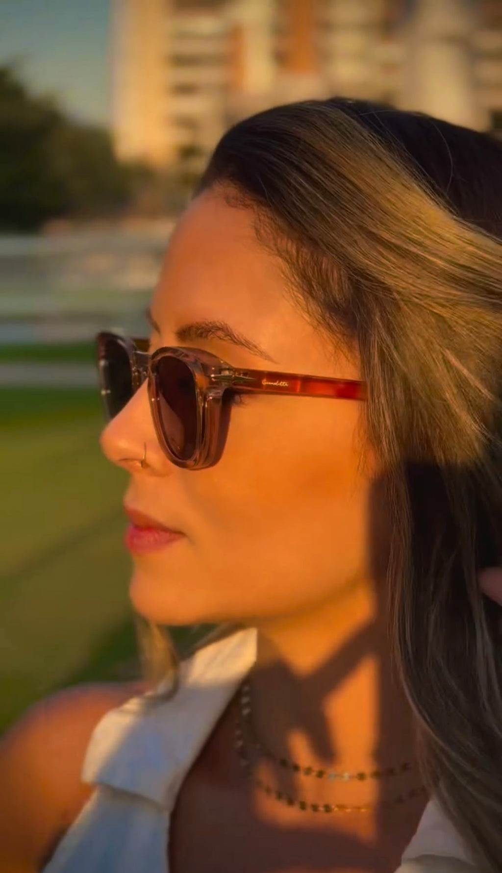 Óculos com hastes em acetato na cor tartaruga, frente rose translúcido e lente marrom.