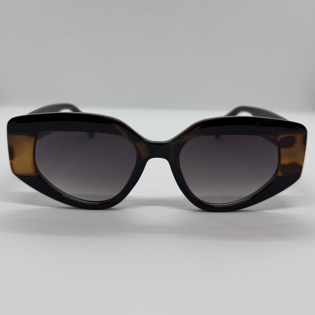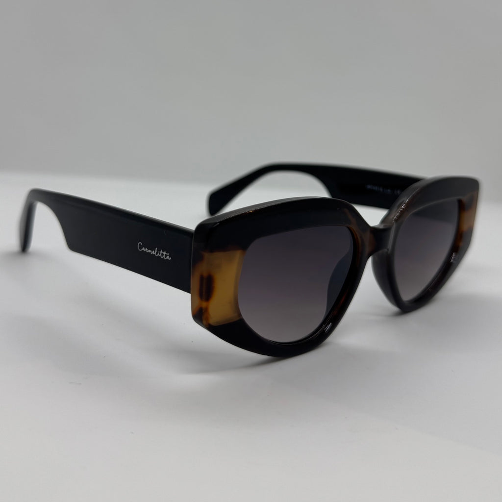 Óculos com hastes em acetato preto com a parte da frente em detalhes caramelo mesclado e lente roxa degrade.