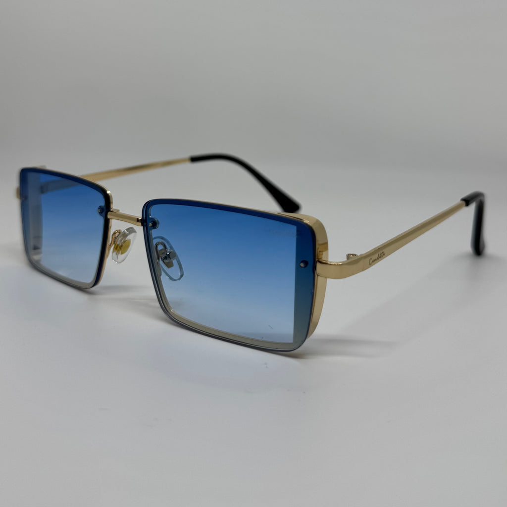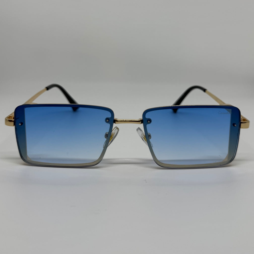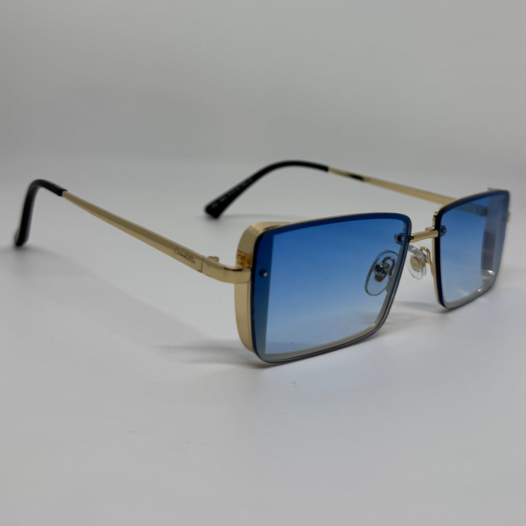Óculos com hastes em metal difusor com lente azul.