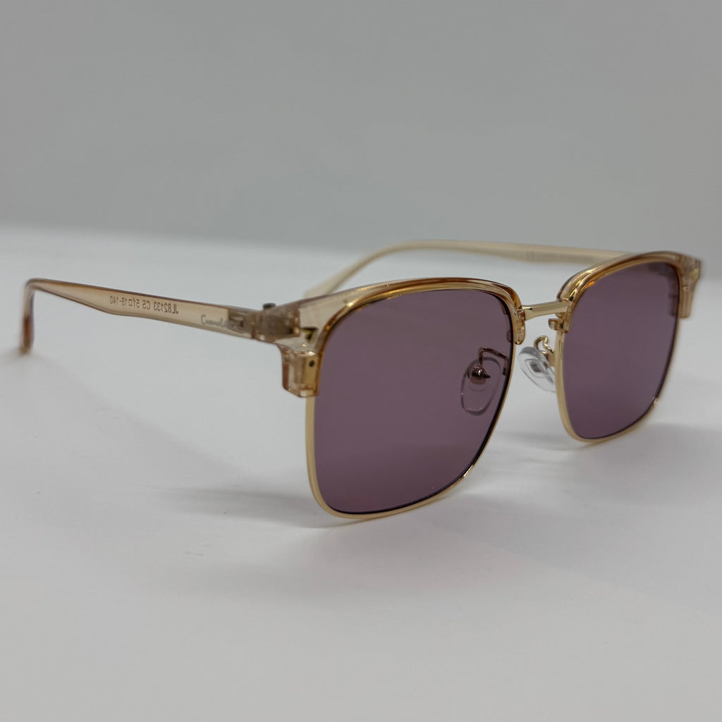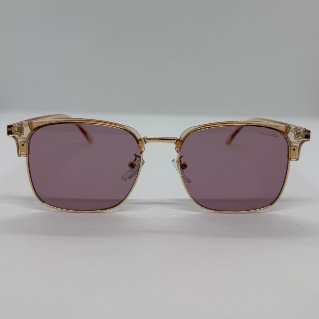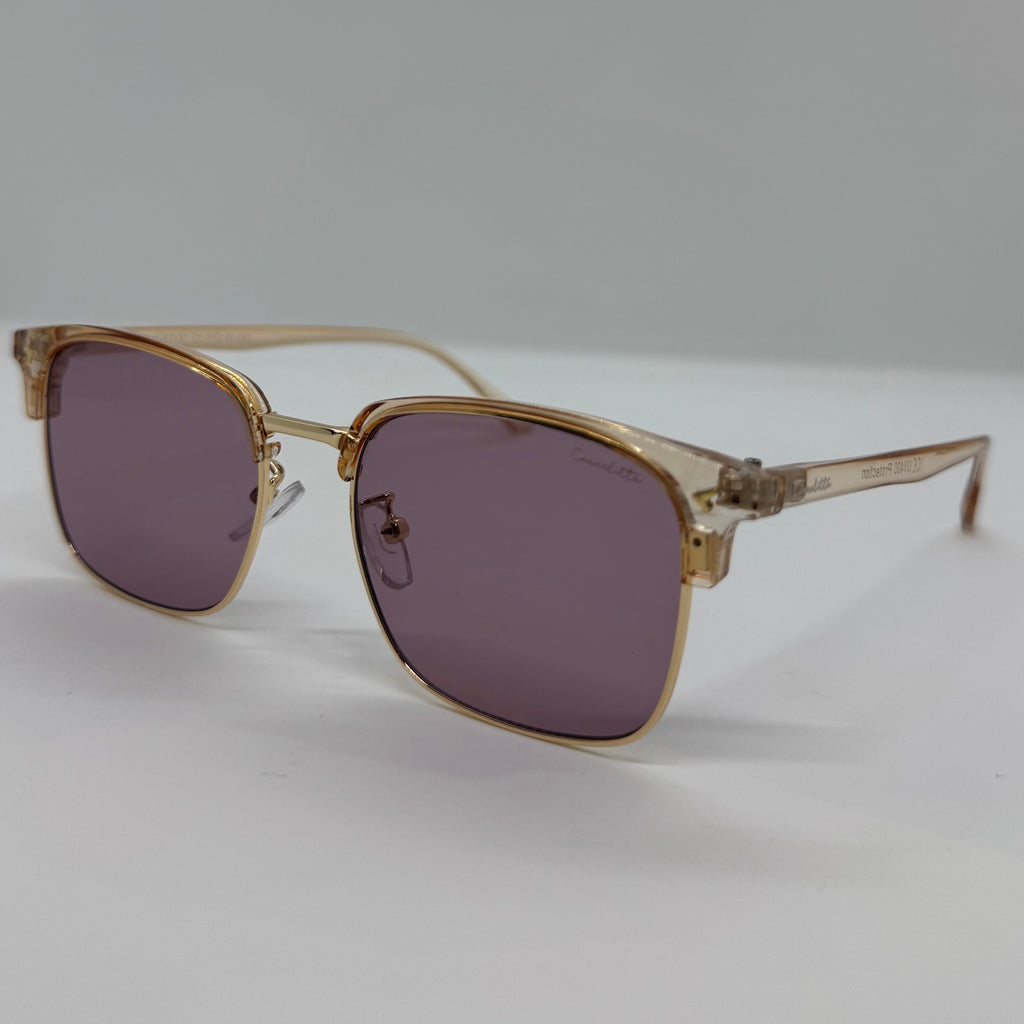 Óculos com hastes em acetato rose translúcido com lente roxa.