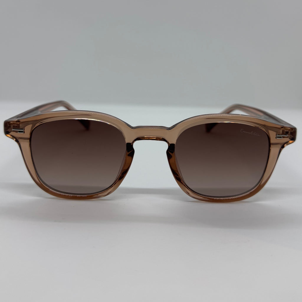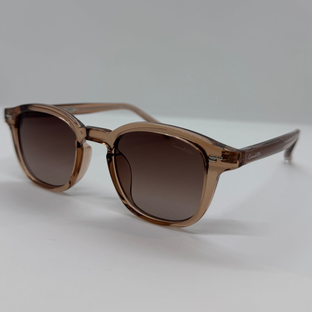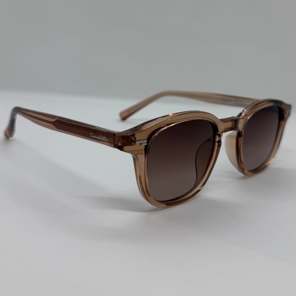Óculos com hastes em acetato rose translúcido com lente marrom degrade.