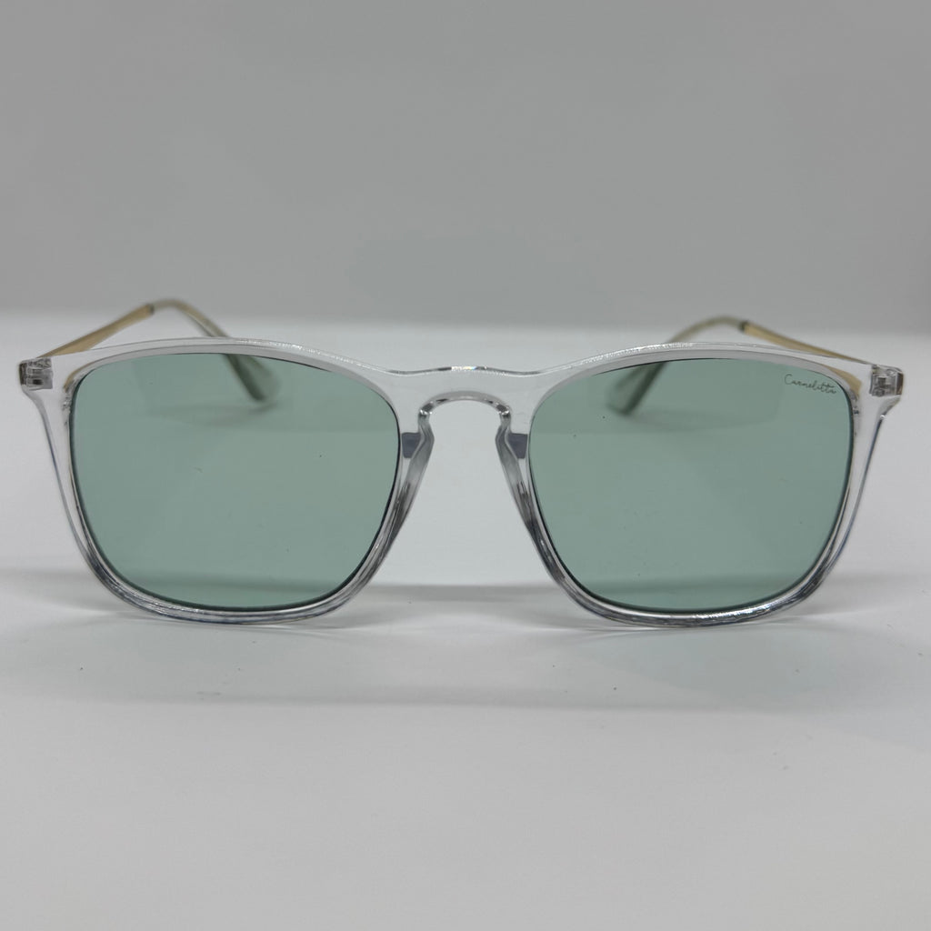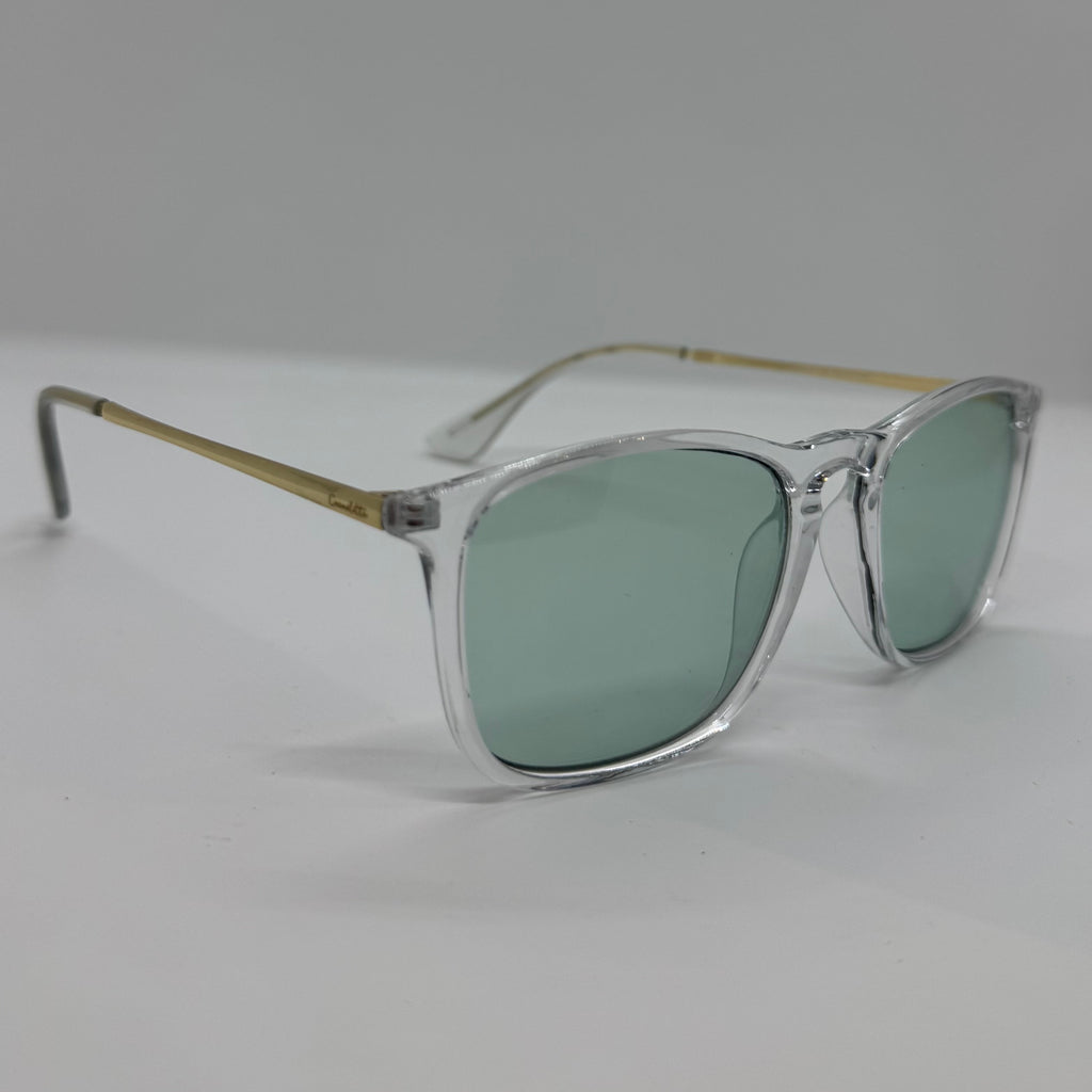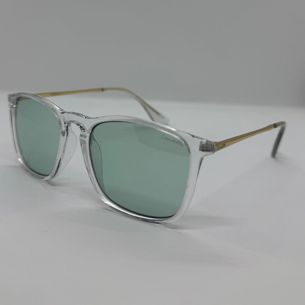 Óculos com hastes em metal, frente em acetato transparente com lente verde.
