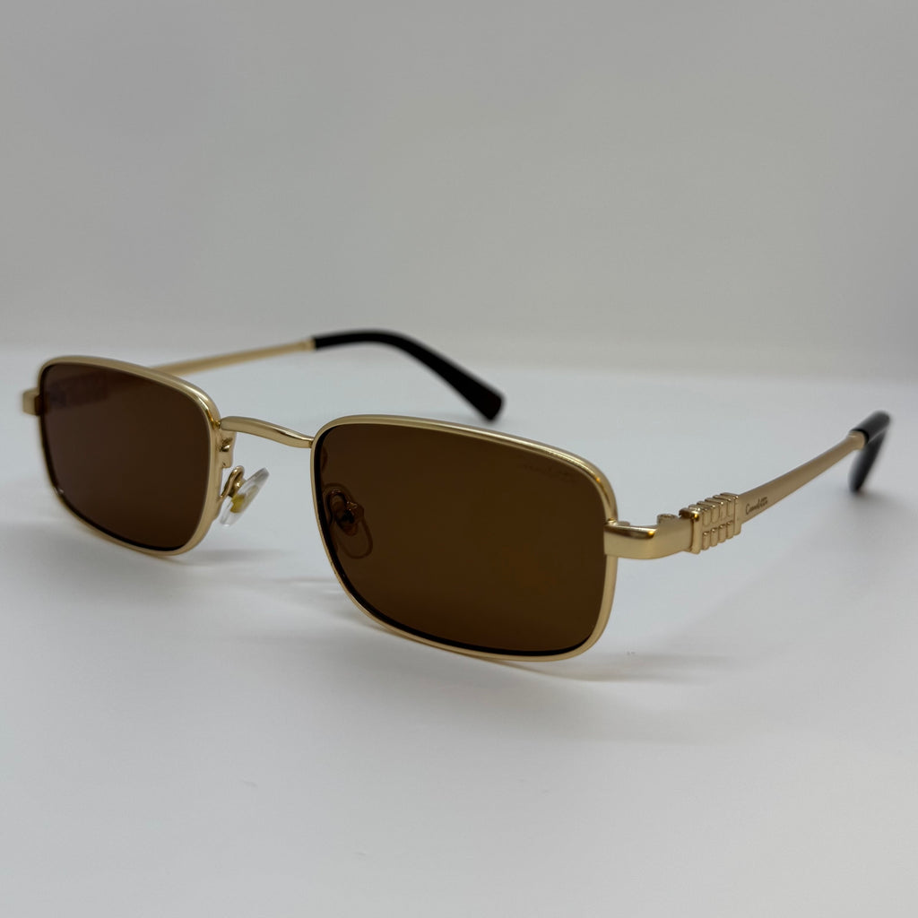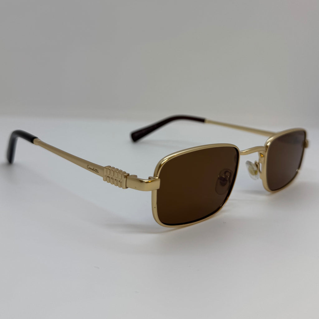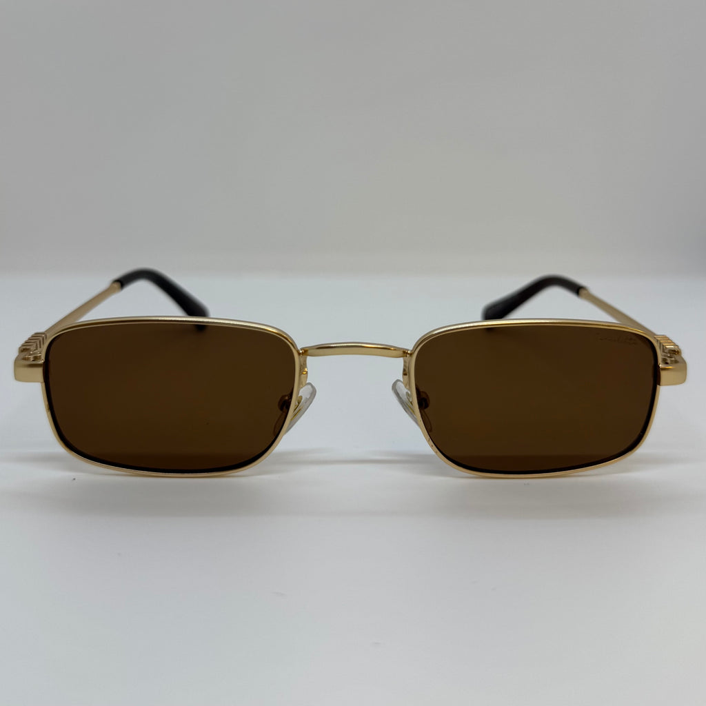 Óculos com hastes em metal dourado com lente marrom.