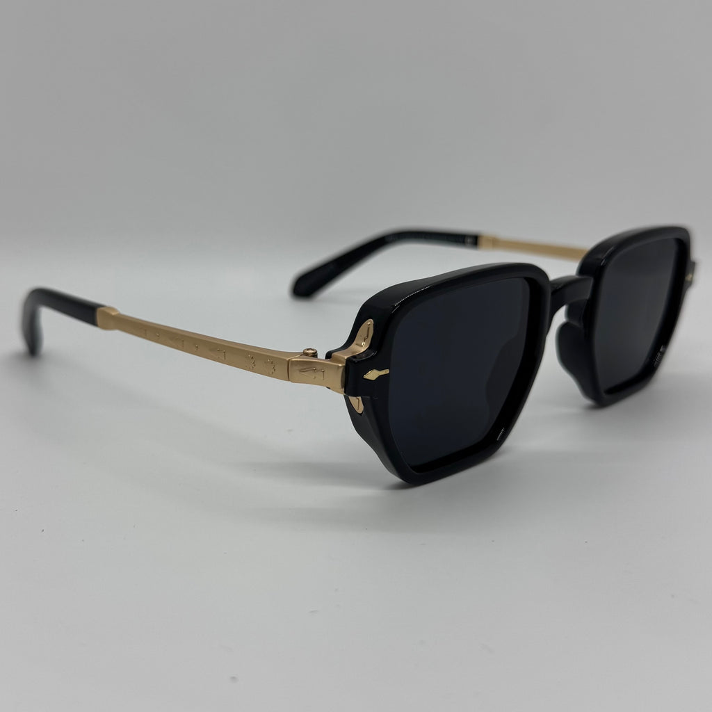 Óculos com hastes em metal dourado, frente em acetato preto com lente preta.