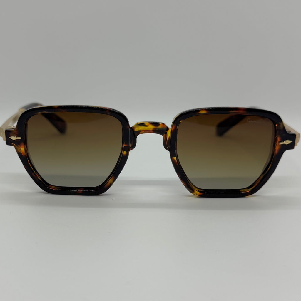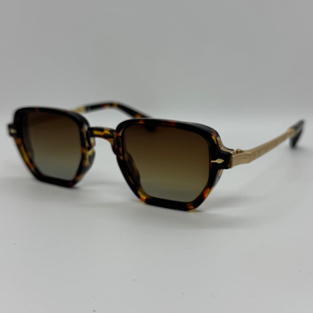 Óculos com hastes em metal dourado, frente em acetato tartaruga e lente marrom degrade.