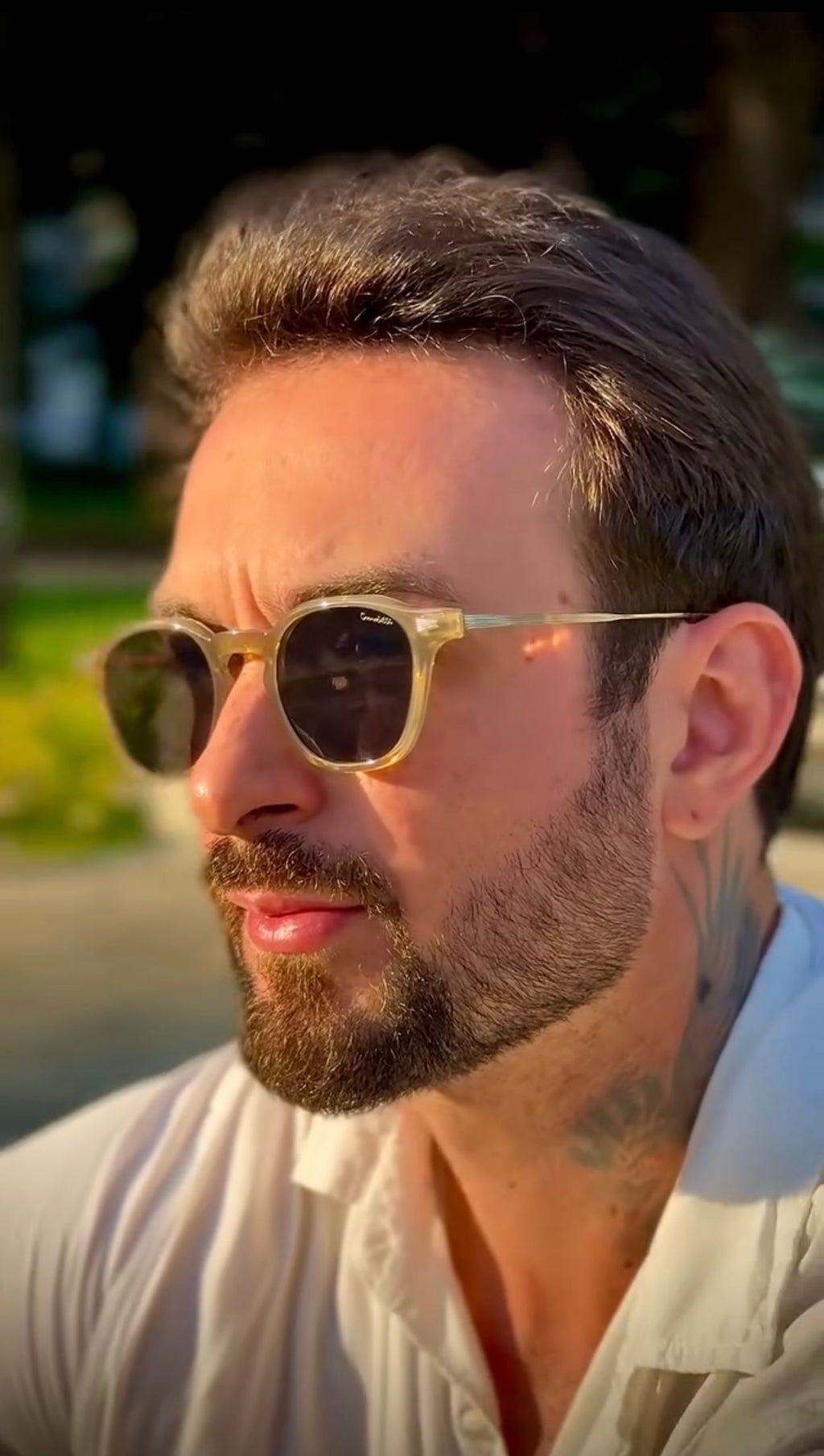 Óculos com hastes em metal, frente em acetato na cor âmbar translúcido com lente preta.