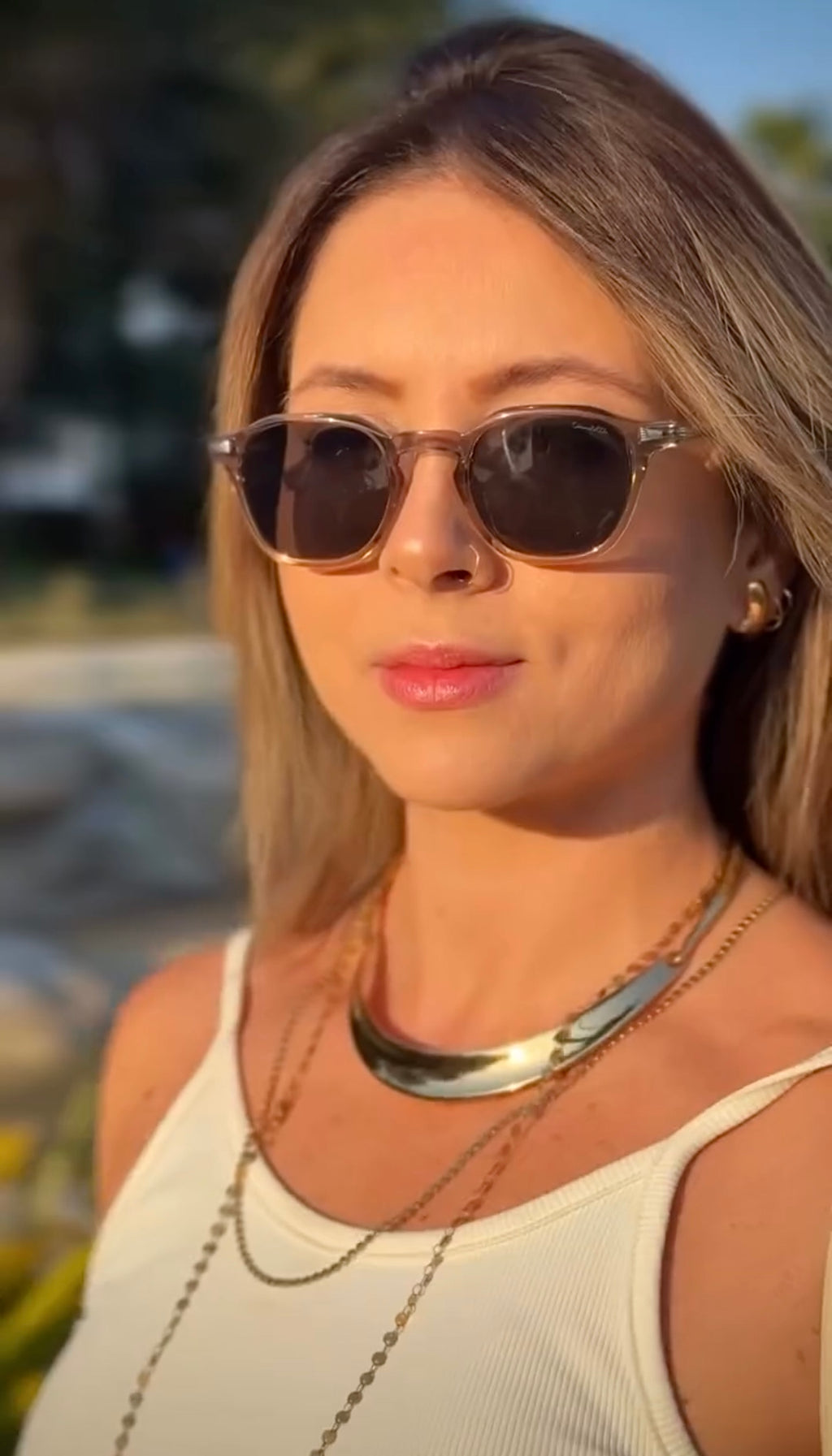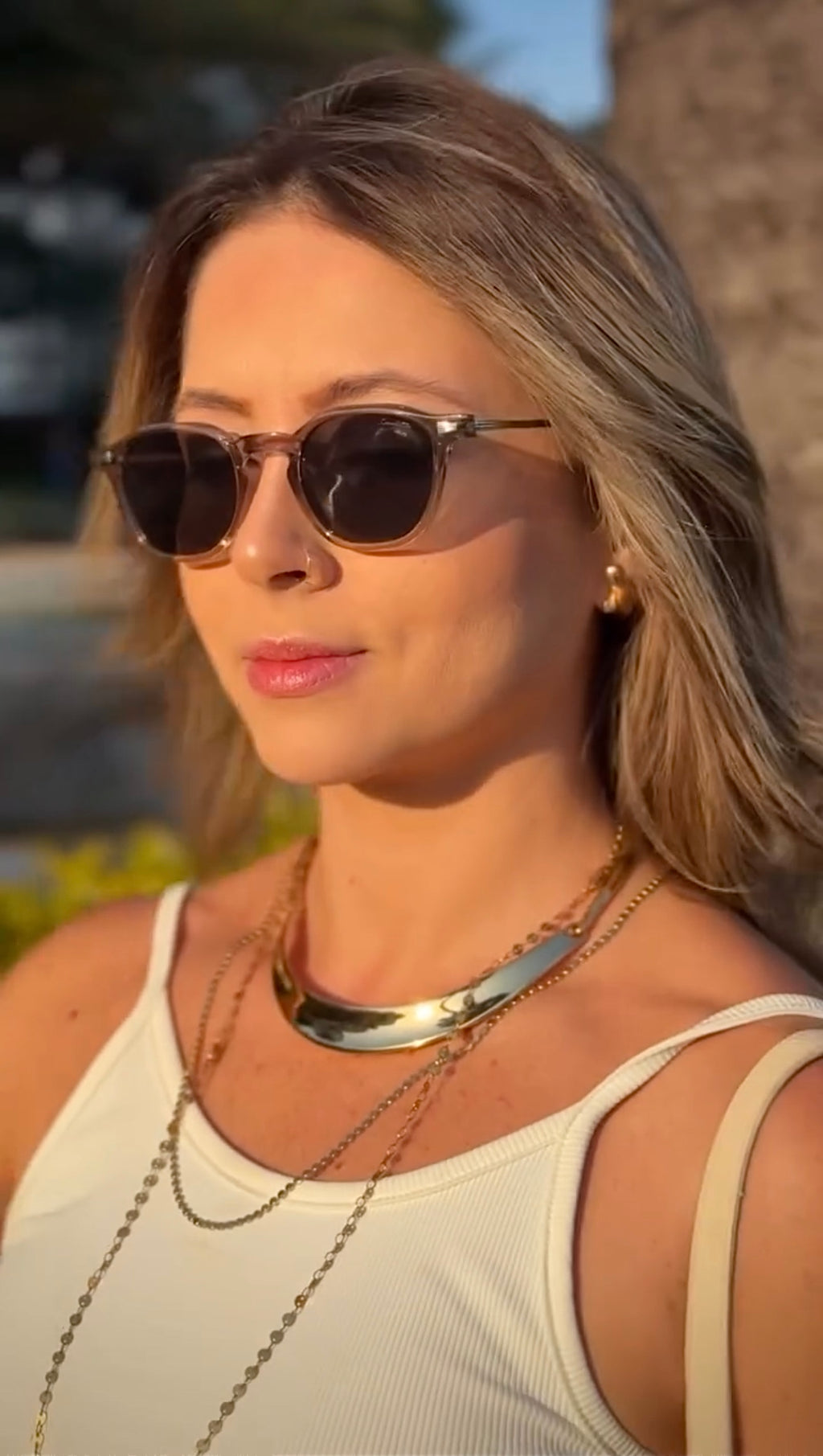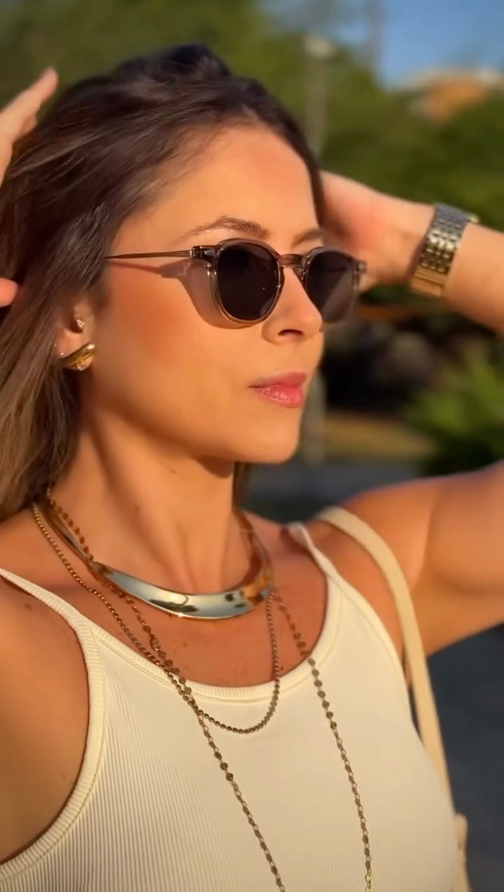 Óculos com hastes em metal dourado, frente em acetato cinza degrade com lente preta.