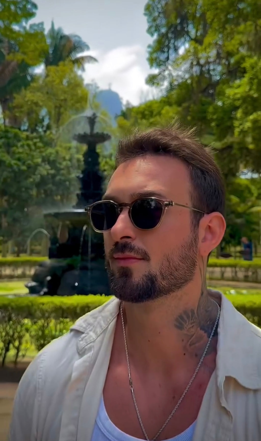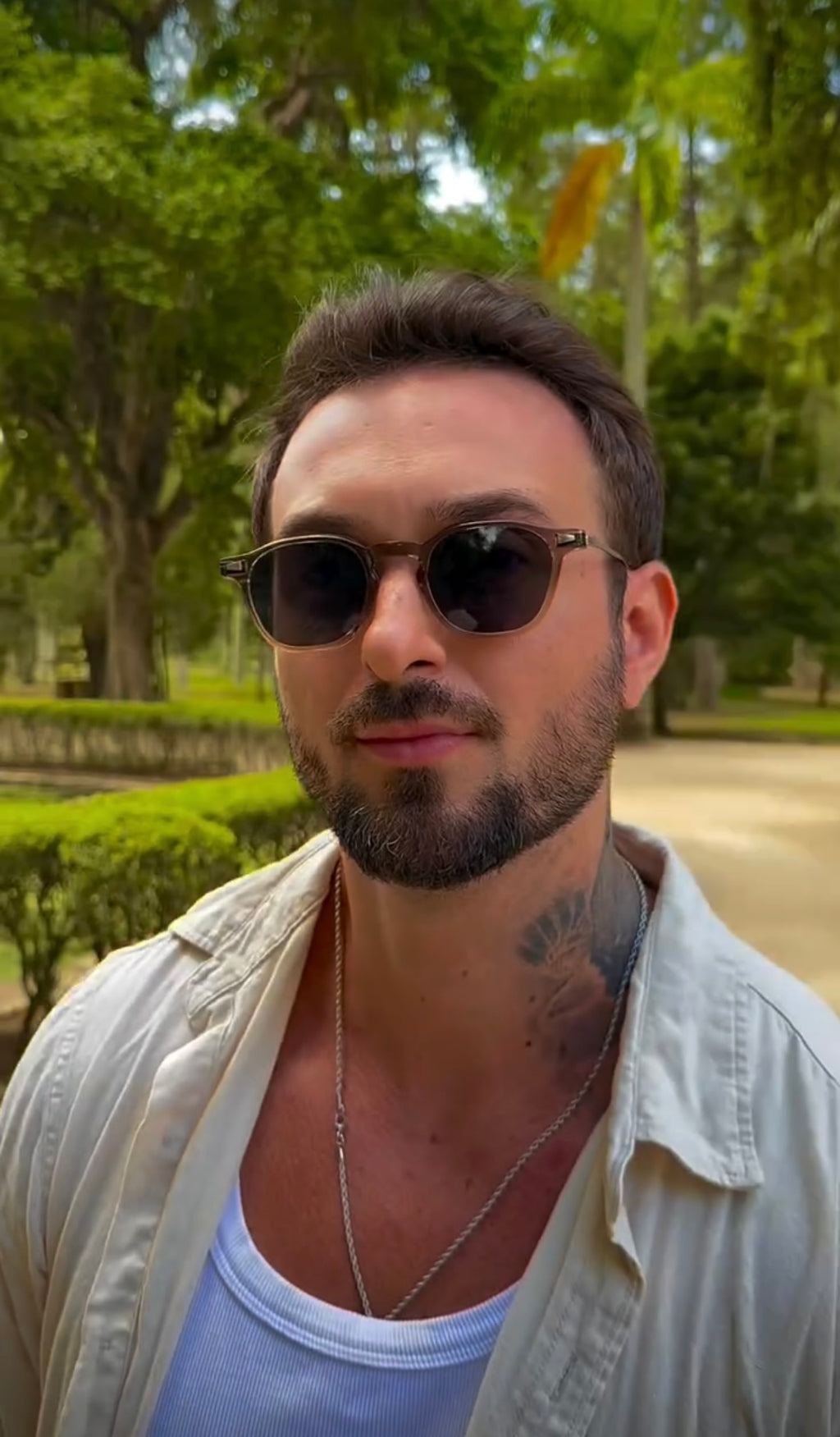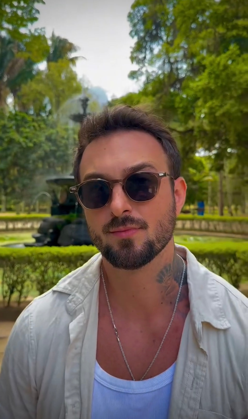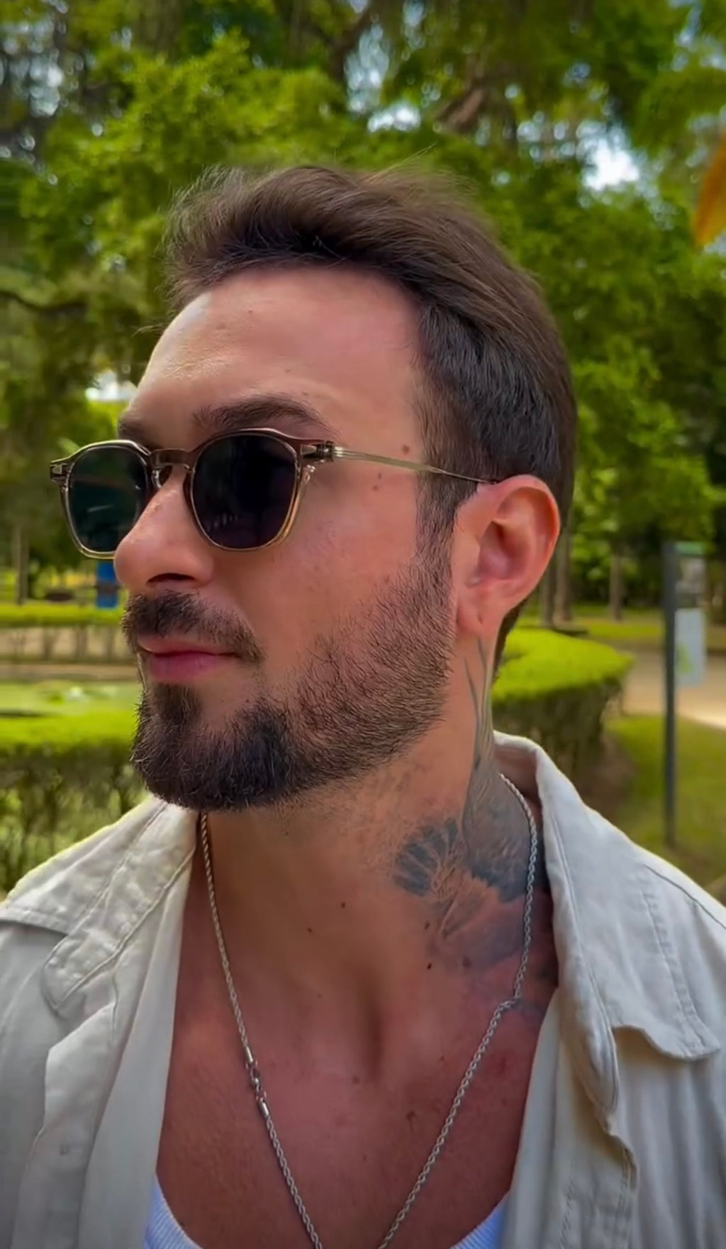Óculos com hastes em metal dourado, frente em acetato cinza degrade com lente preta.