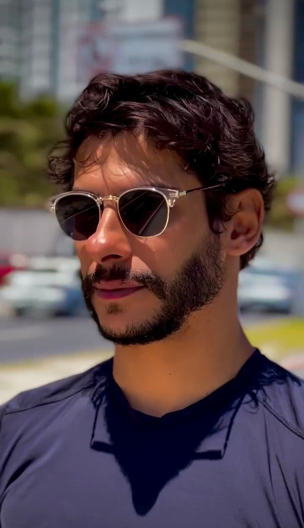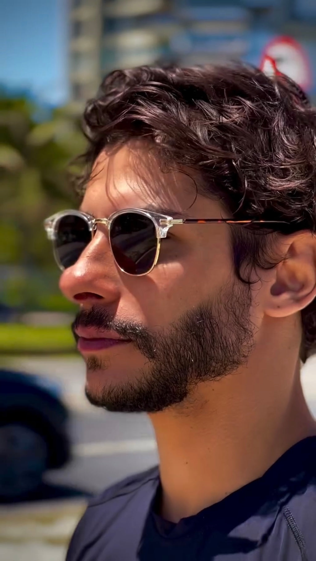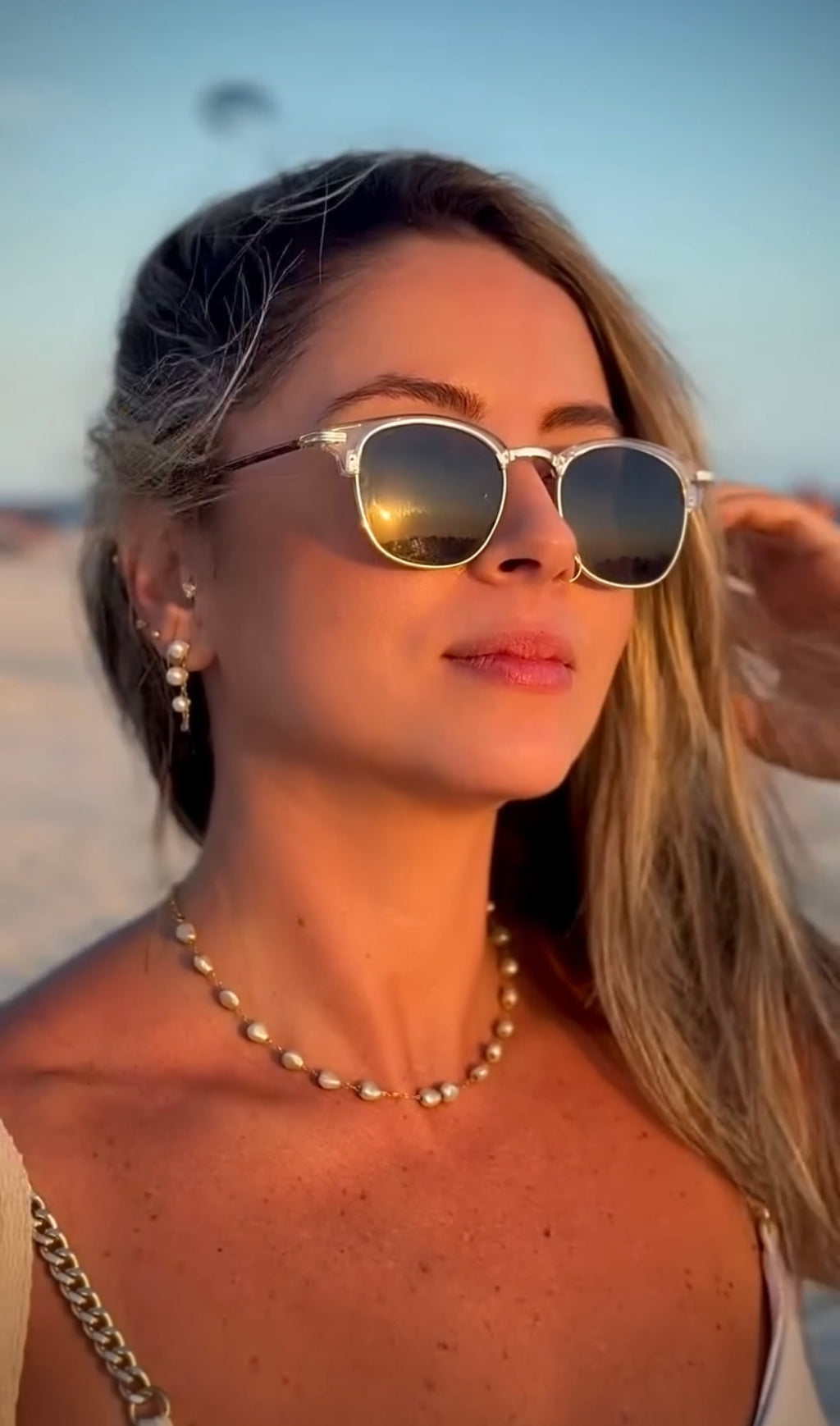 Óculos com hastes tartaruga, detalhes dourado, frente em acetato transparente e lente preta.