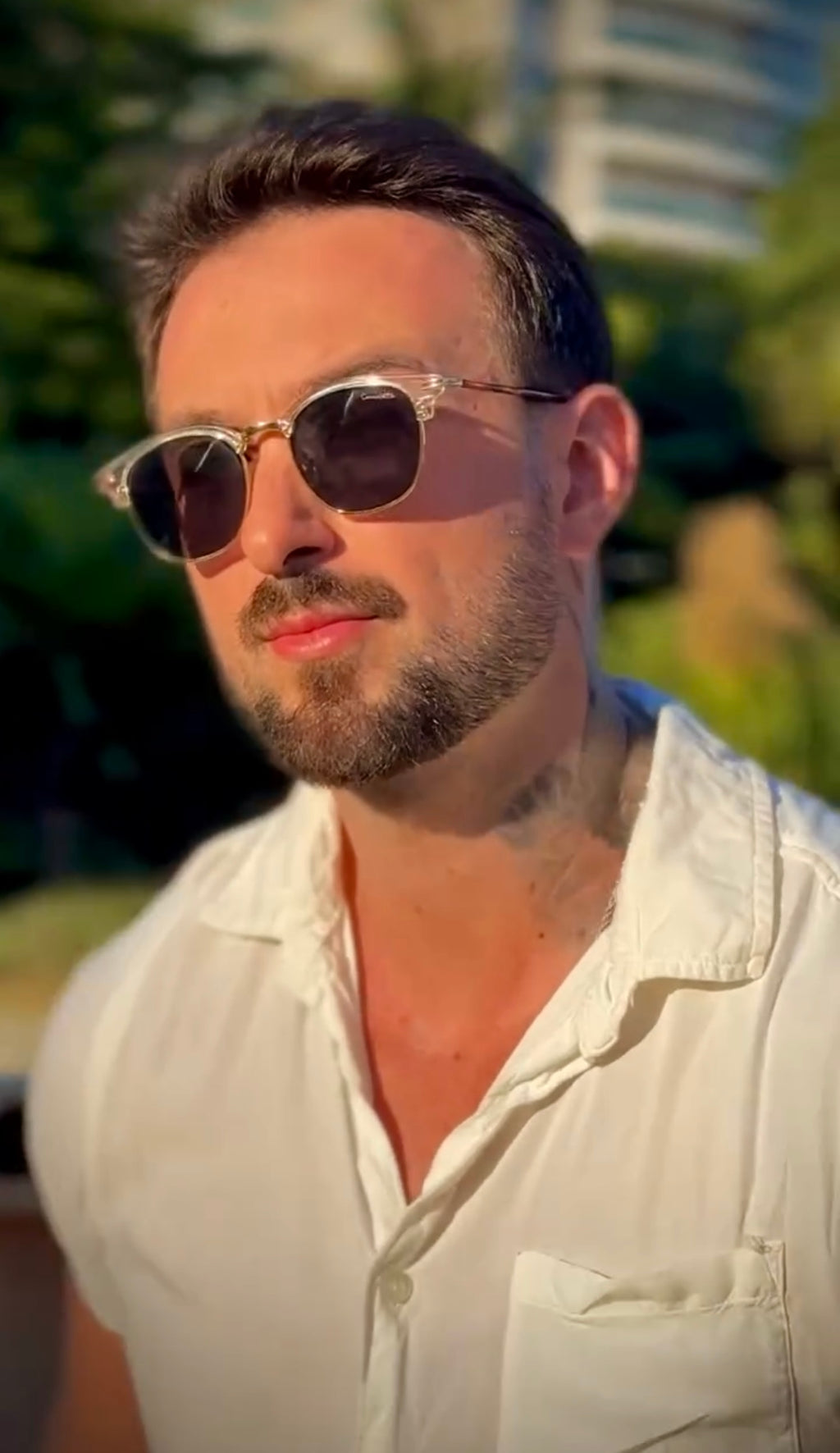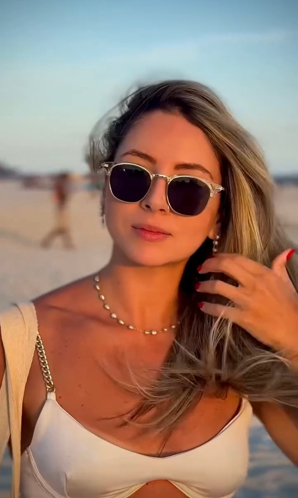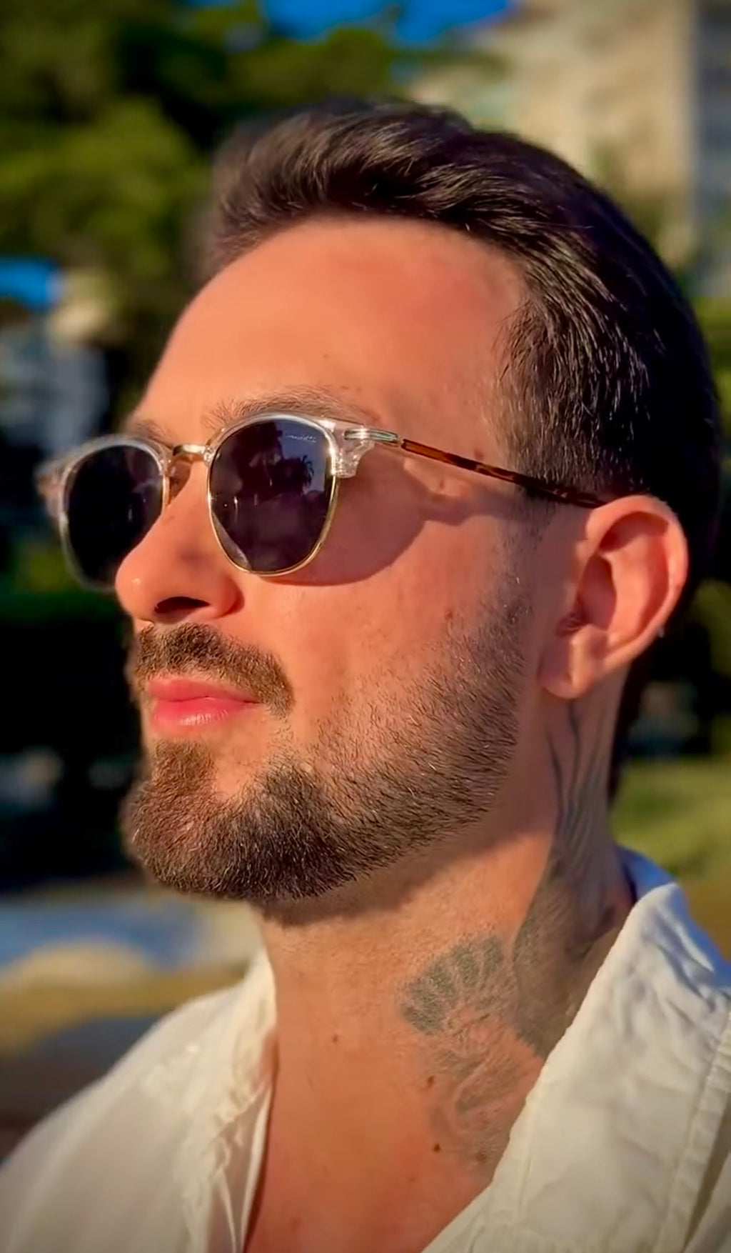 Óculos com hastes tartaruga, detalhes dourado, frente em acetato transparente e lente preta.