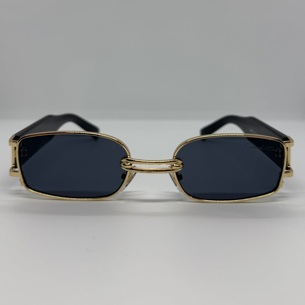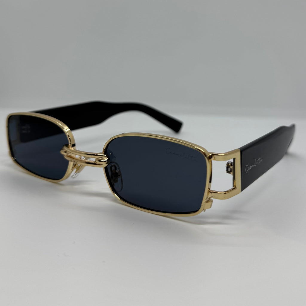 Óculos com hastes em acetato preto com frente em metal dourado e lente preta.