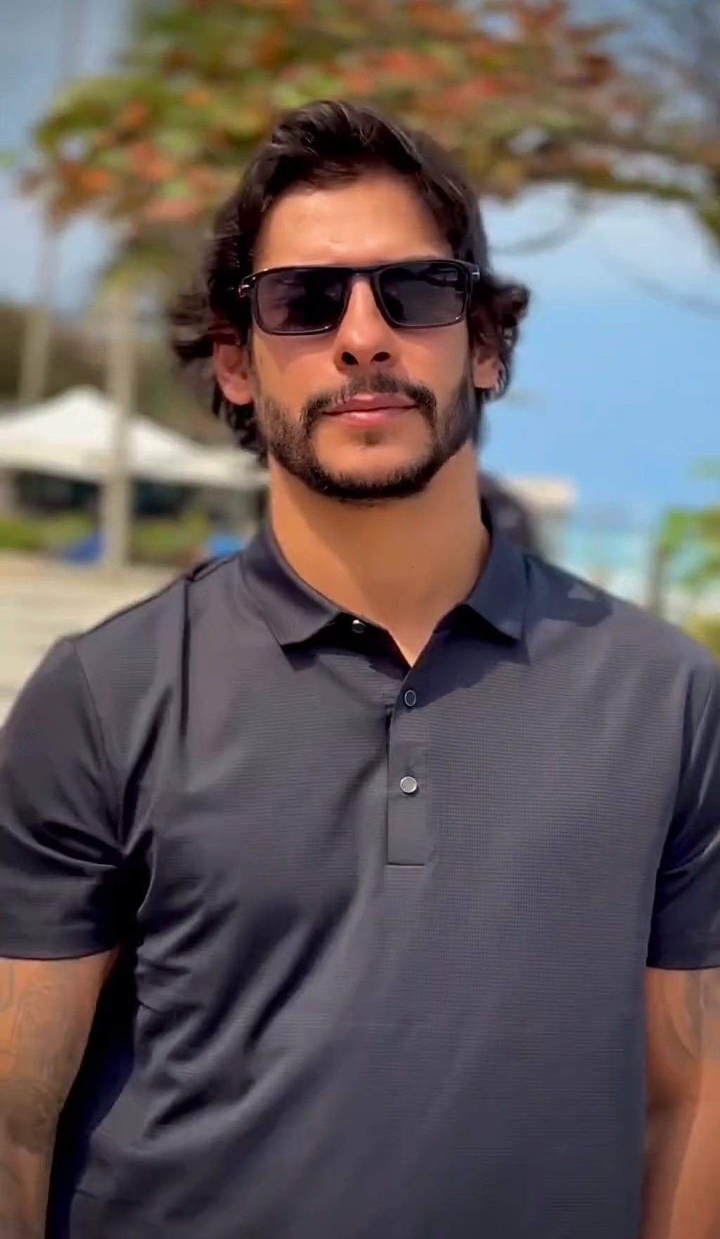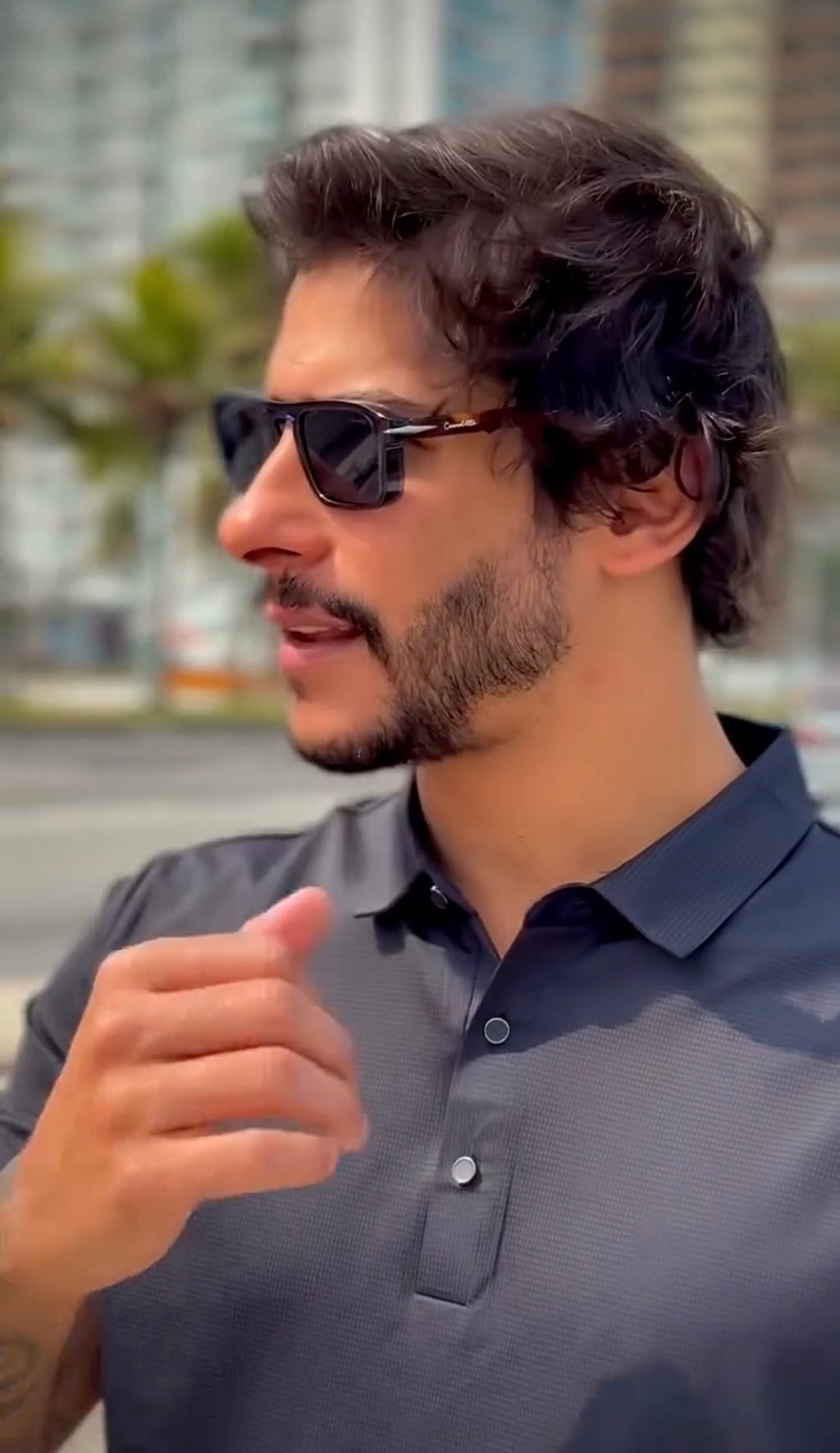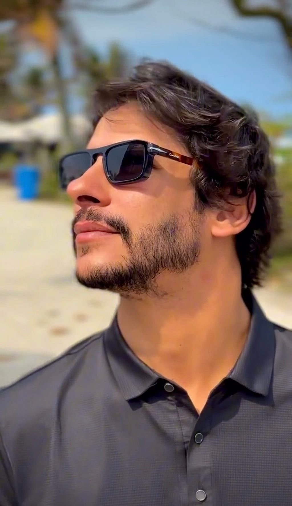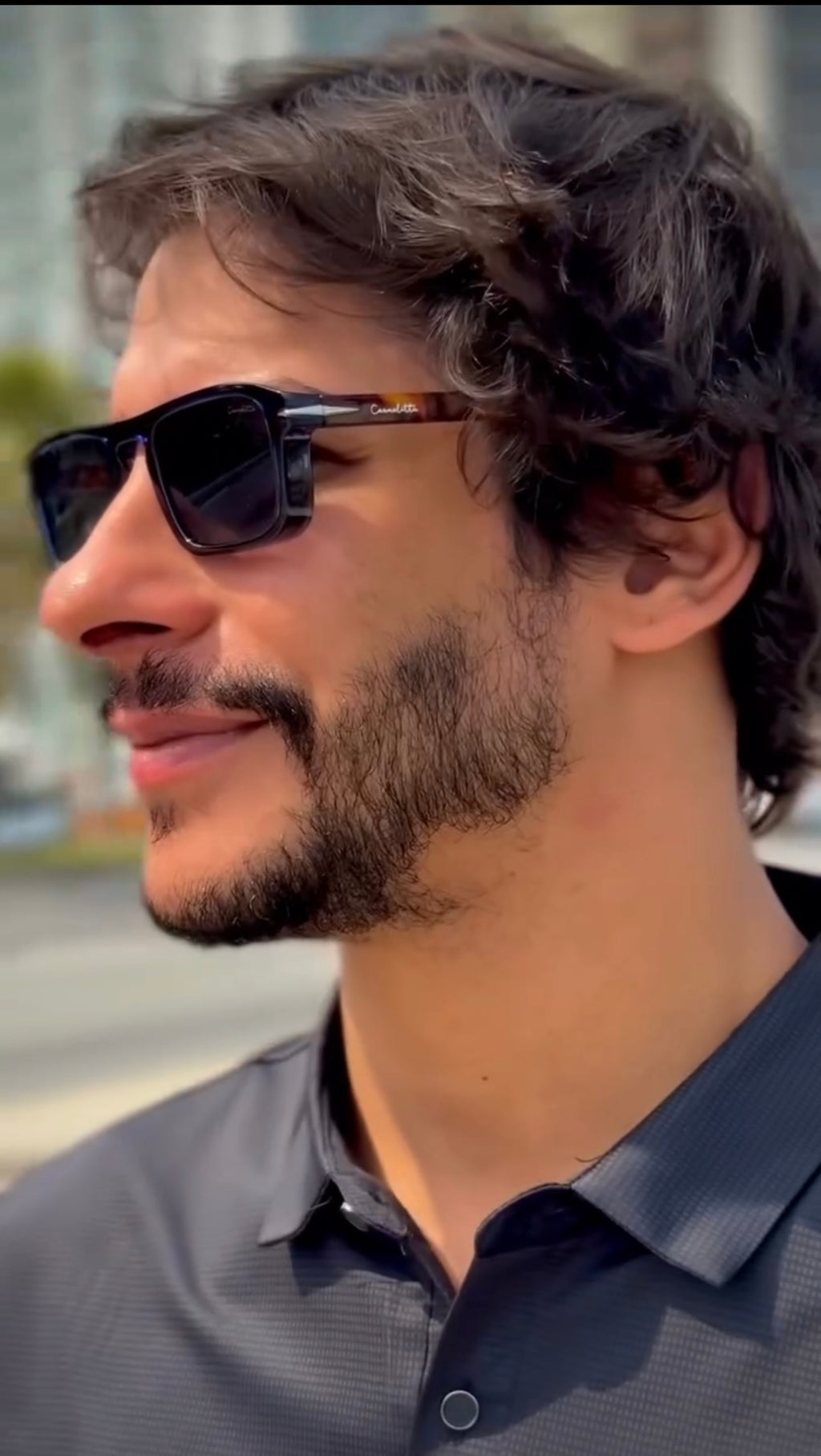 Óculos com hastes em acetato tartaruga, frente na cor azul e lente preta.