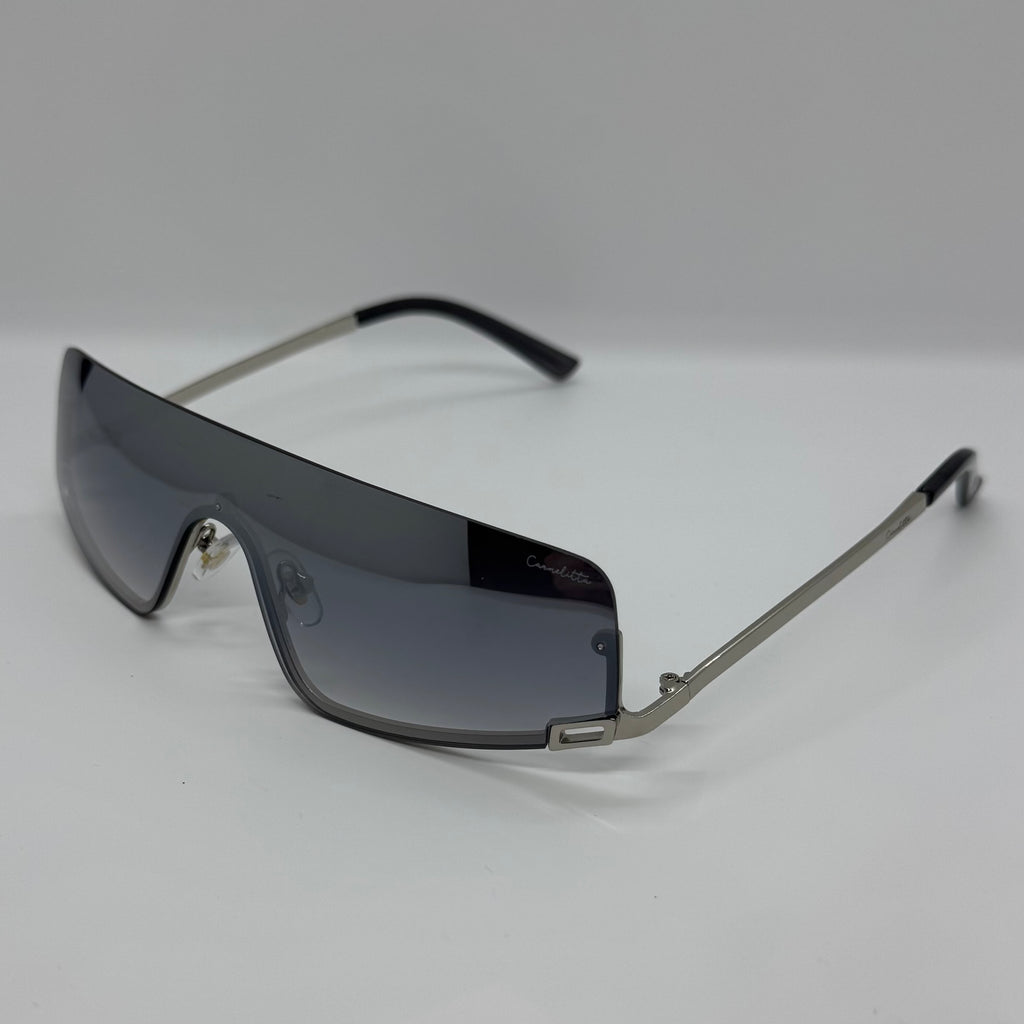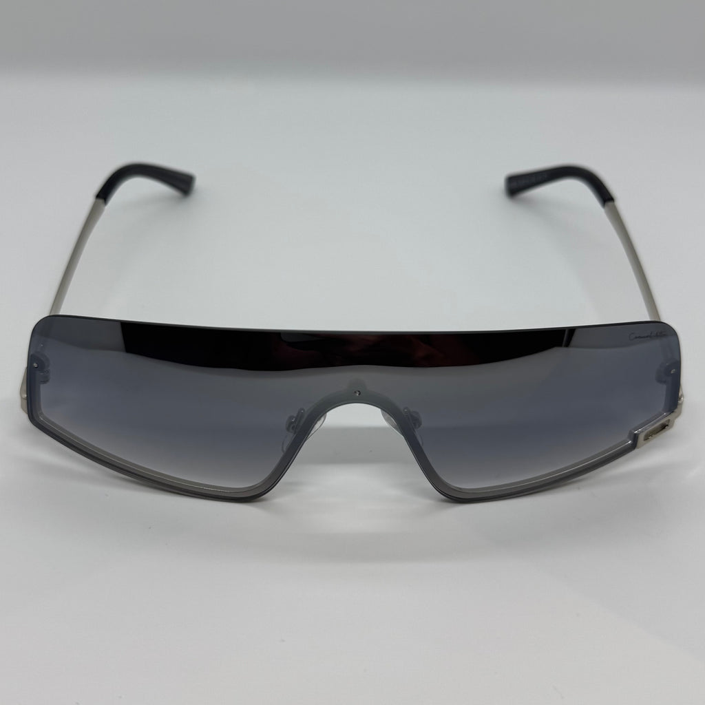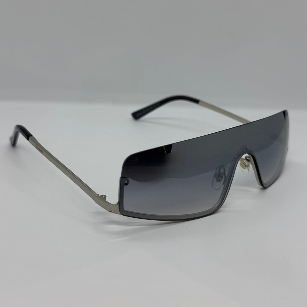 Óculos de sol com design escultural e ultra contemporâneo, composto por lente única contínua espelhada prata, que cria um visual imponente e futurista. A frente tem linhas angulares e acabamento limpo, transmitindo força e sofisticação.