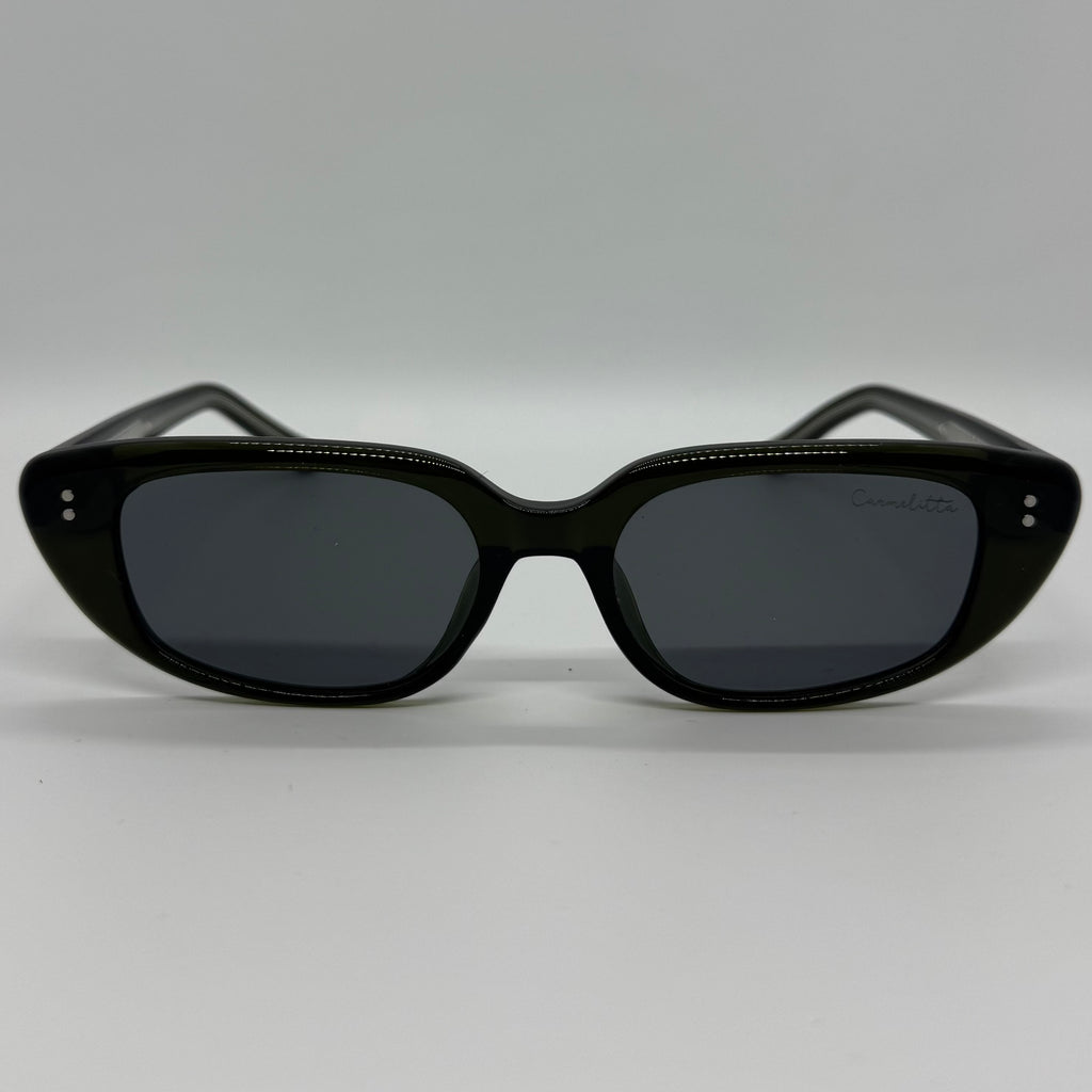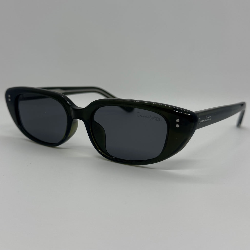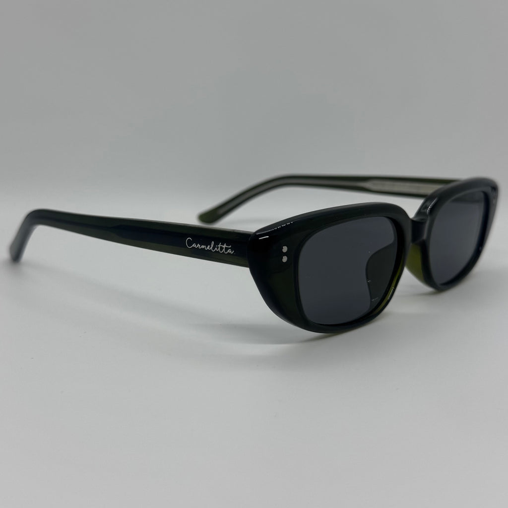 Óculos com hastes em acetato verde militar translúcido com lente preta.