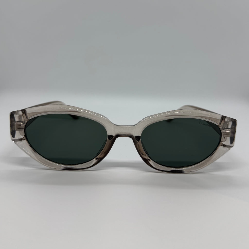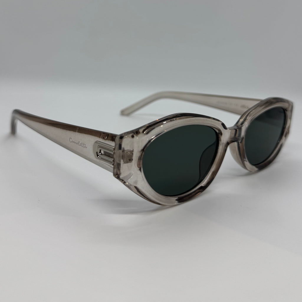Óculos com hastes em acetato cinza translúcido com lente verde.