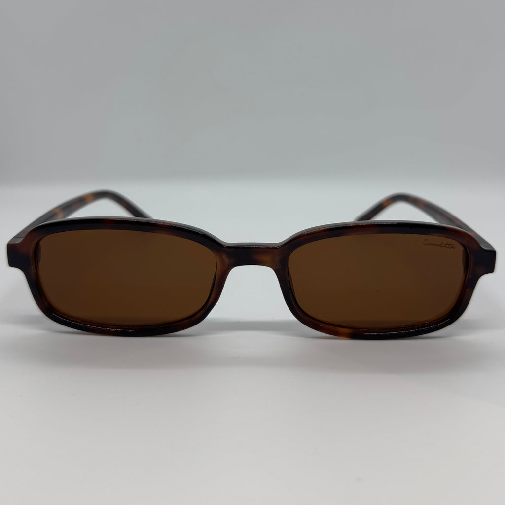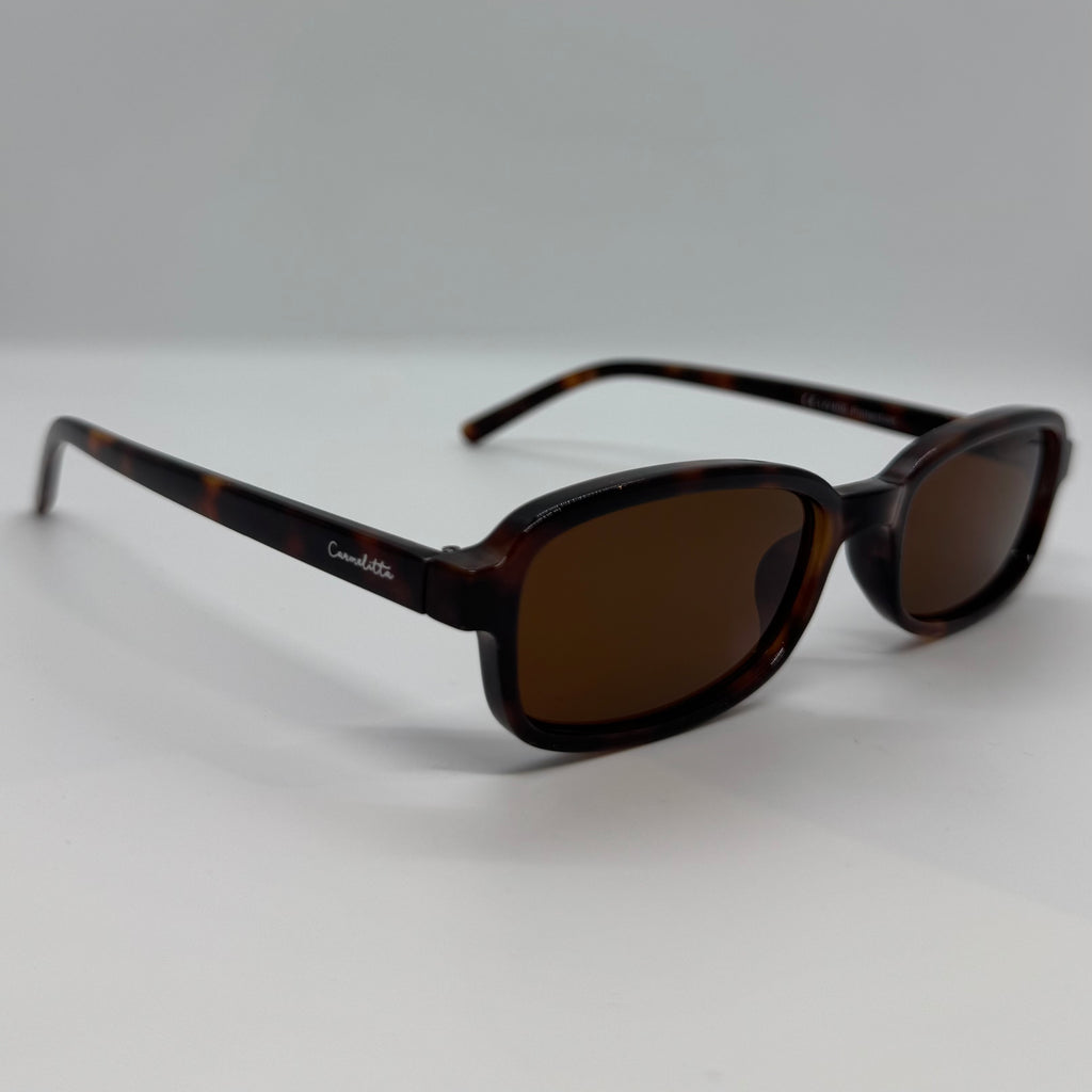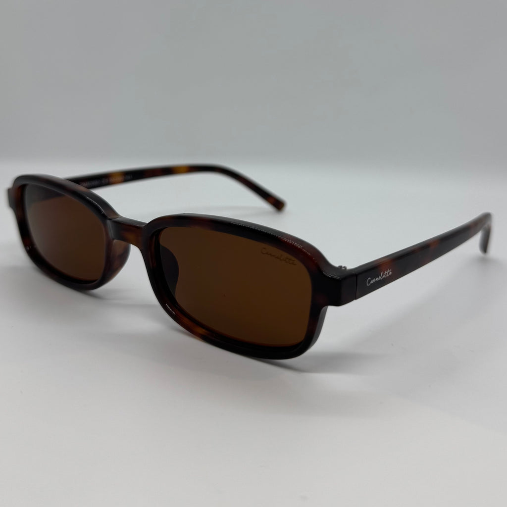 Óculos com hastes em acetato tartaruga com lente marrom.