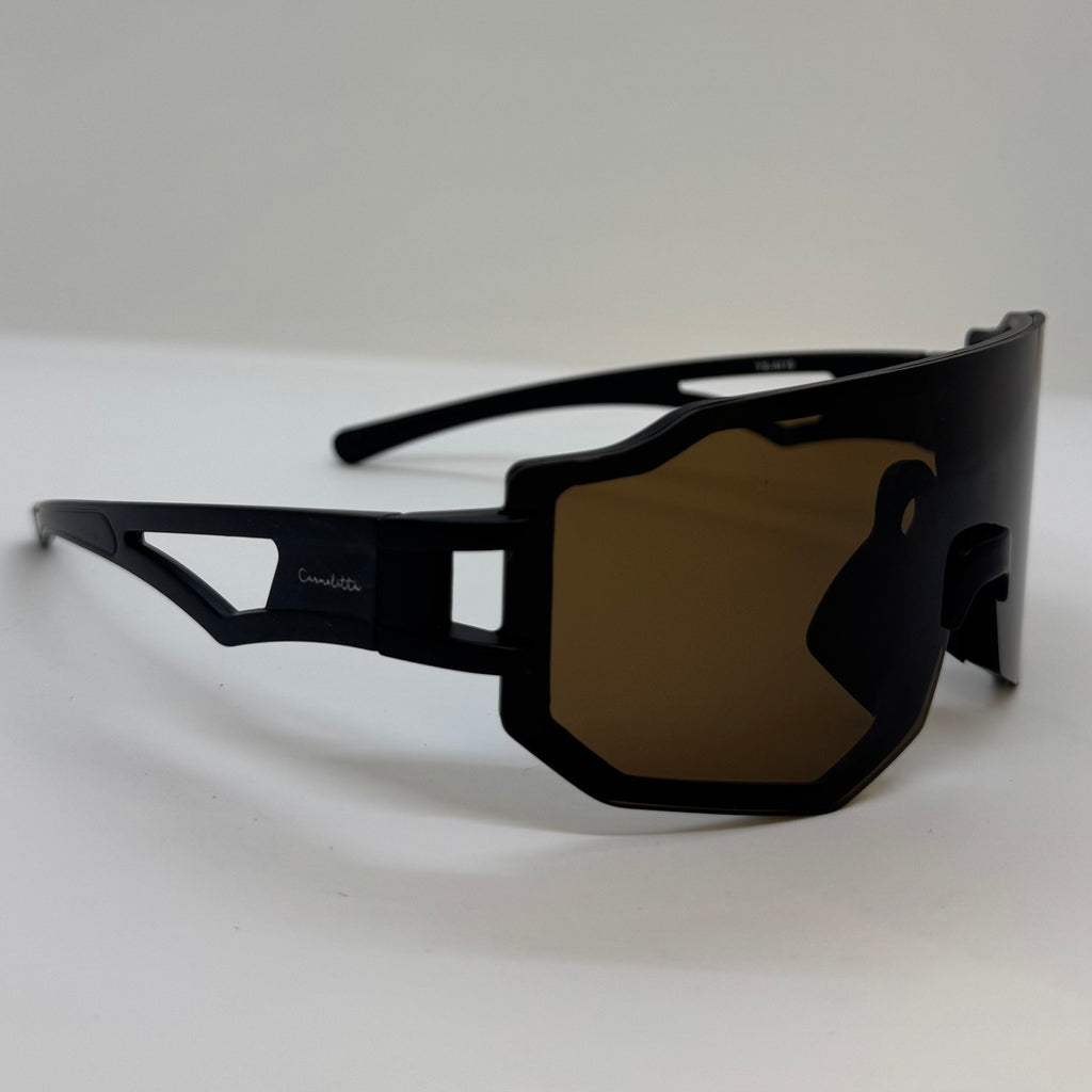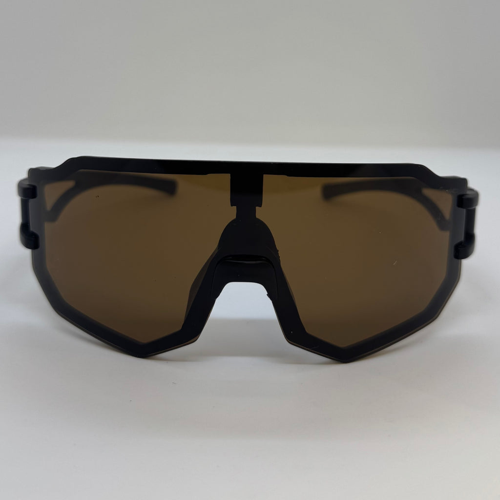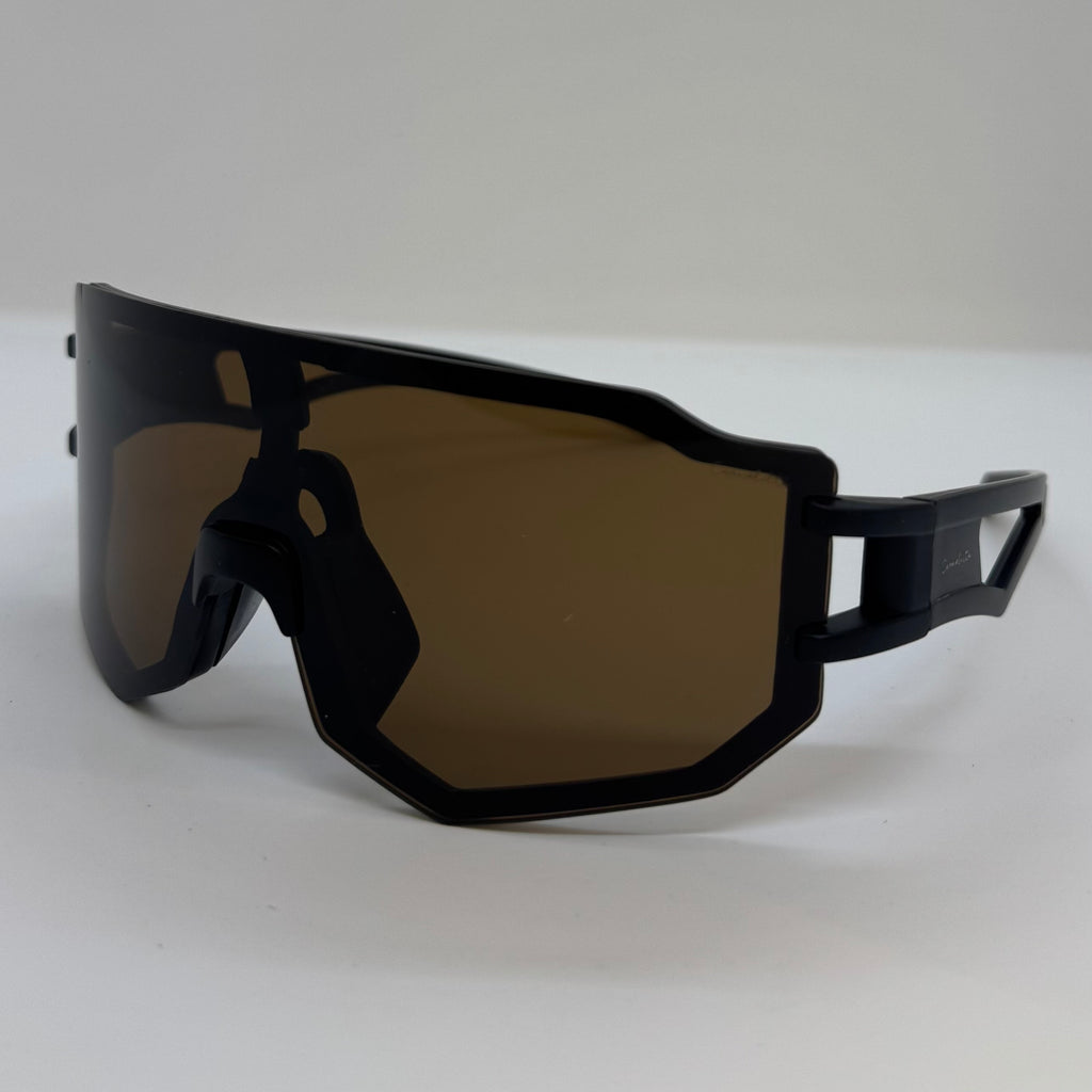 Óculos no estilo esportivo com armação preto fosco em polibicarbonato de alta durabilidade, lentes em marrom fumê e panorâmica, hastes ergonômicas.