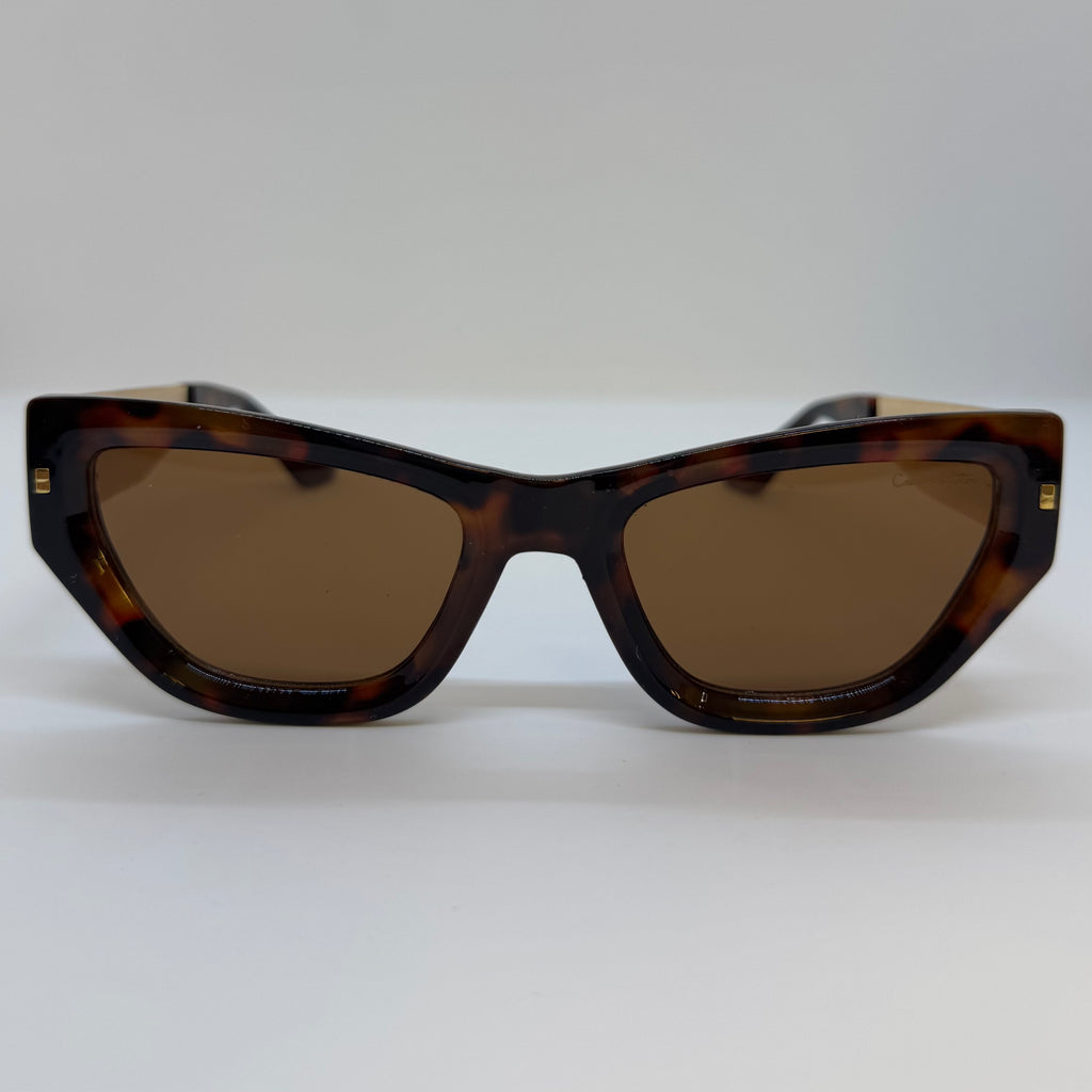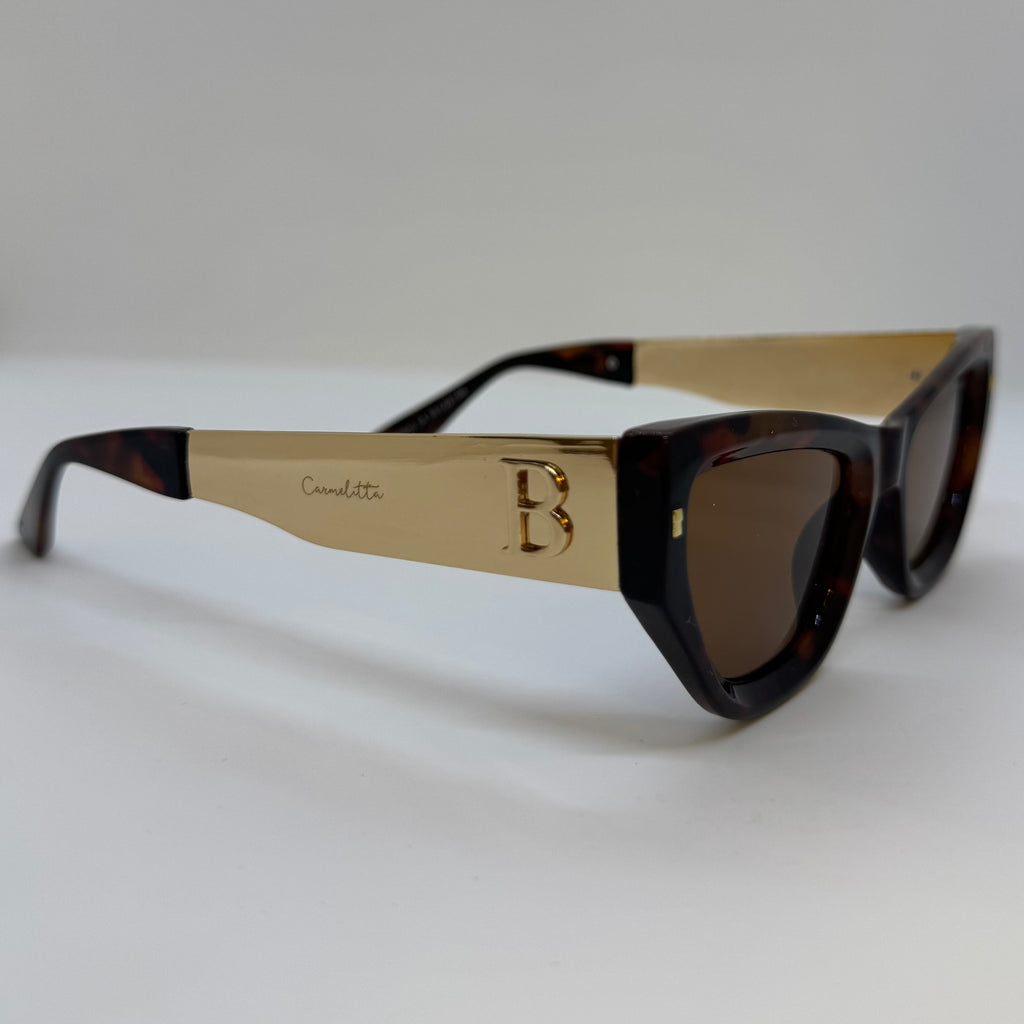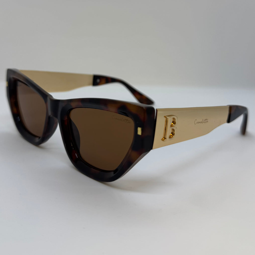 Óculos com hastes em metal, frente em acetato tartaruga com lente marrom.