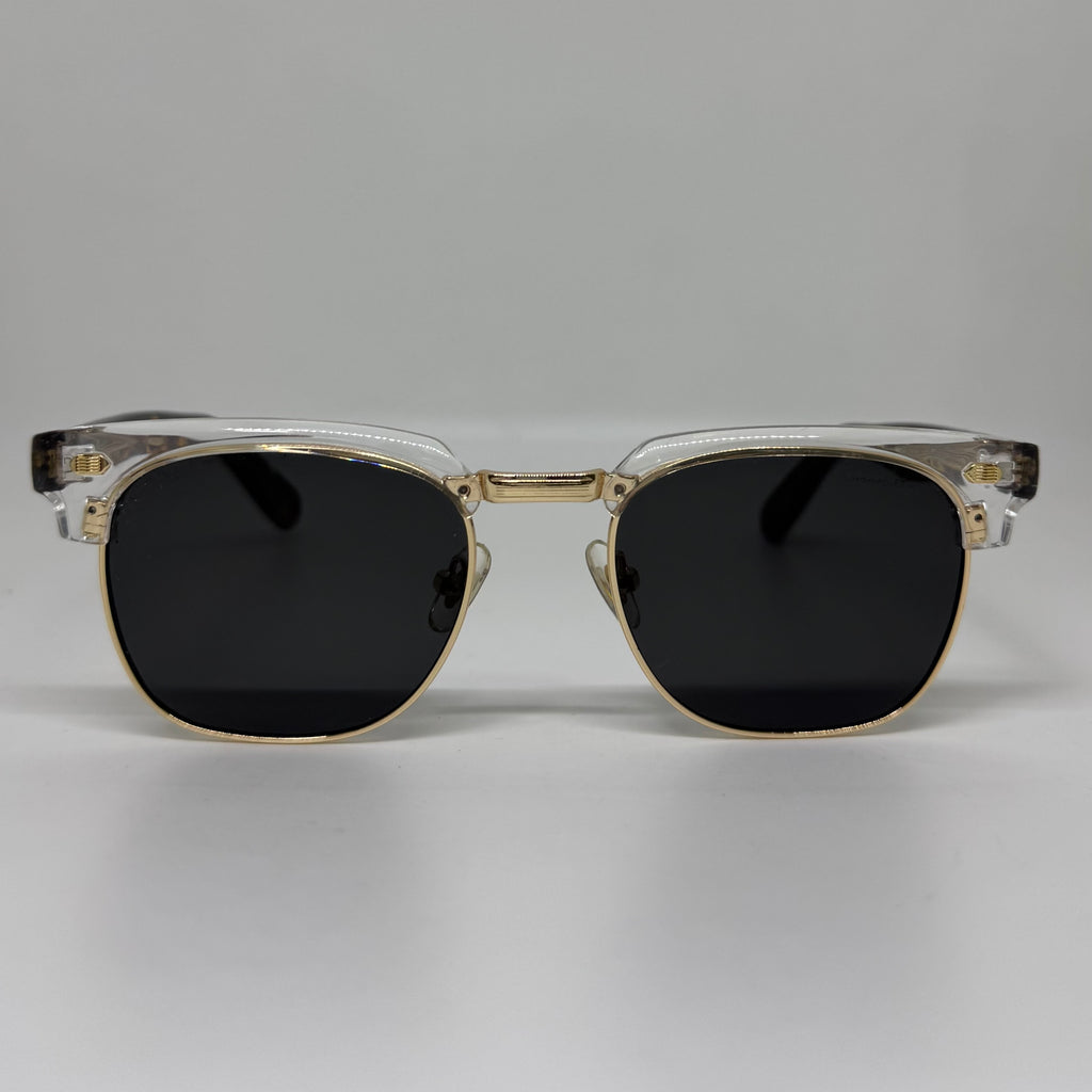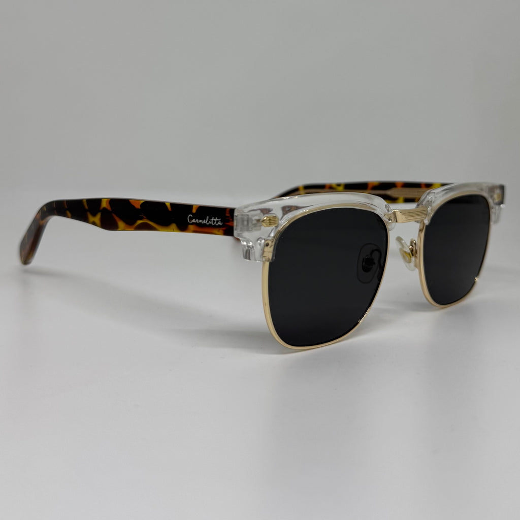 Óculos com hastes em acetato premium na cor tartaruga, frente transparente e lente preta.