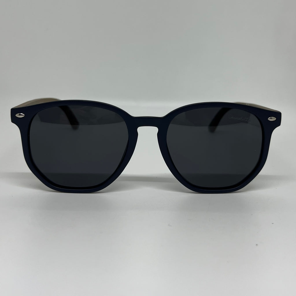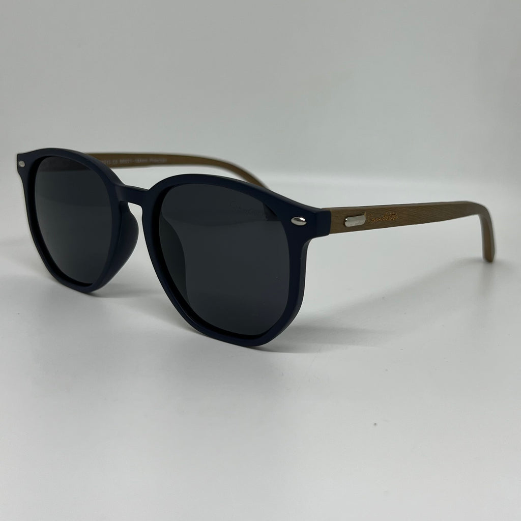 Óculos com hastes em bambu escuro, frente em acetato azul marinho fosco e lente preta.