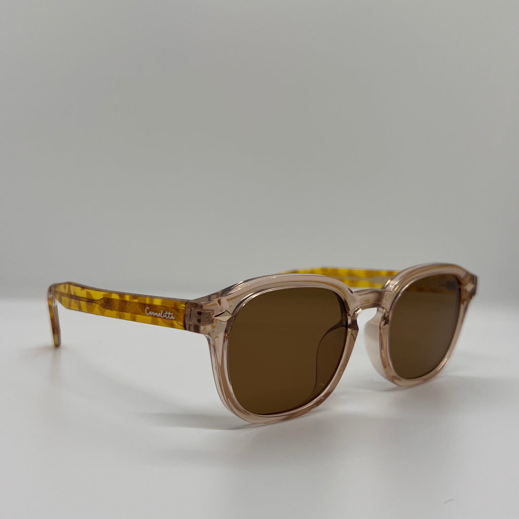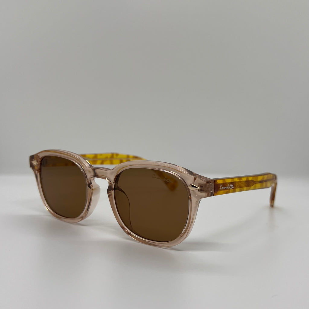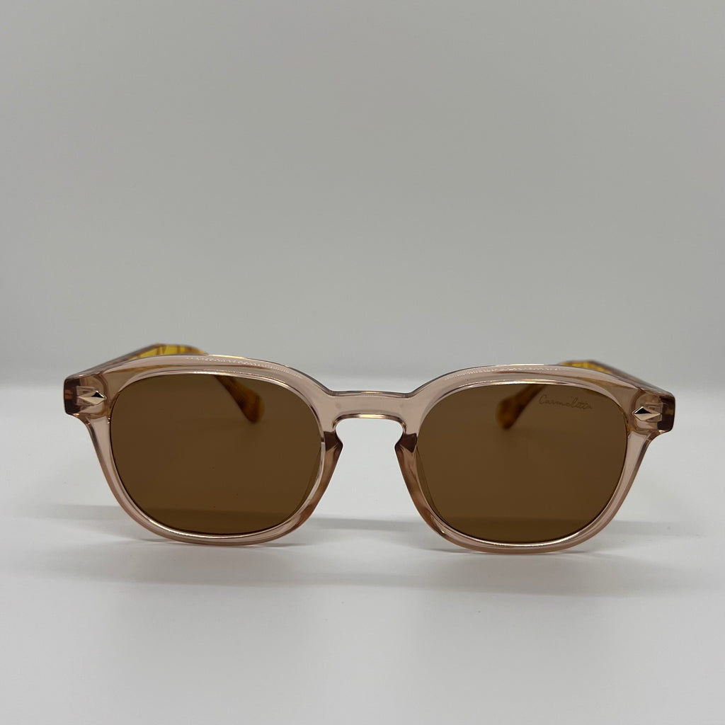 Óculos com hastes em acetato jaguar, frente na cor rose e lente marrom.