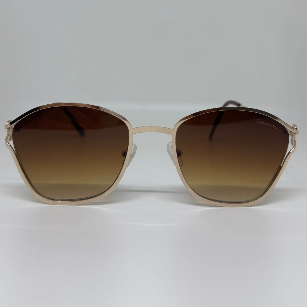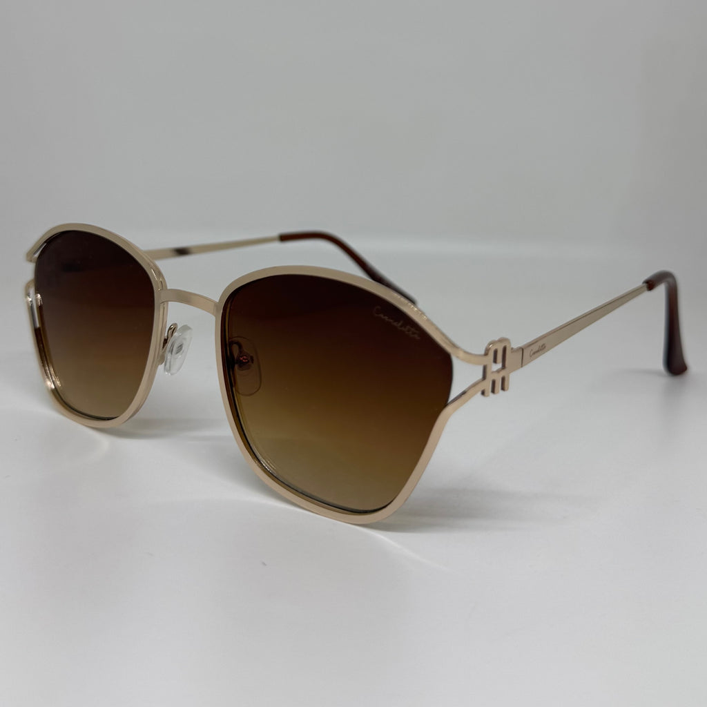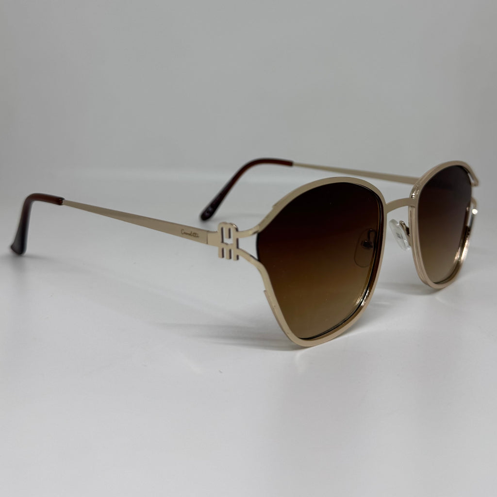 Óculos com hastes em metal dourado com lente marrom degrade.