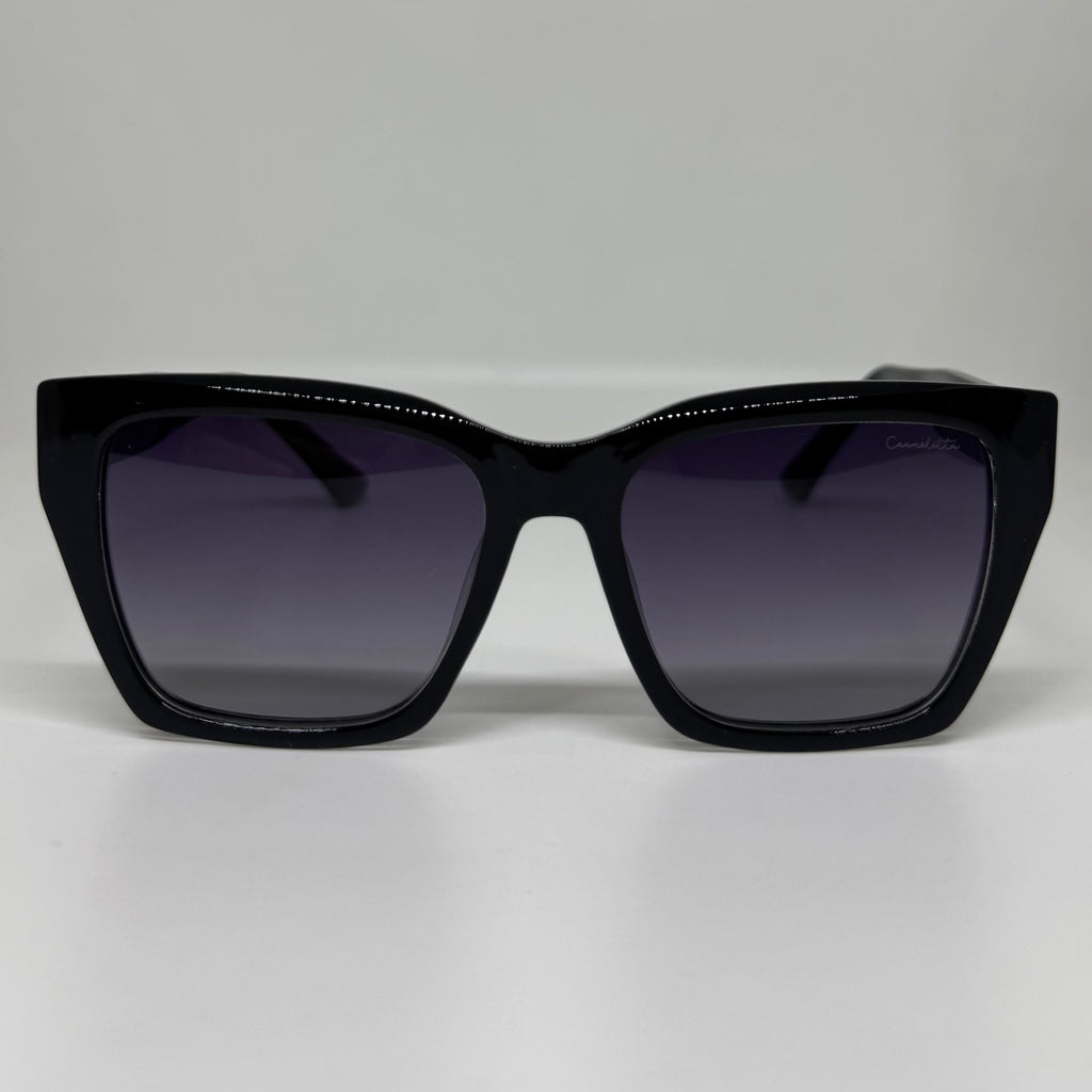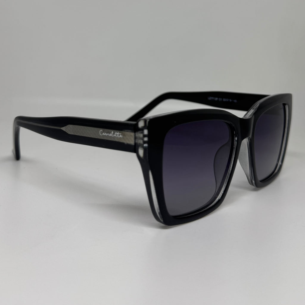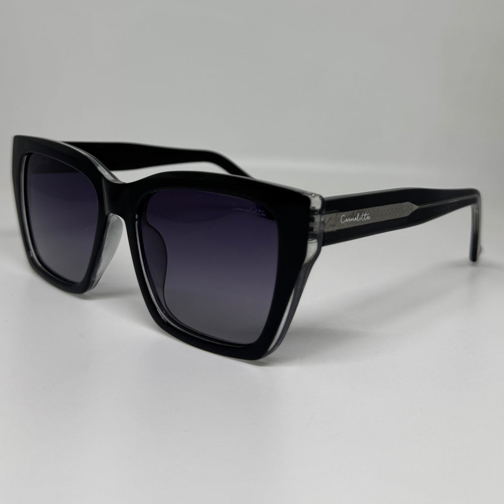 Óculos com hastes em acetato preto com lente roxa degrade.