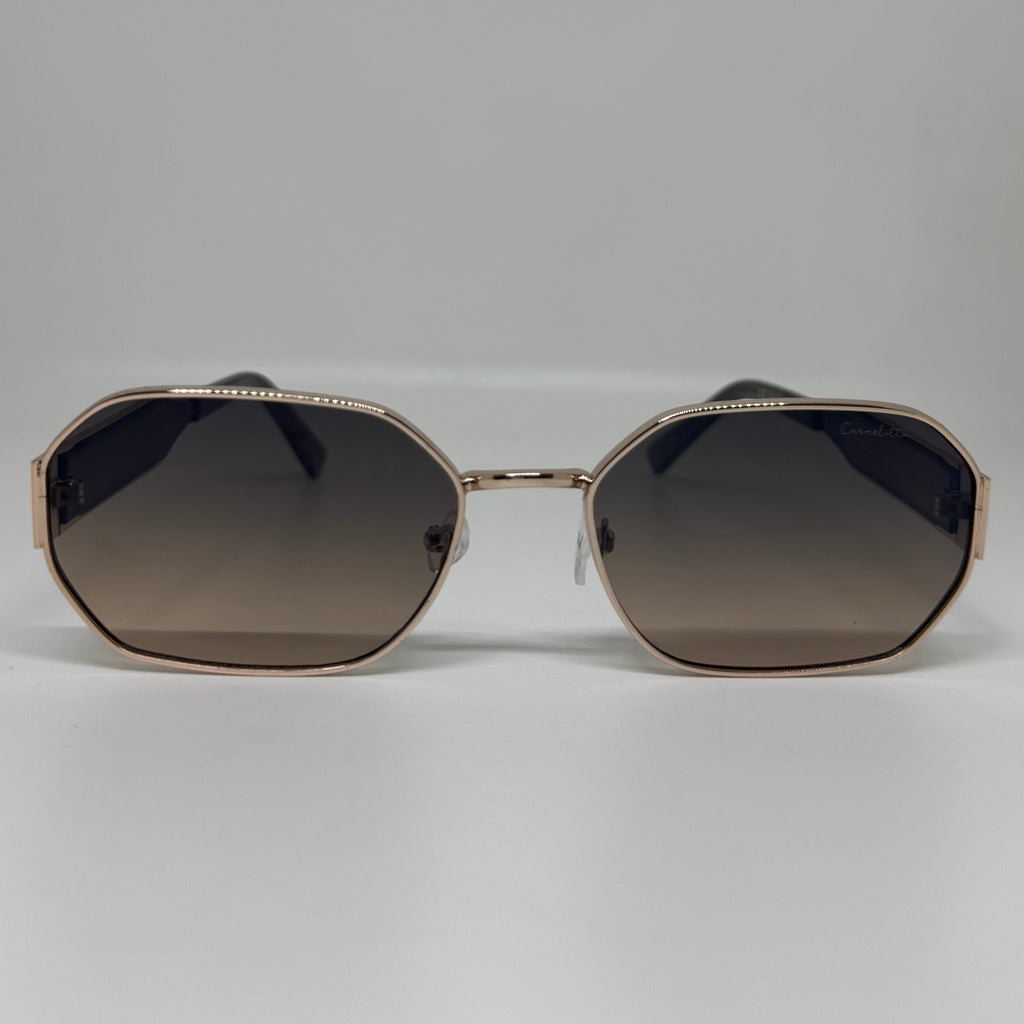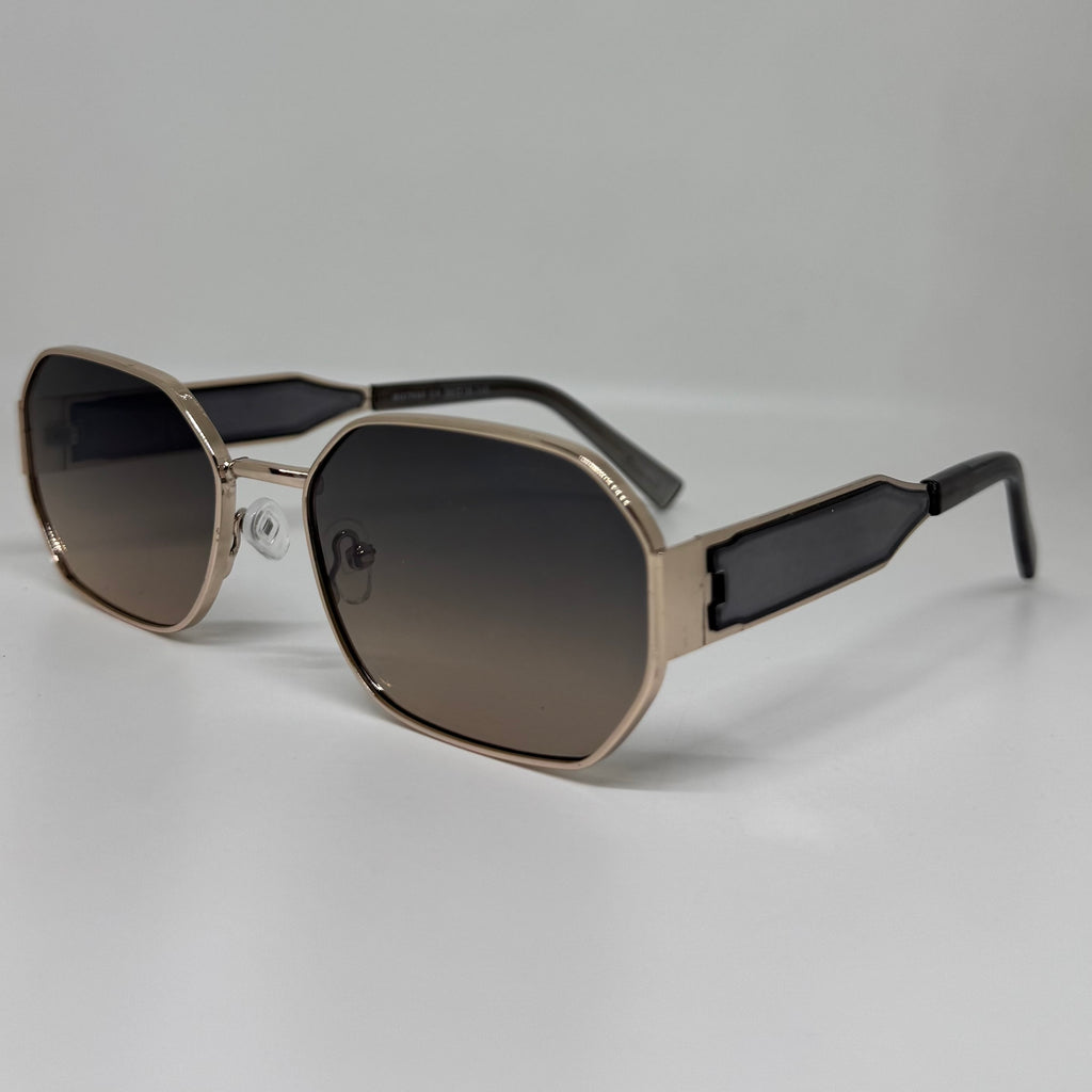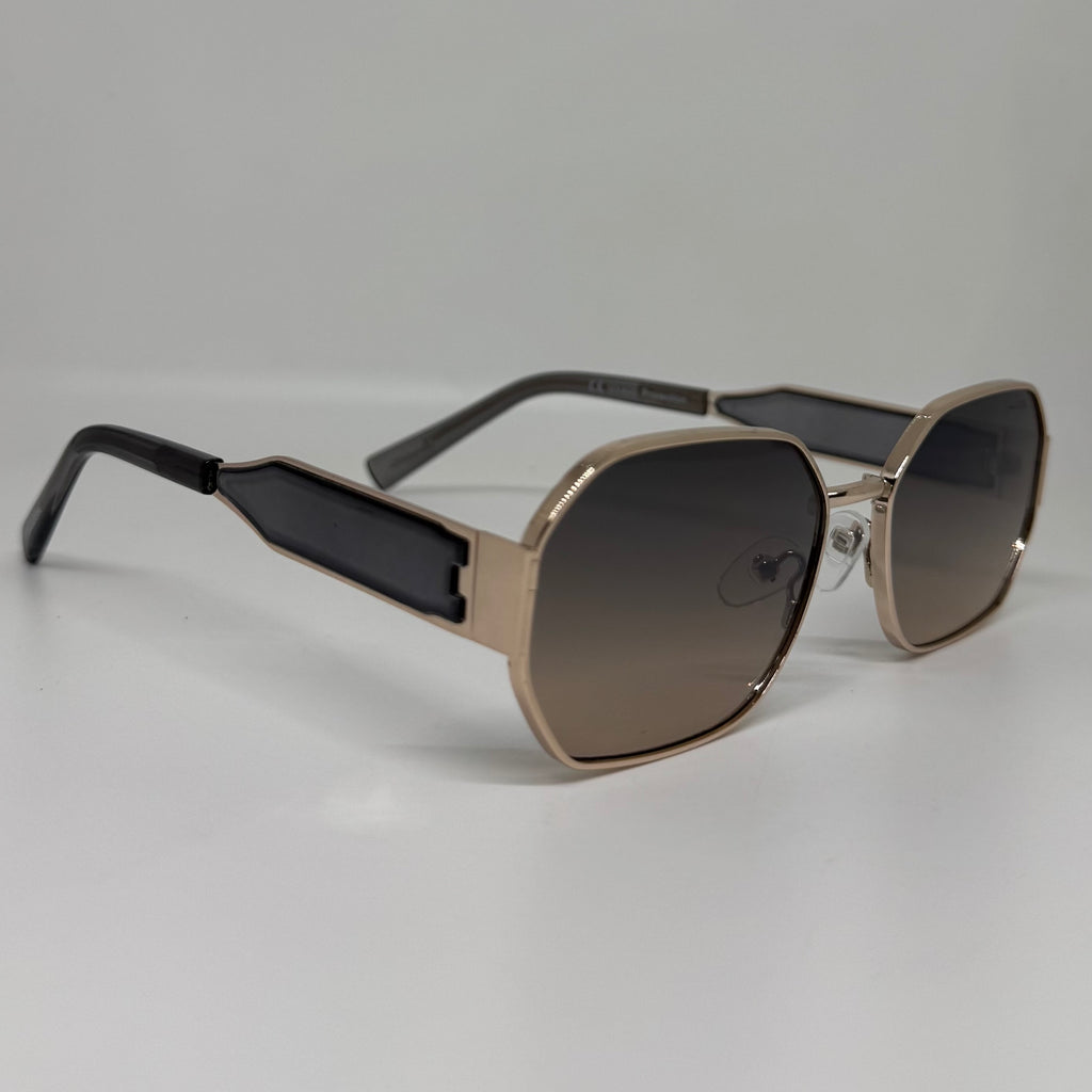 Óculos com hastes em metal dourado com acetato cinza e lente fume degrade.
