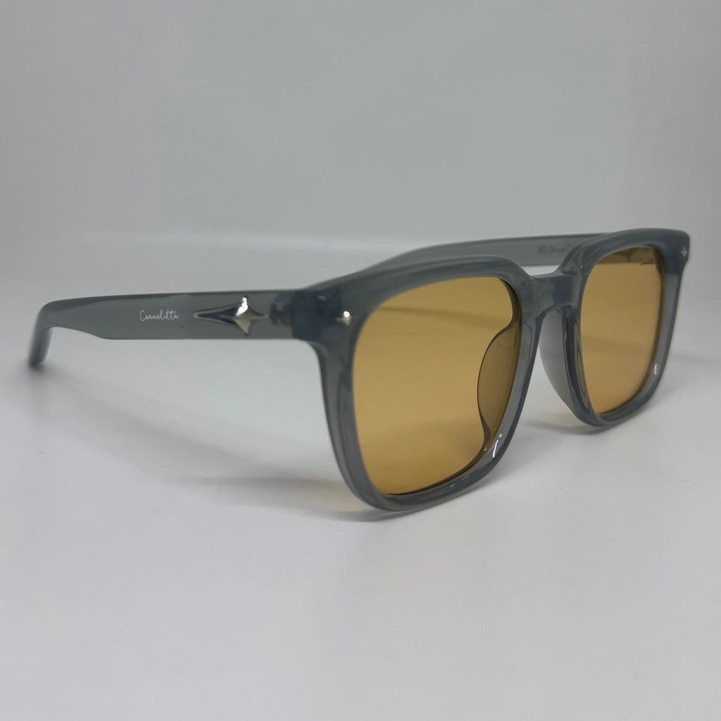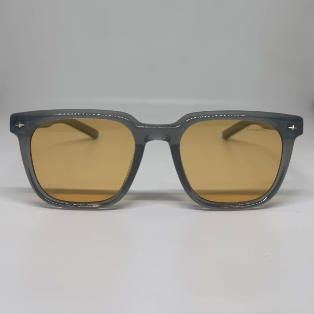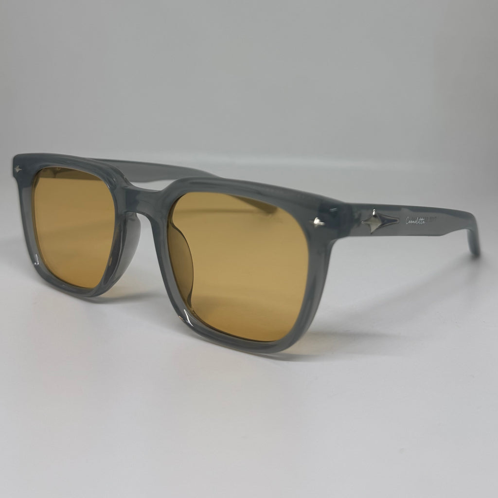 Óculos com hastes em acetato cinza com detalhes em alto relevo e lente amarela.
