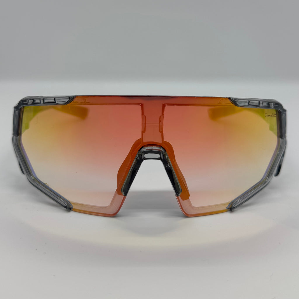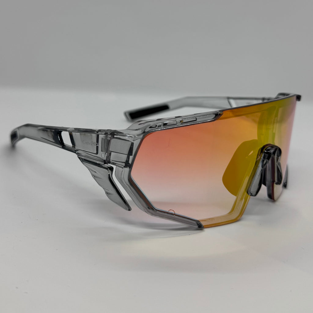 Óculos com hastes em acetato cinza translúcido com lente vermelha degrade.