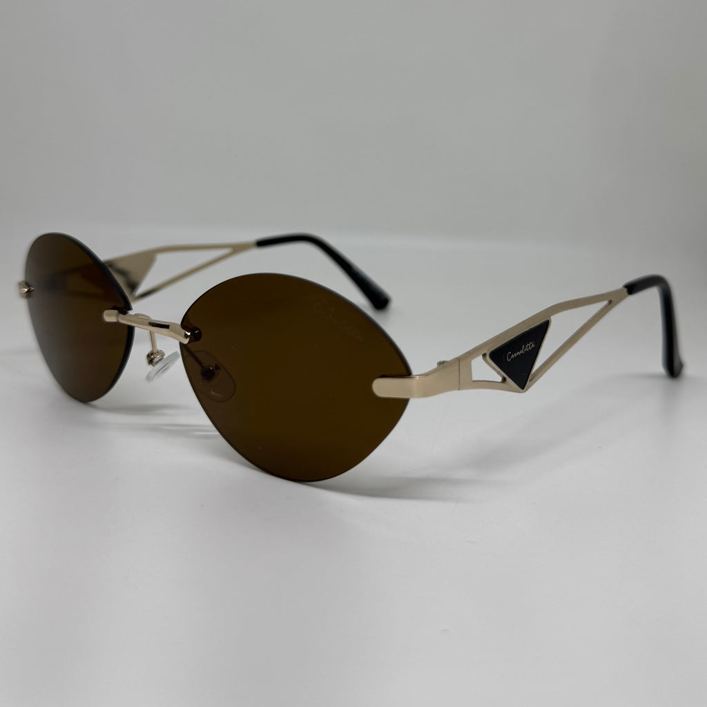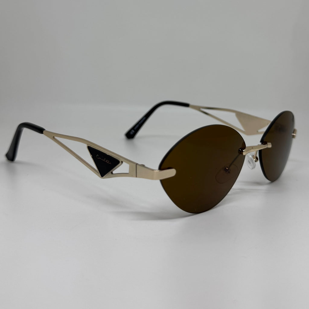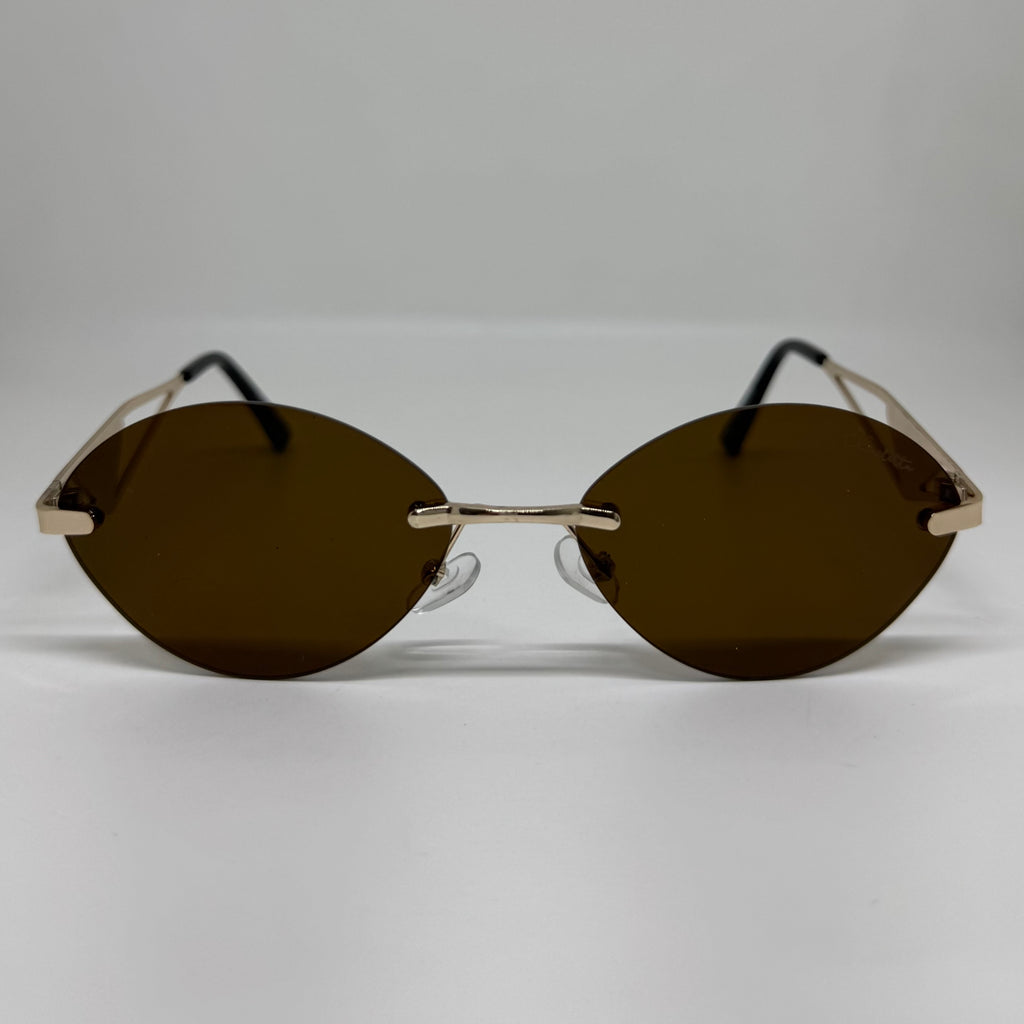 Óculos com hastes em metal dourado com lente marrom.