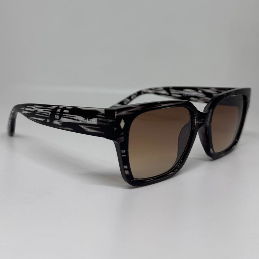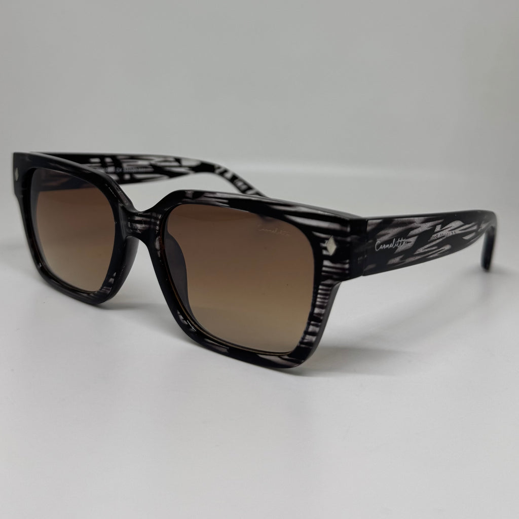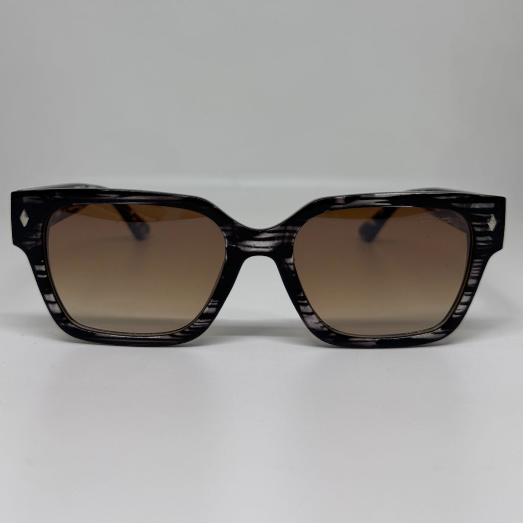 Óculos com hastes em acetato rajado com lente marrom degrade.