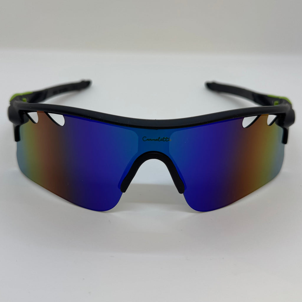 Óculos com hastes preta e emborrachado verde com lente roxa espelhada.
