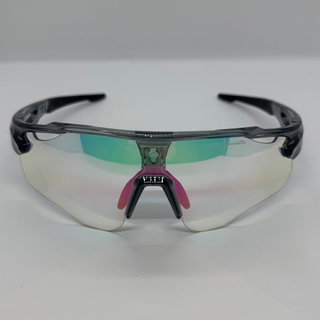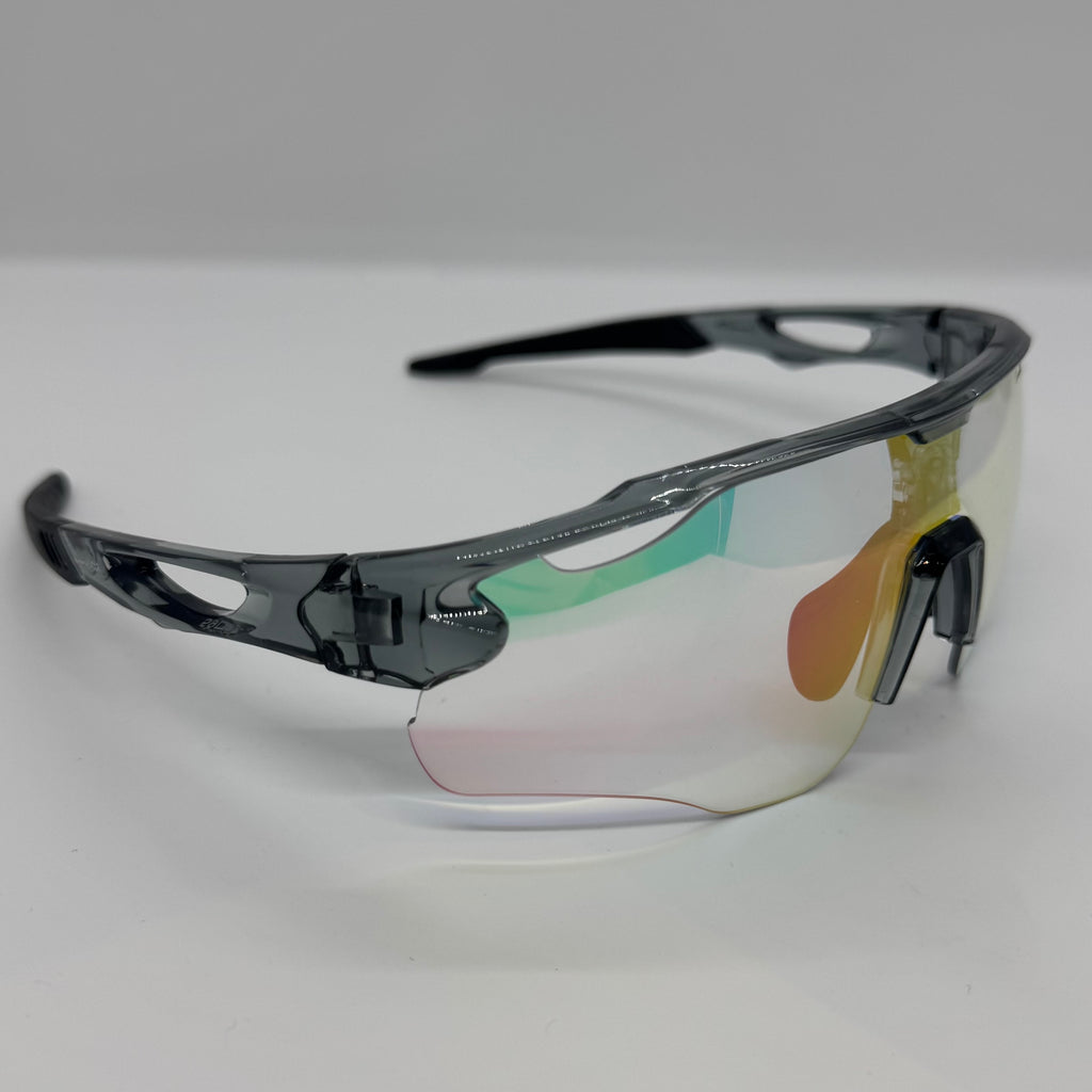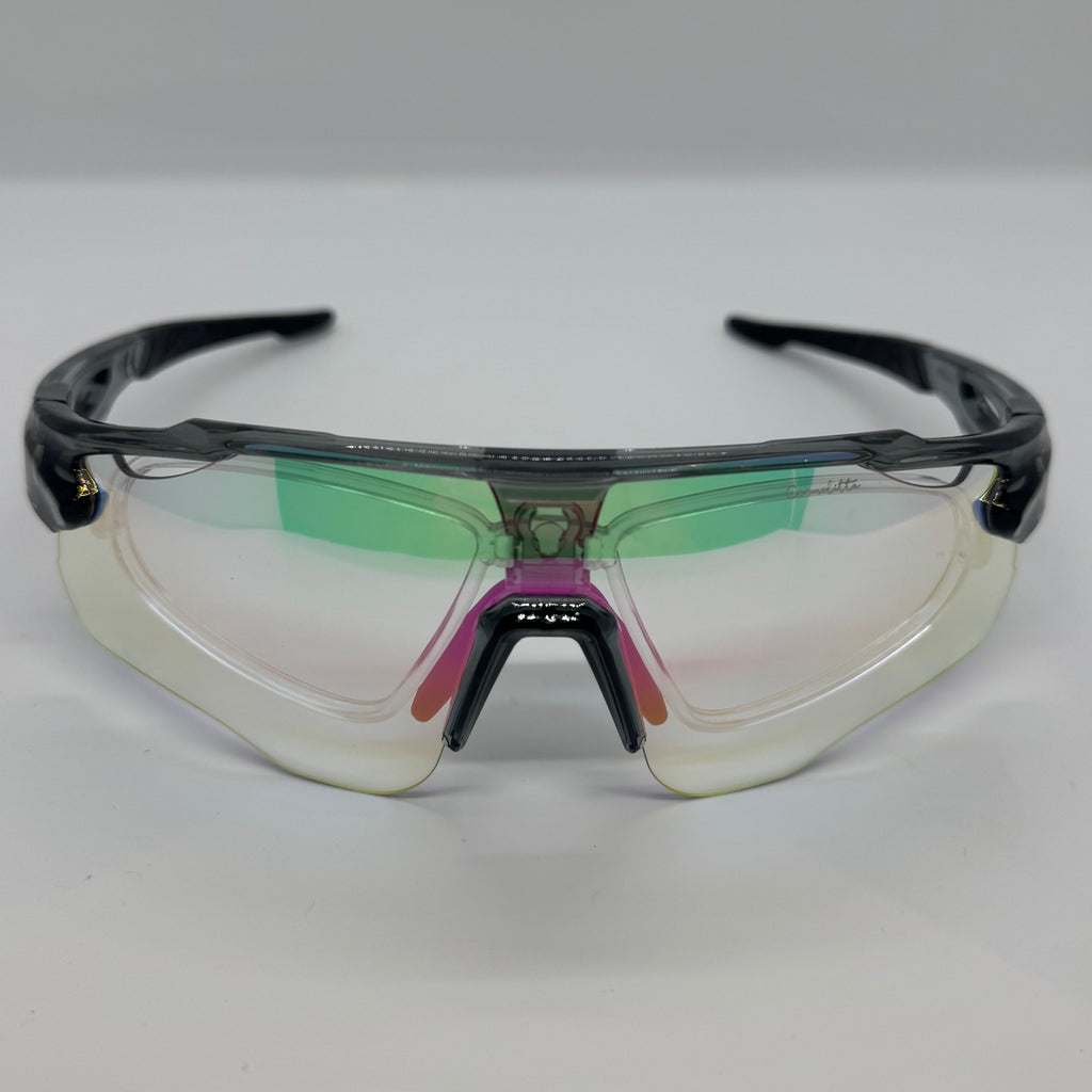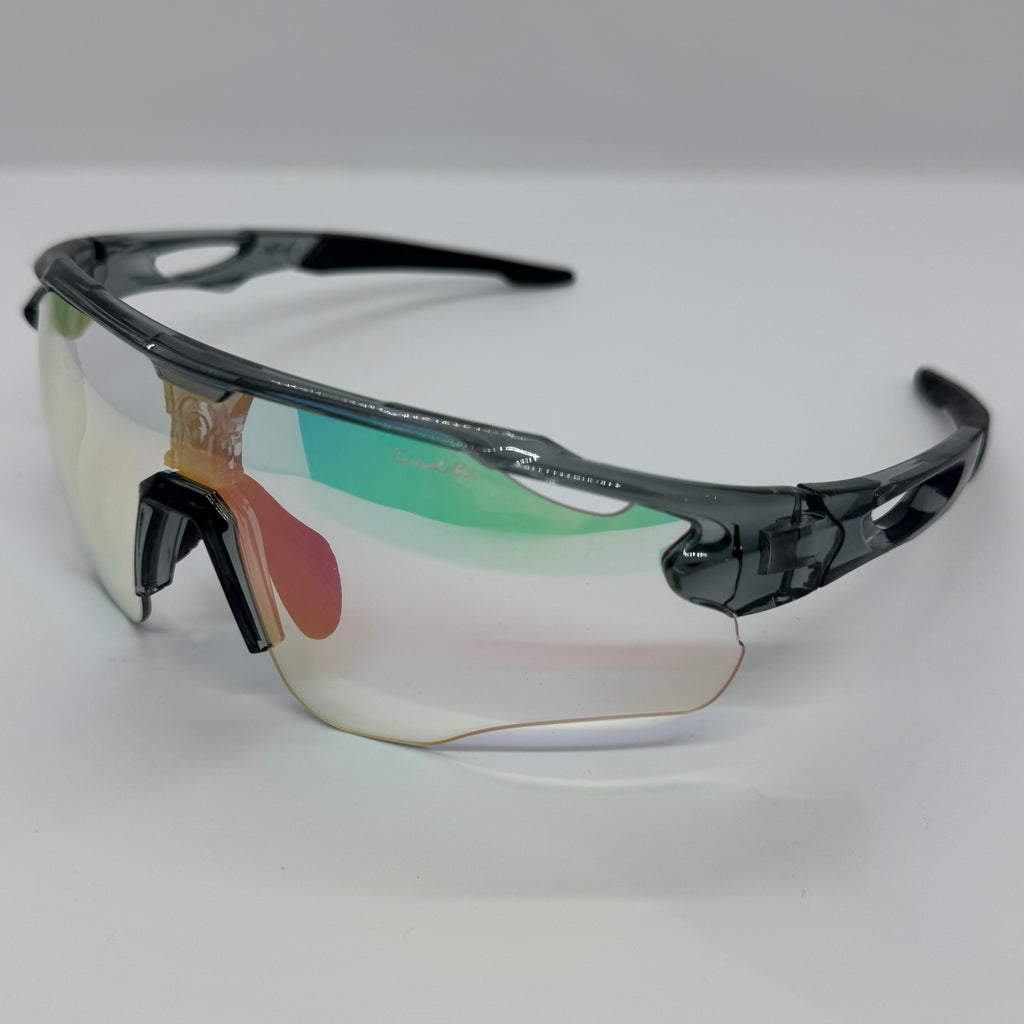 Óculos com hastes em acetato cinza com lente Transition.