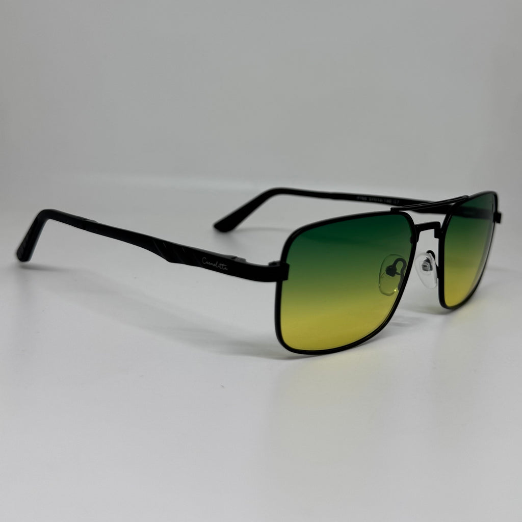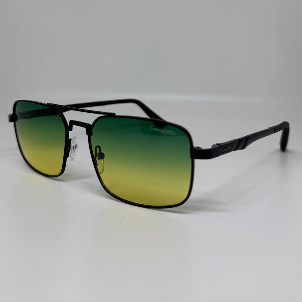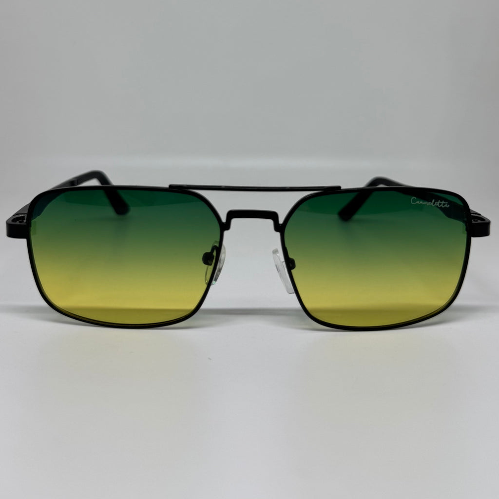 Óculos com hastes em acetato preto com lente verde degrade com amarelo.