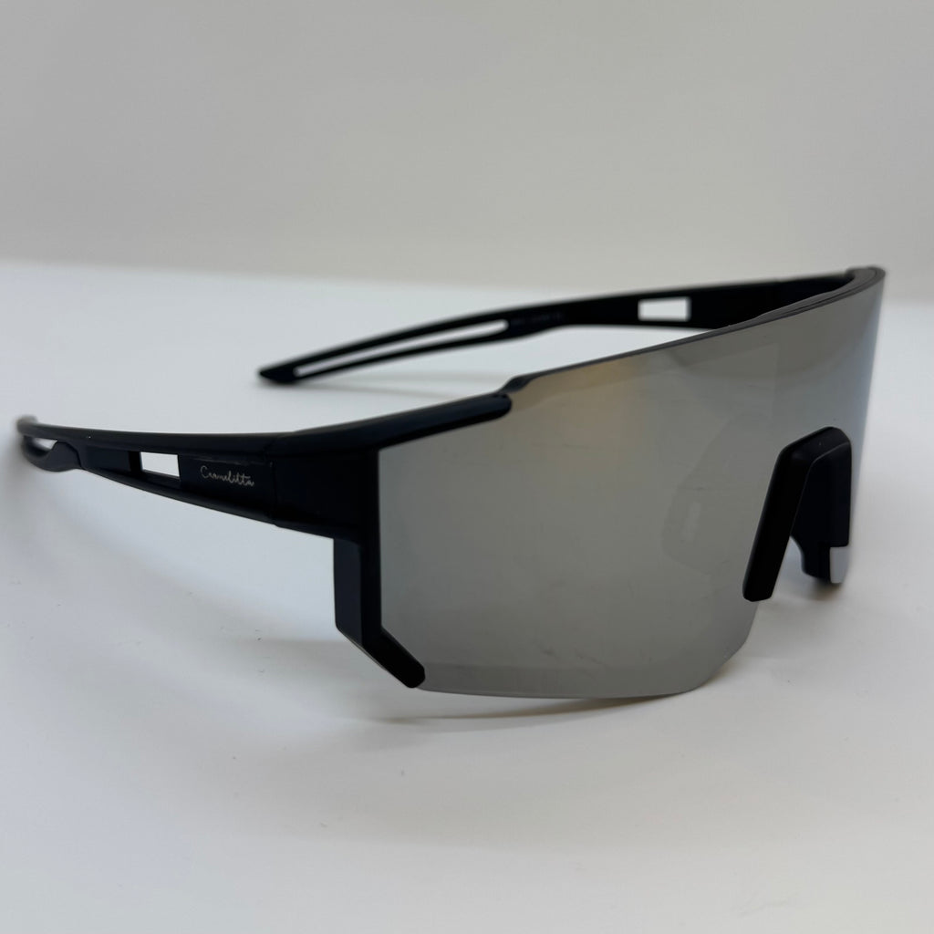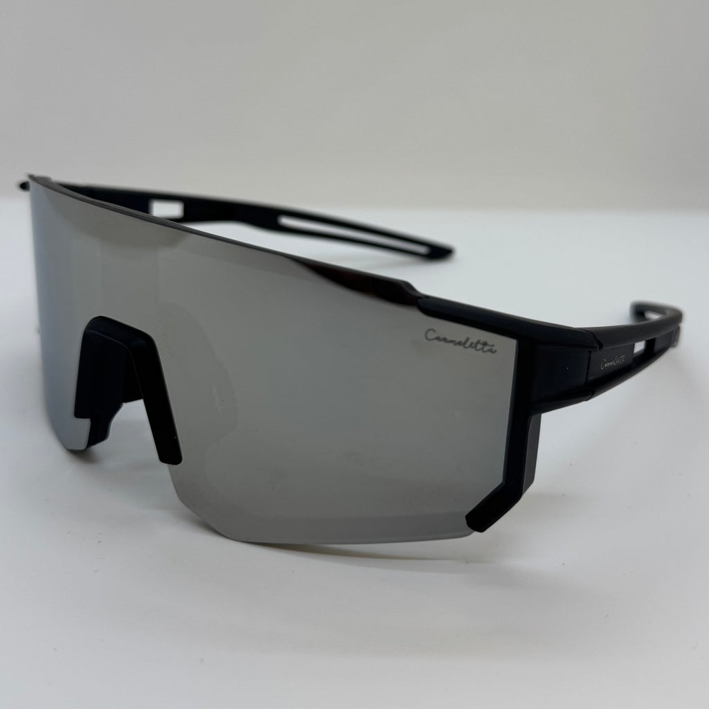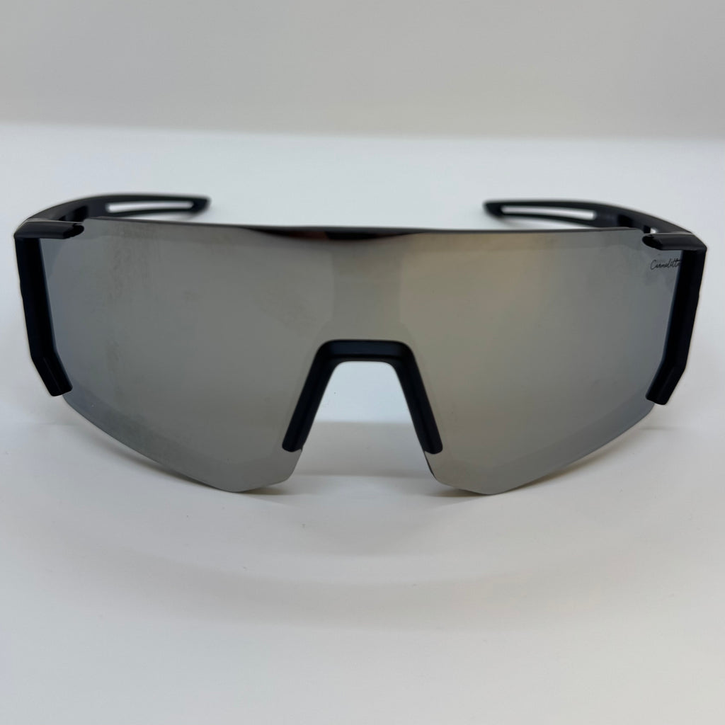 Óculos com hastes em acetato preto com lente prata espelhada.