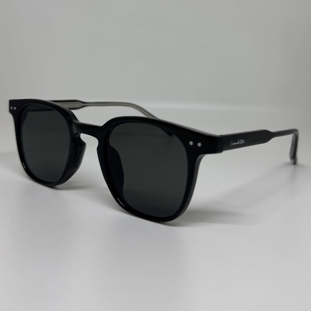 Óculos com hastes em acetato preto com lente preta.