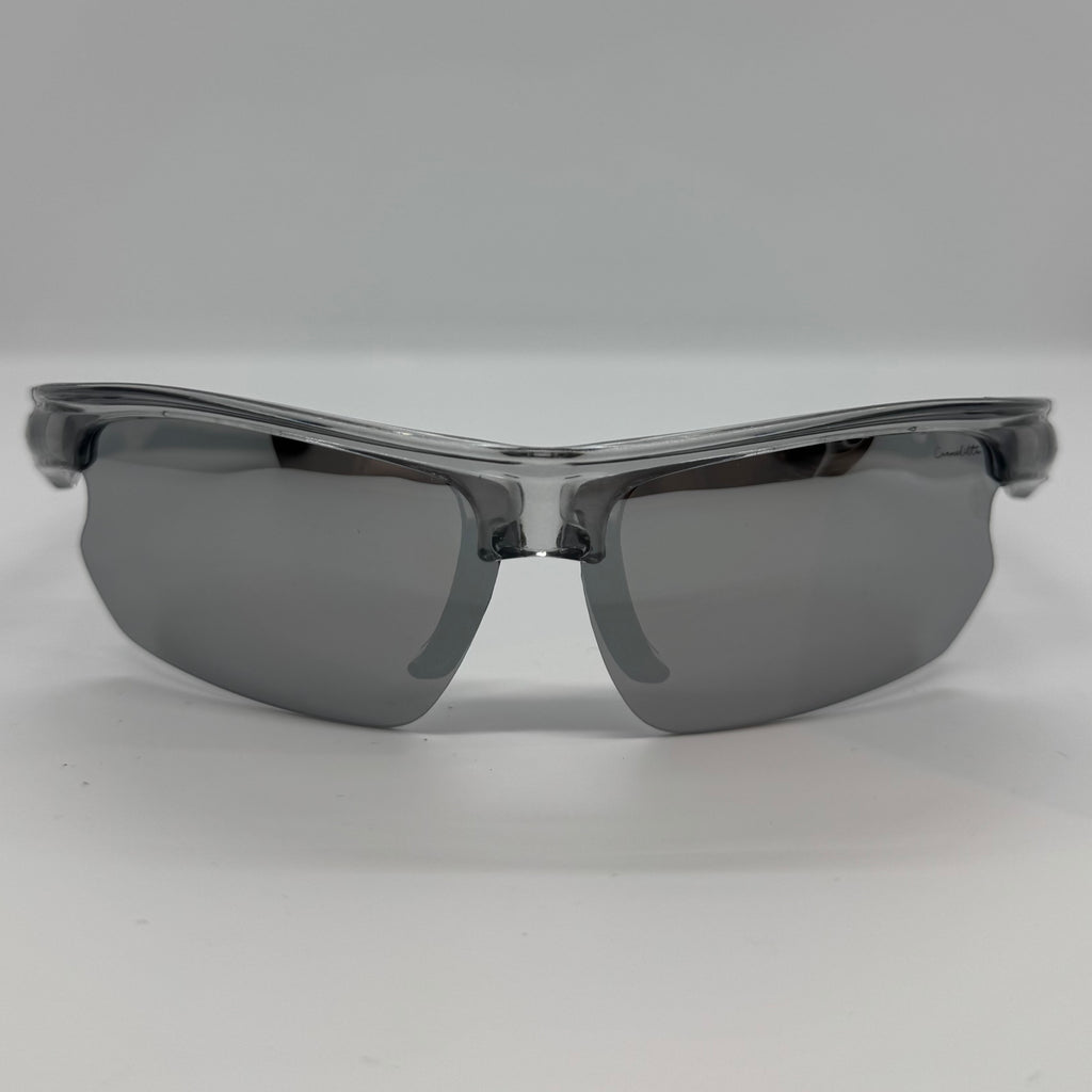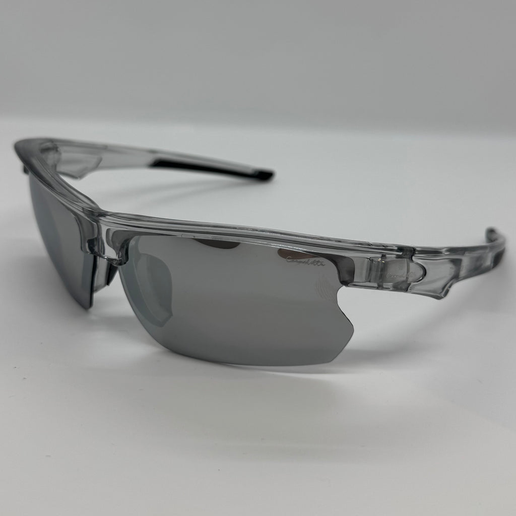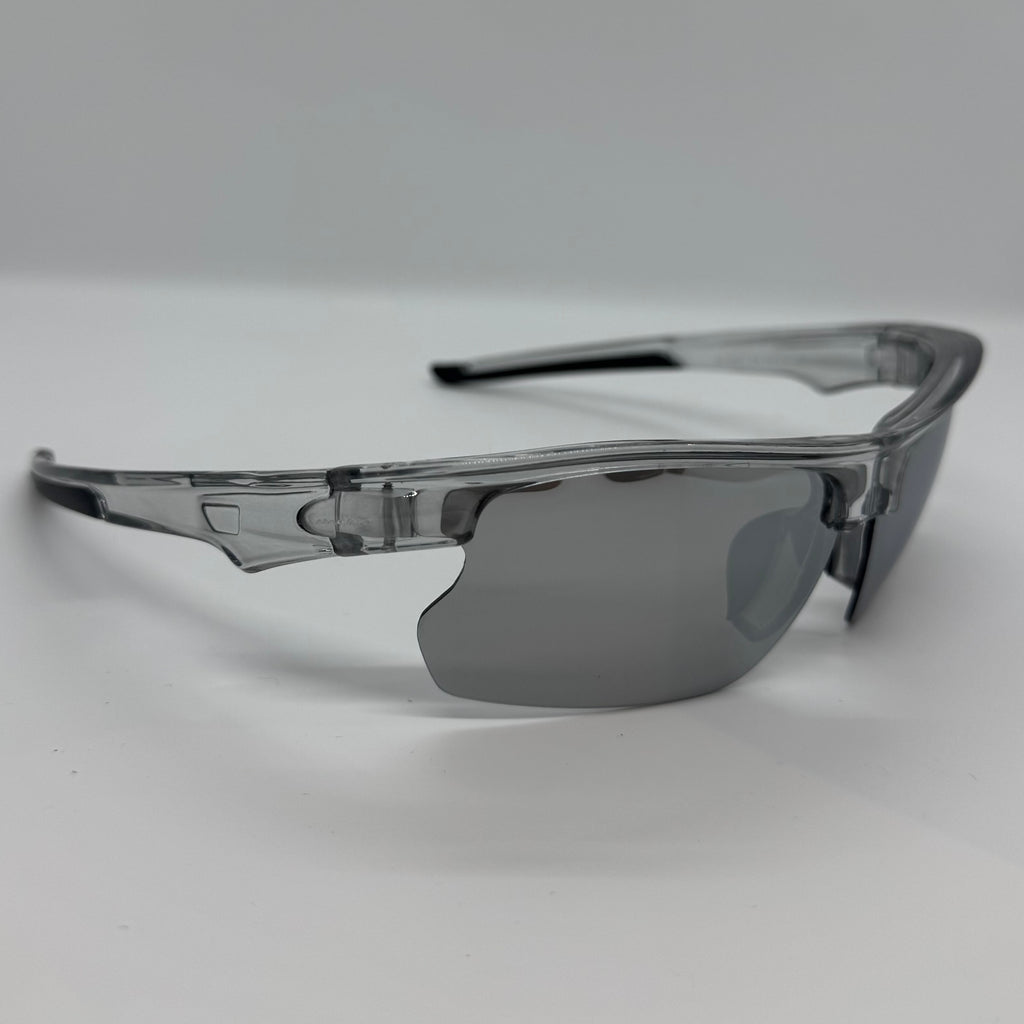 Óculos com hastes em acetato cinza translúcido com lente prata.