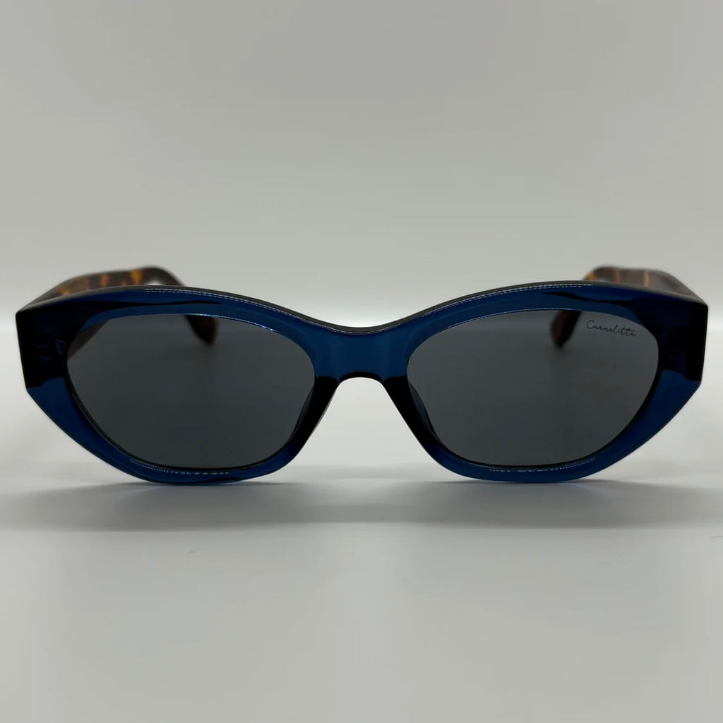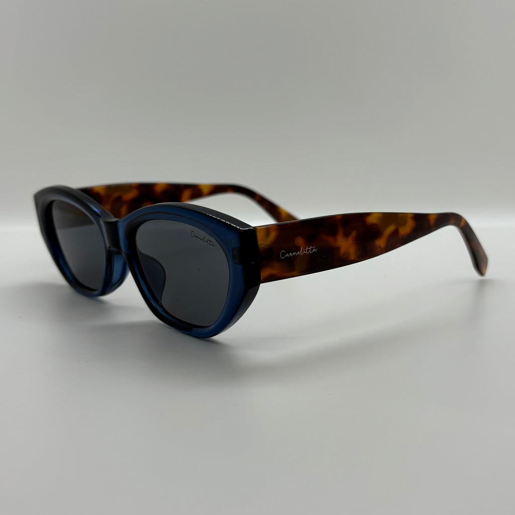 óculos com armação azul translúcido em acetato, hastes em tartaruga marrom e lentes em preto fumê escuro.