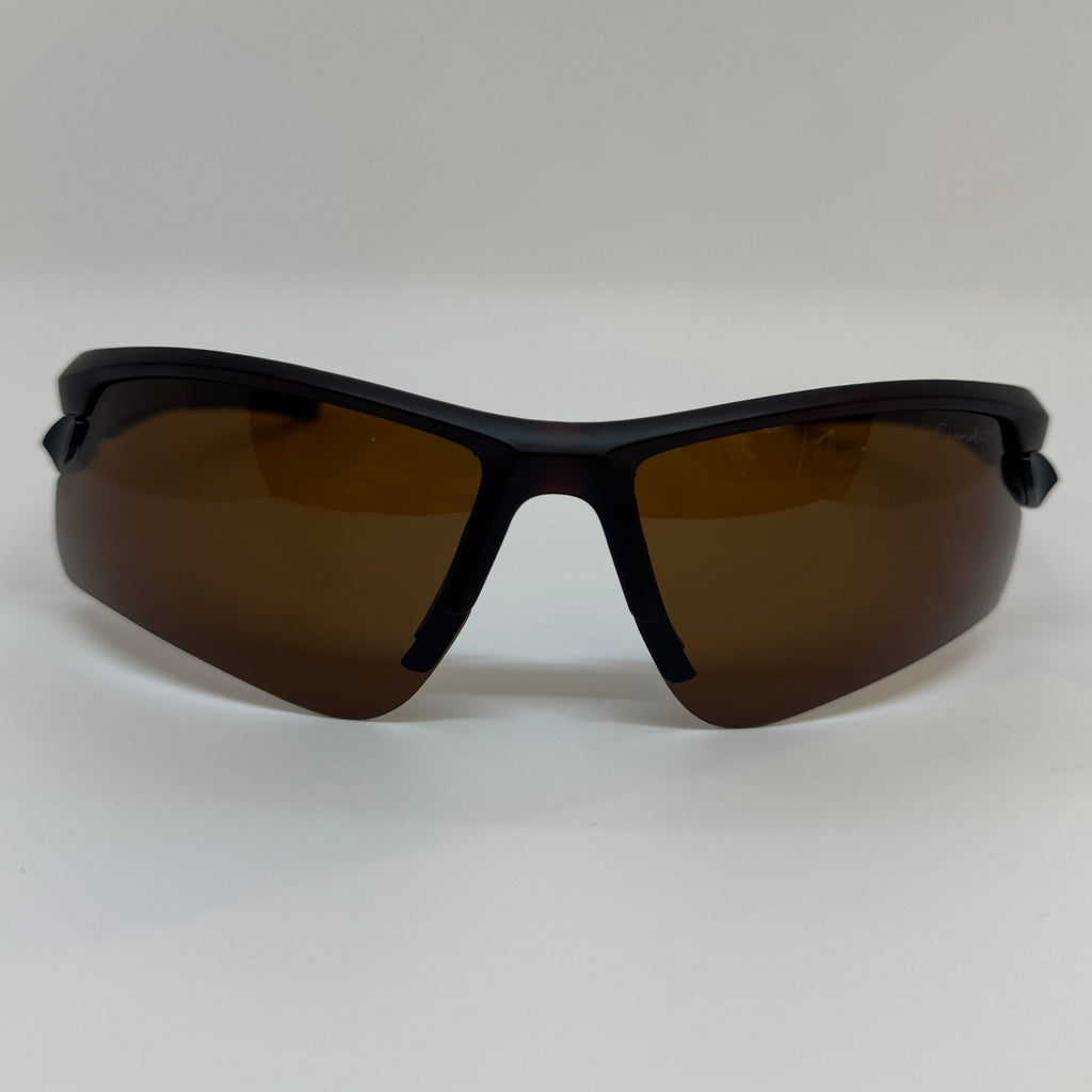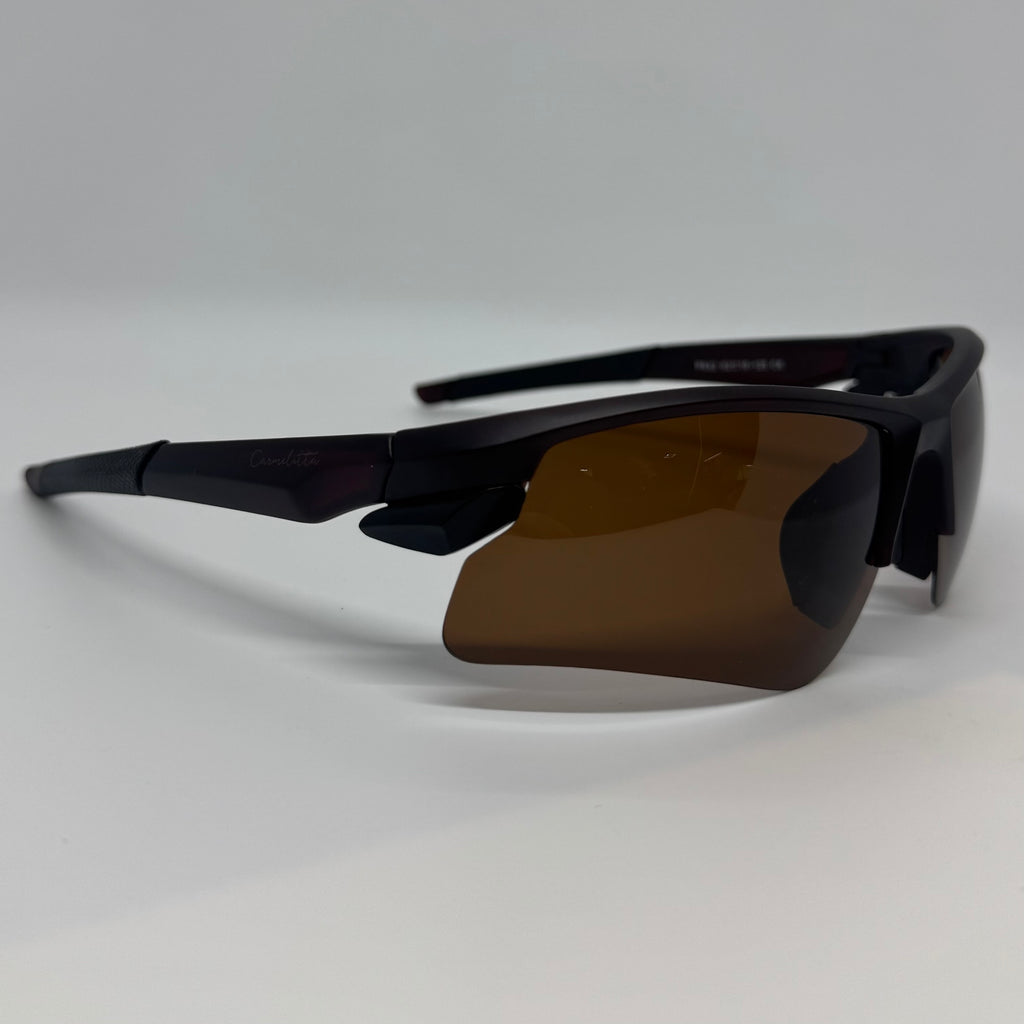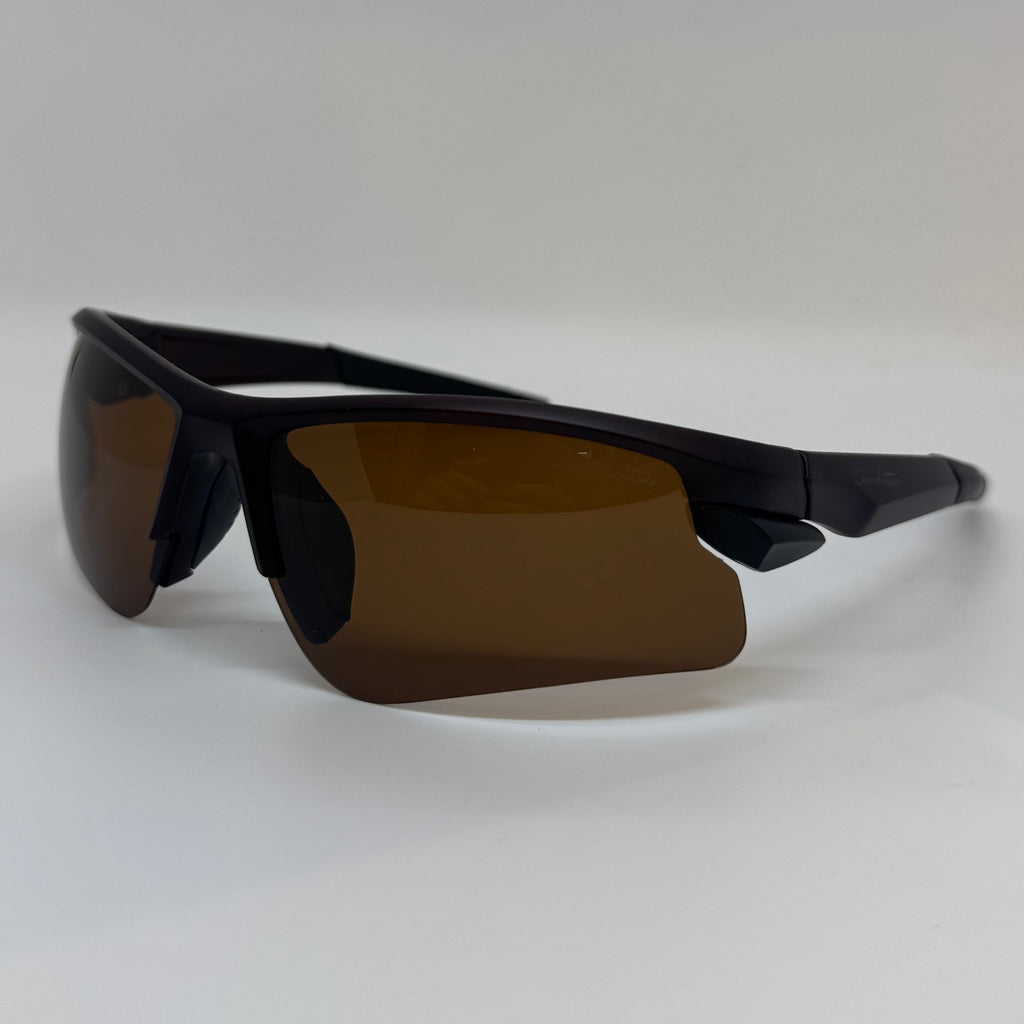 Óculos com hastes em acetato marrom com lente marrom polarizada.