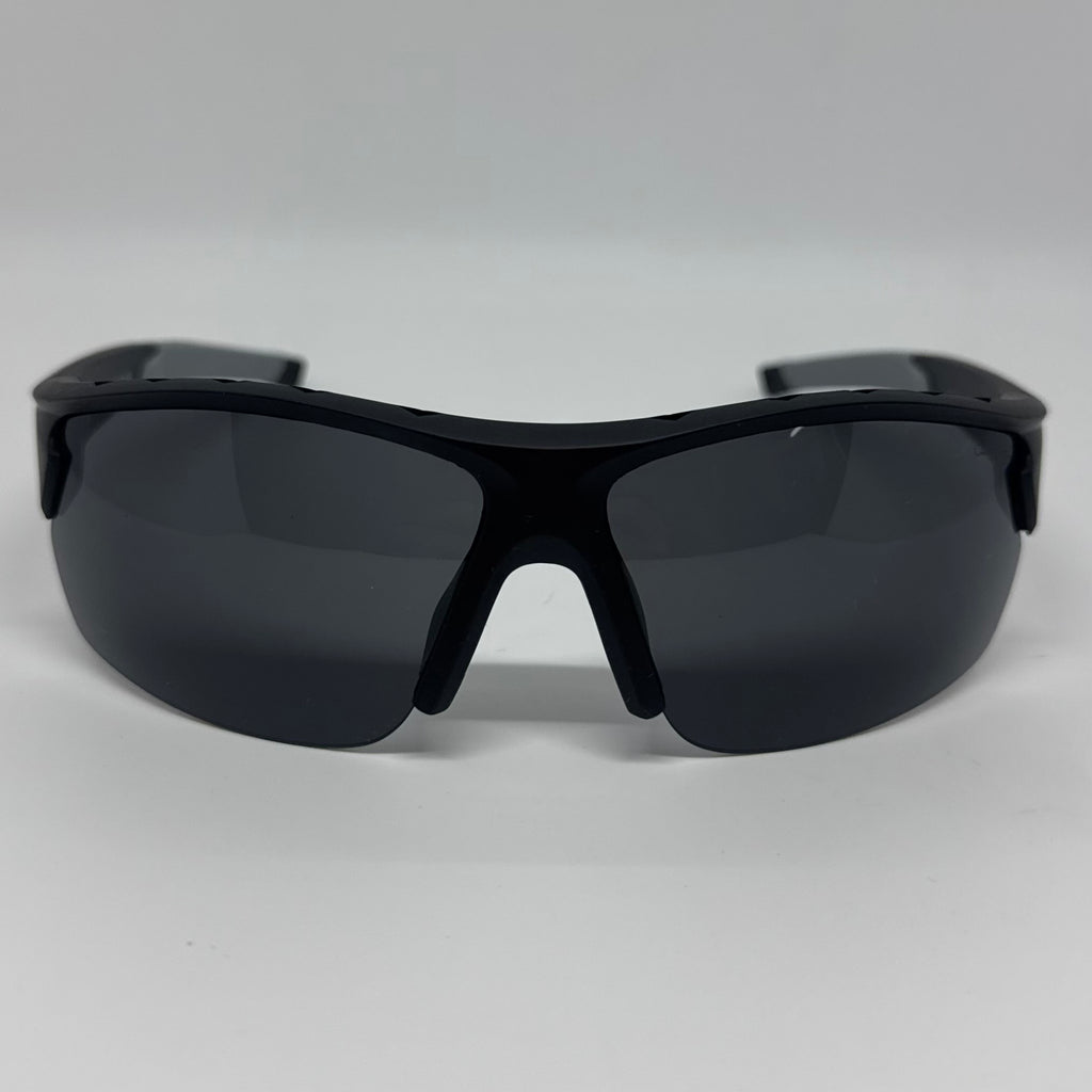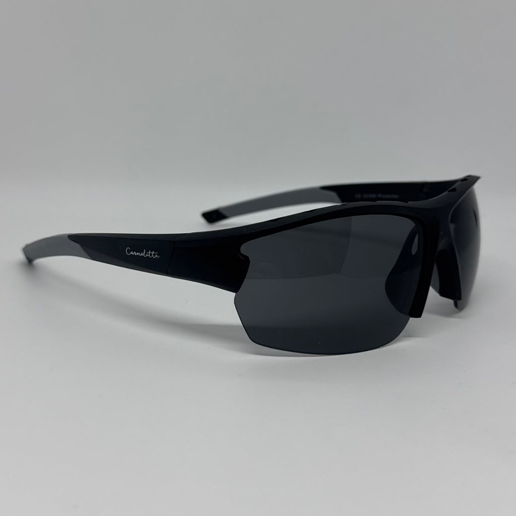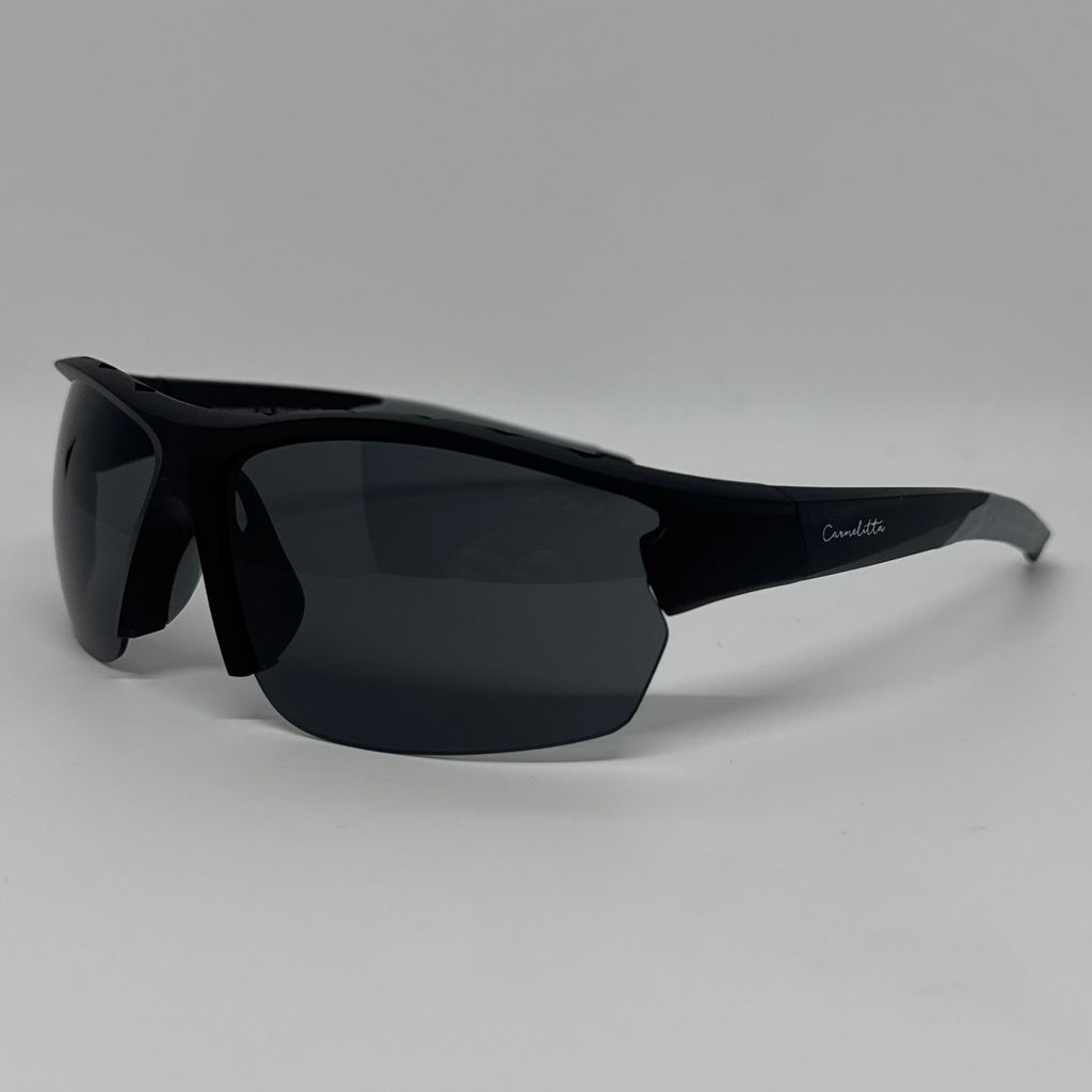 Óculos com hastes e acetato preto e borracha cinza com lente preta polarizada.