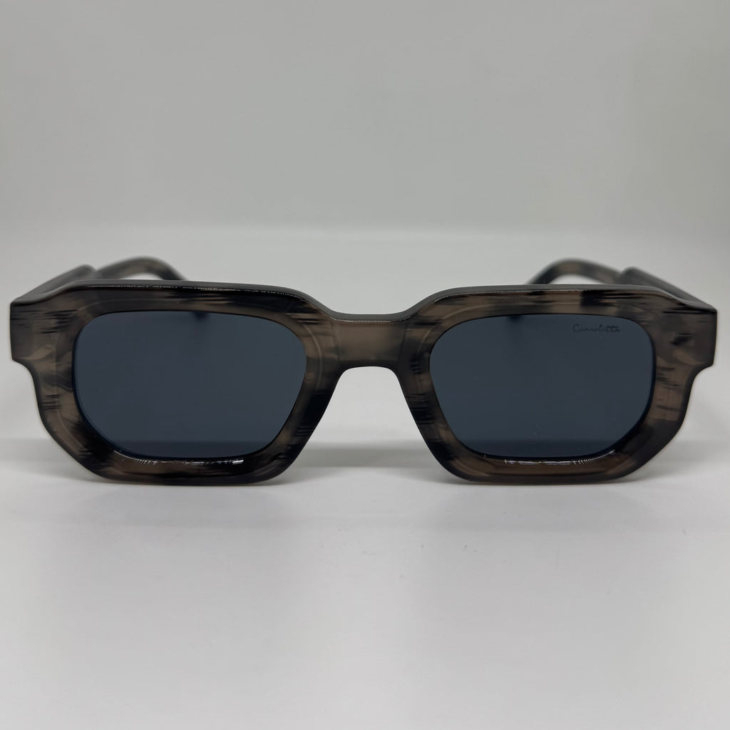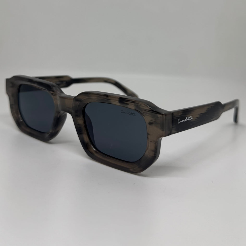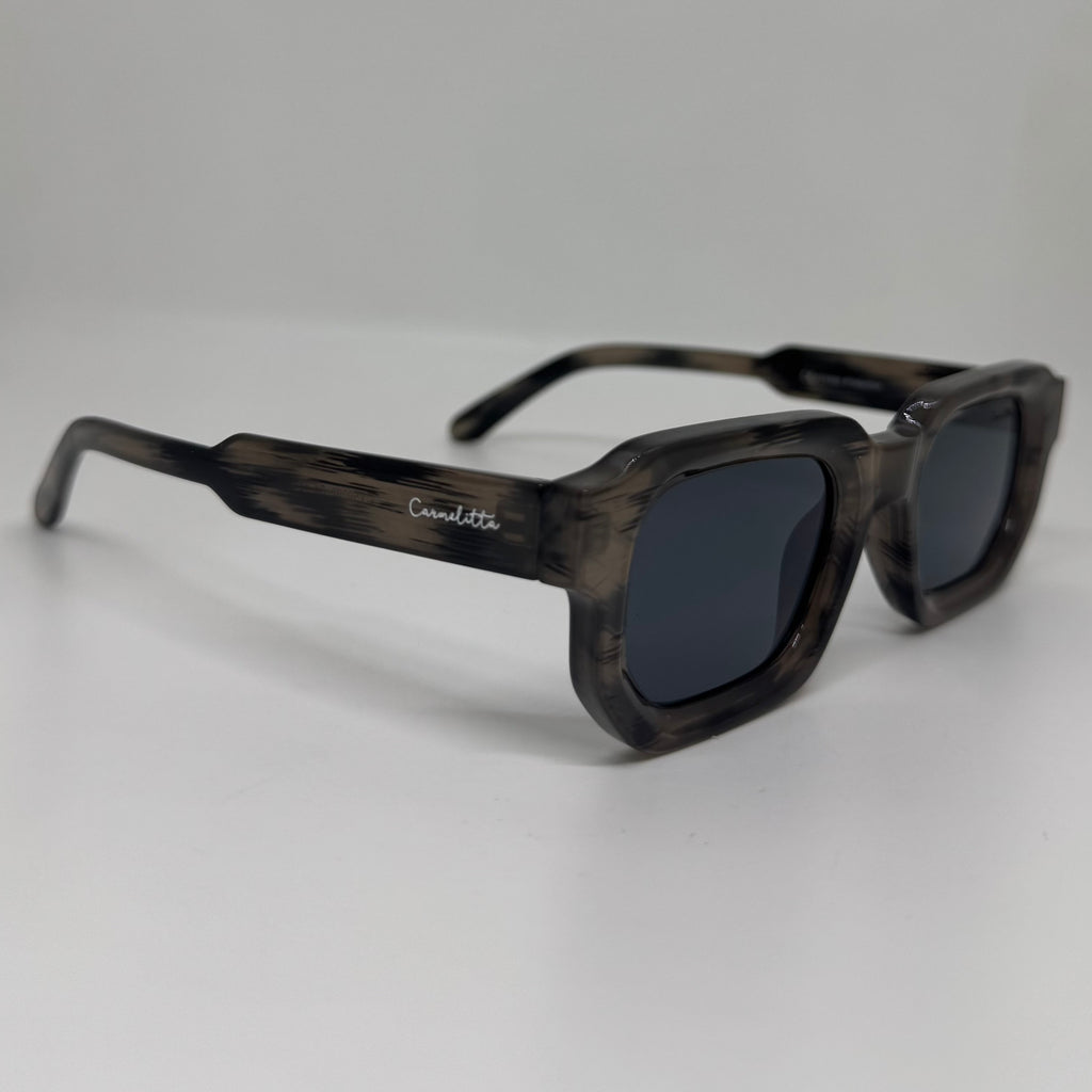 Óculos com hastes em acetato mesclado cinza com lente preta.